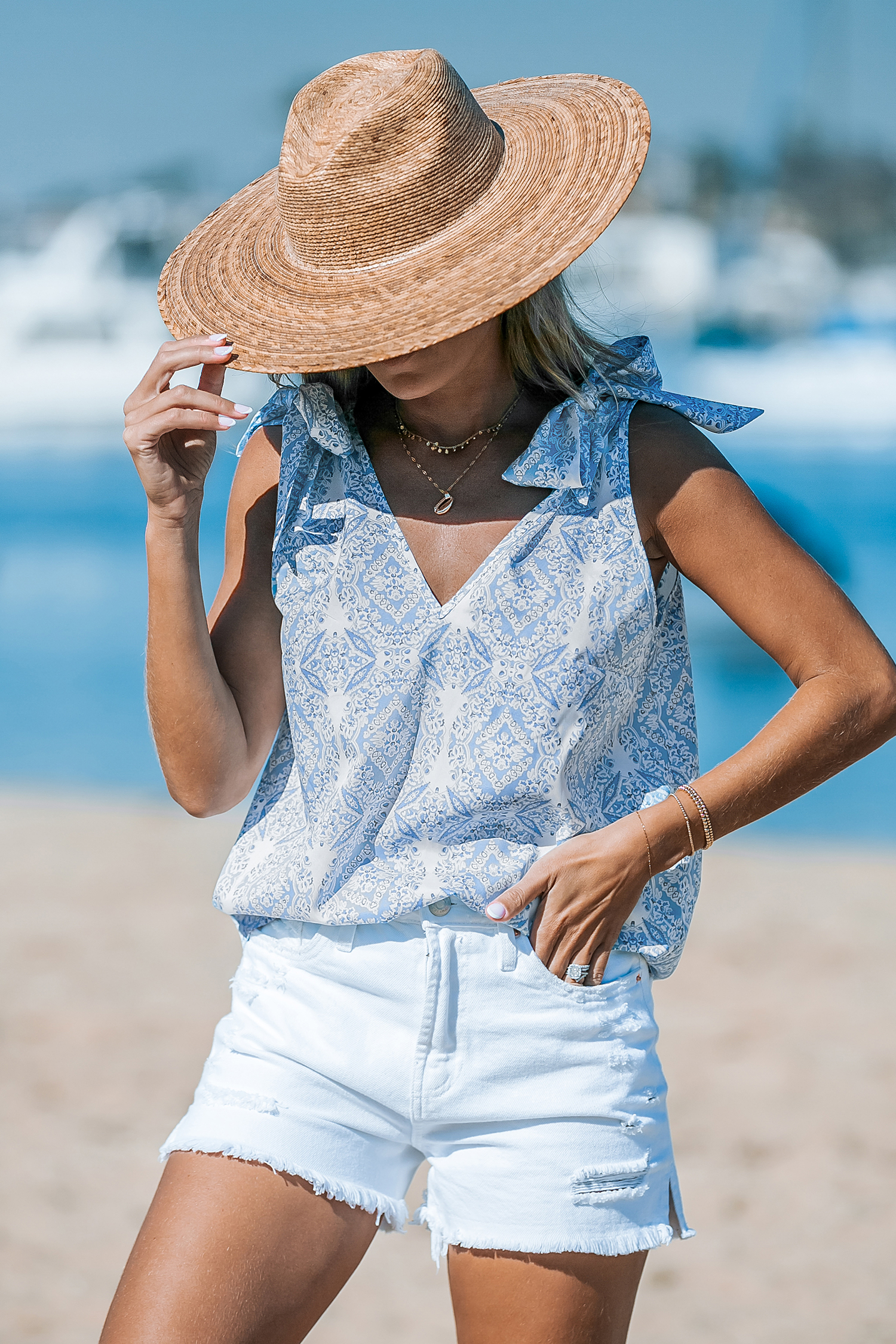 Top bohemio con hombros anudados en azul bebé y blanco