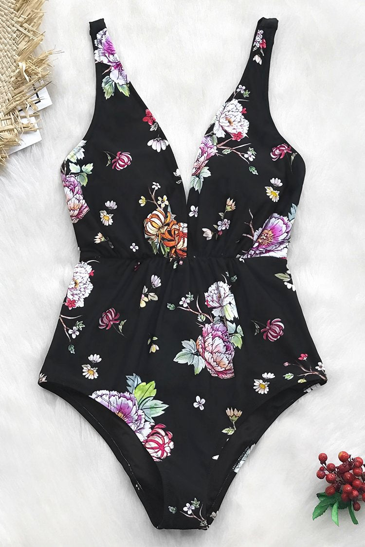 Traje de baño de una pieza con recorte envuelto y florecitas amarillas