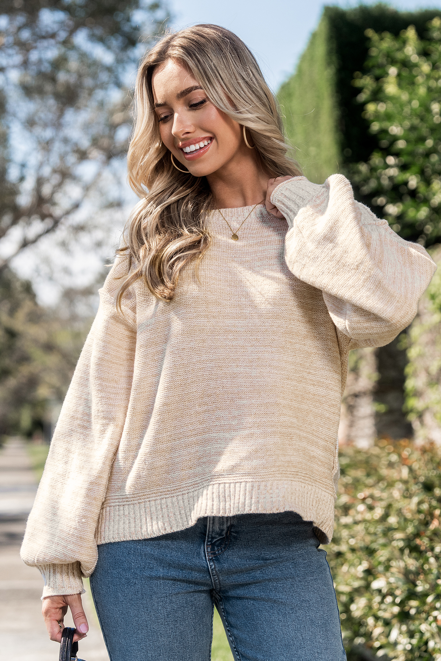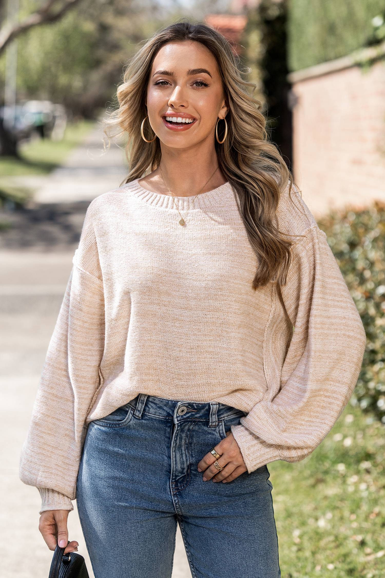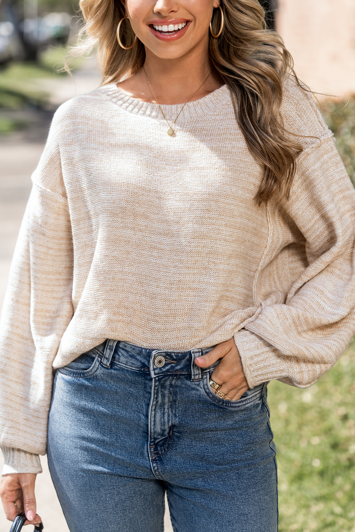 Suéter beige de cuello redondo y manga larga con costuras expuestas