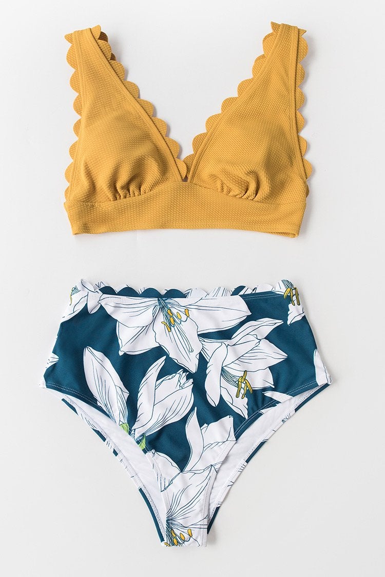 Bikini Amarillo y Floral Cuello V Festoneado