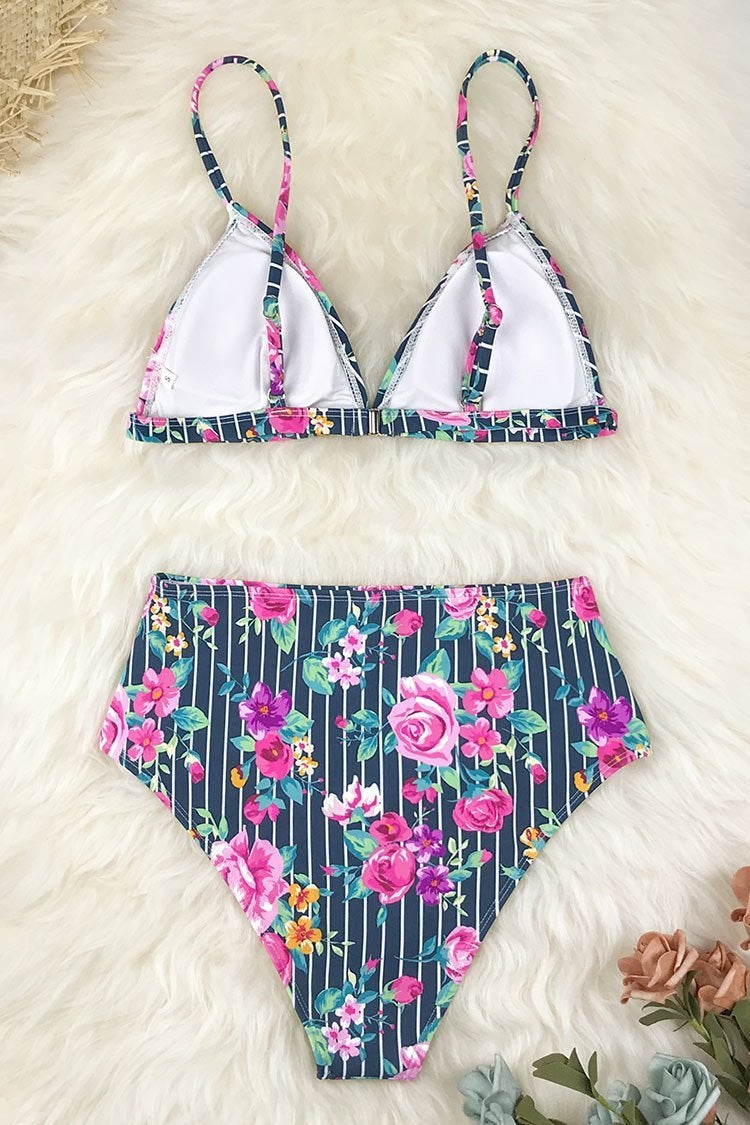 Bikini Cintura Alta con Estampado Floral y Rayas
