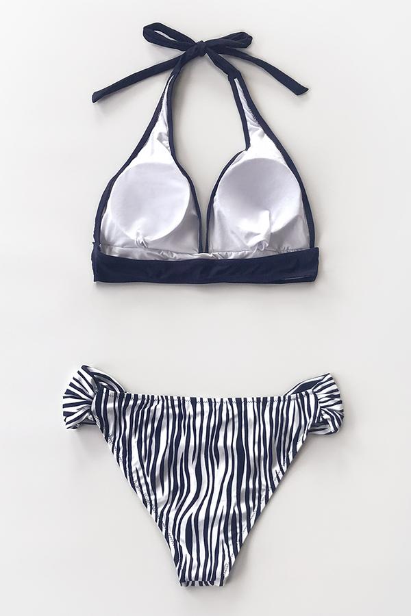 Bikini con V-escote sin mangas liso y a rayas azul marino