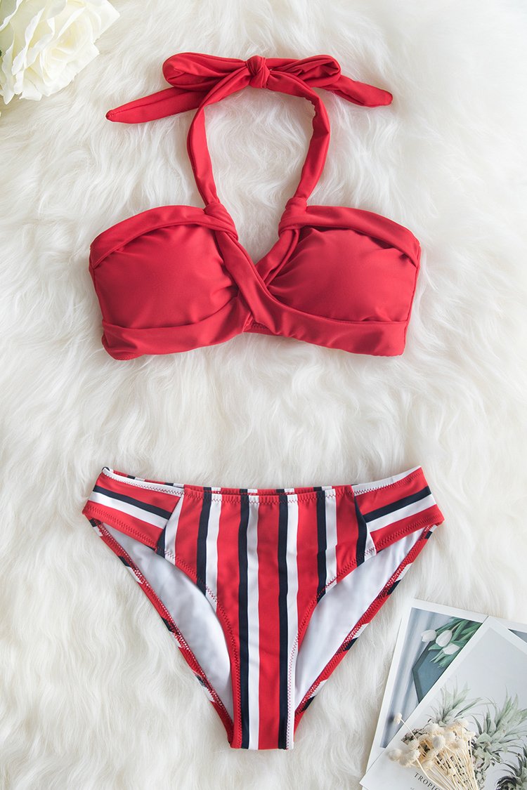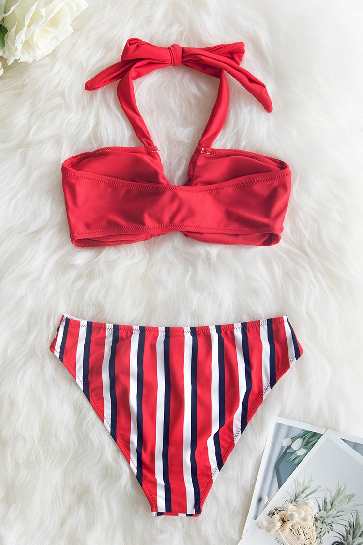 InicioBikini Halter Rojo Con Fondo Estampado De Rayas