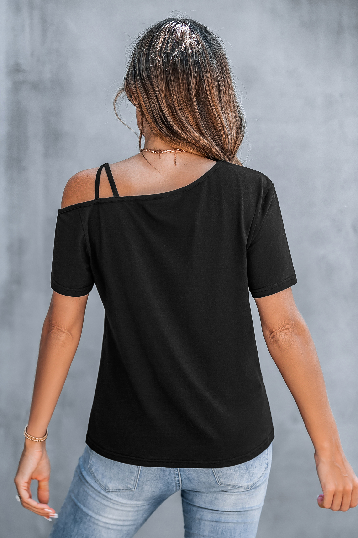 Camiseta negra con corte asimétrico y hombros retorcidos