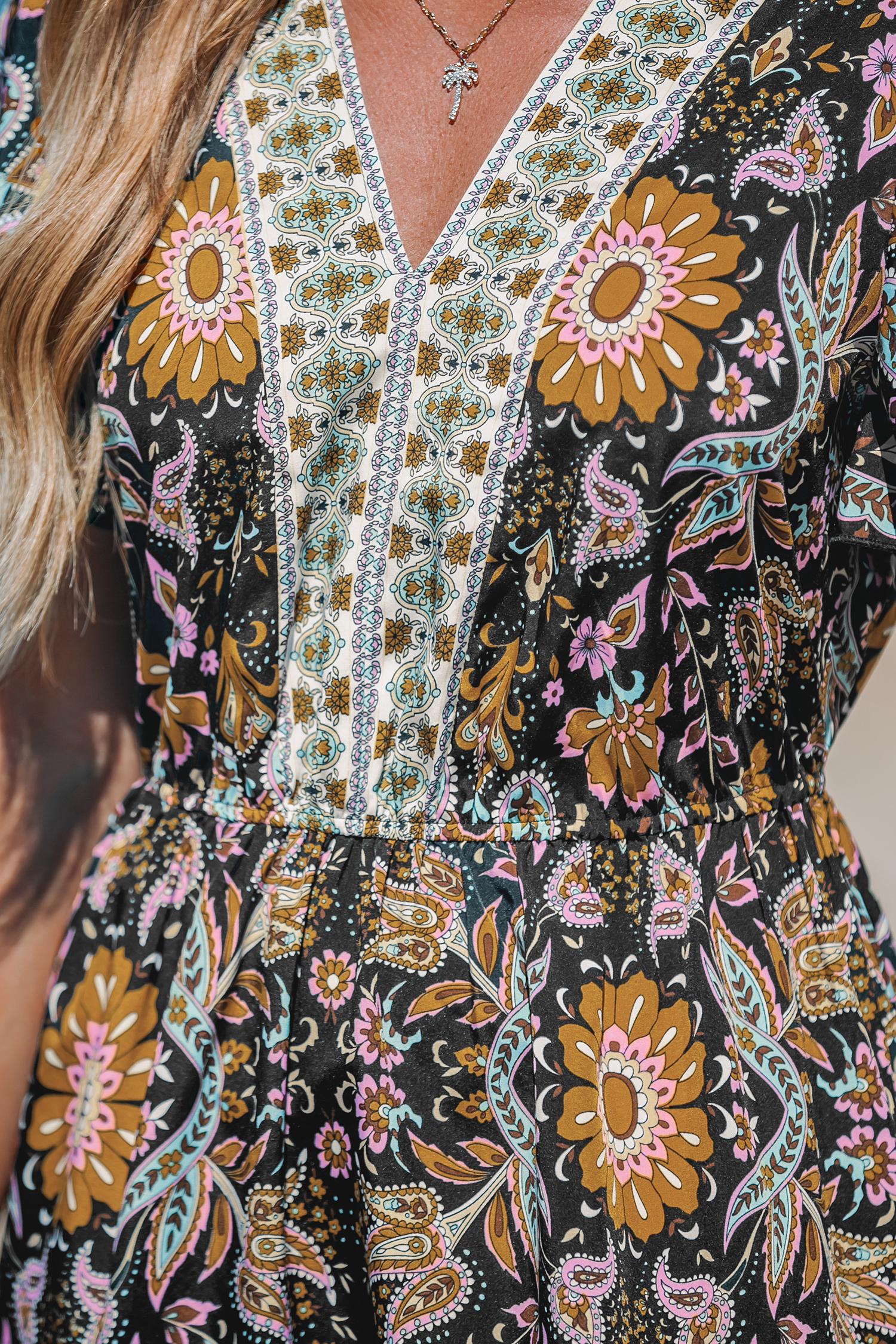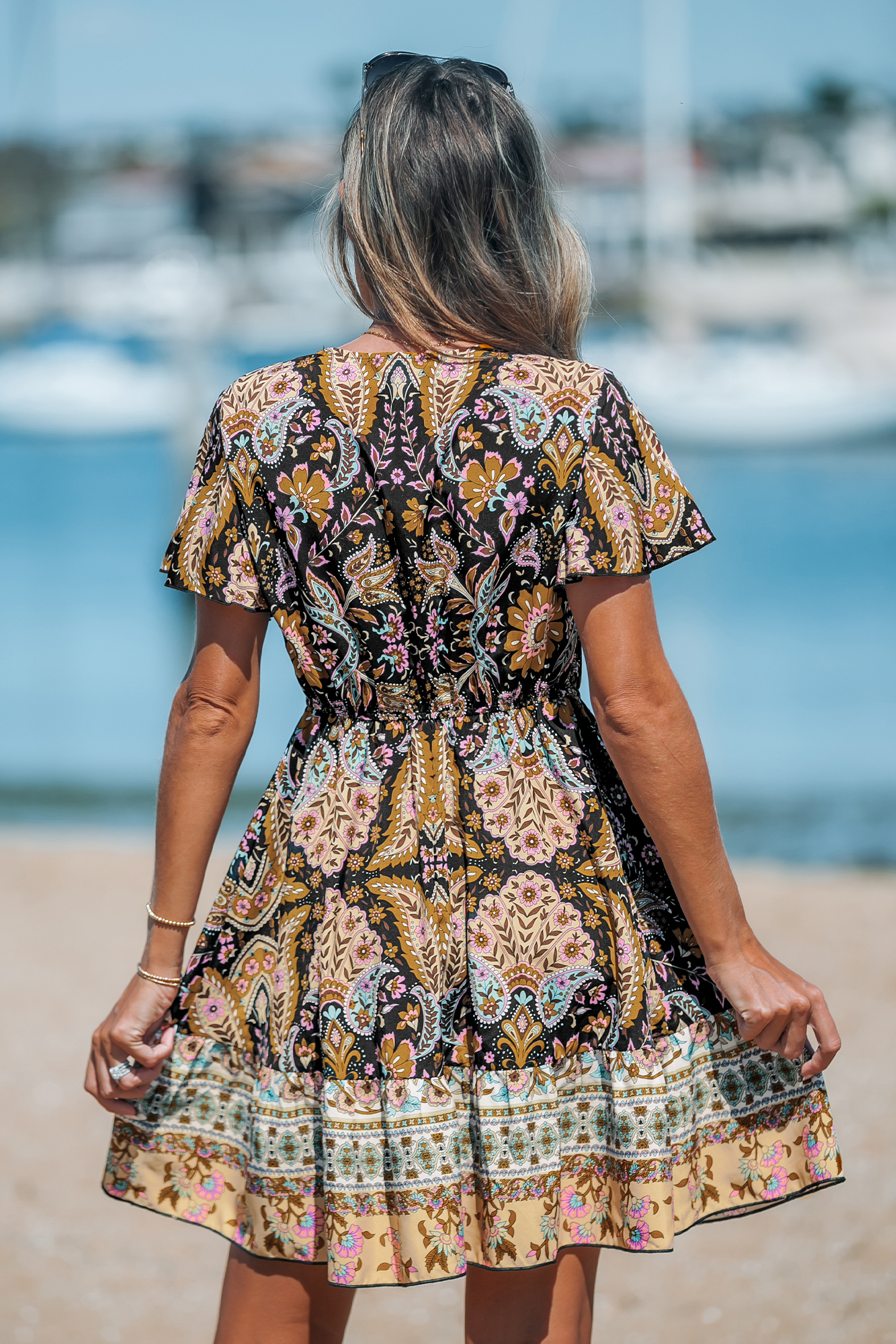 Minivestido bohemio negro con cuello en V y manga acampanada