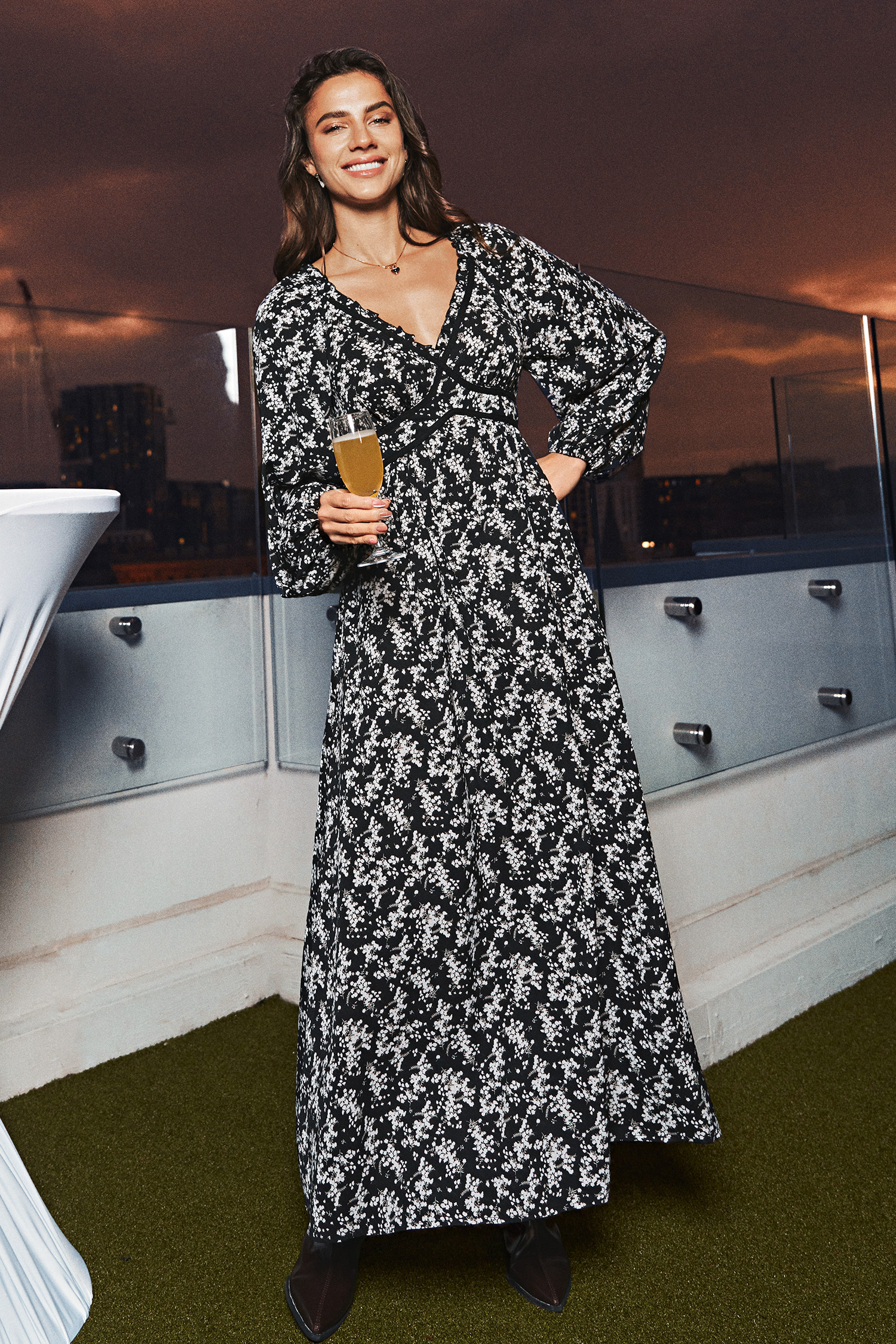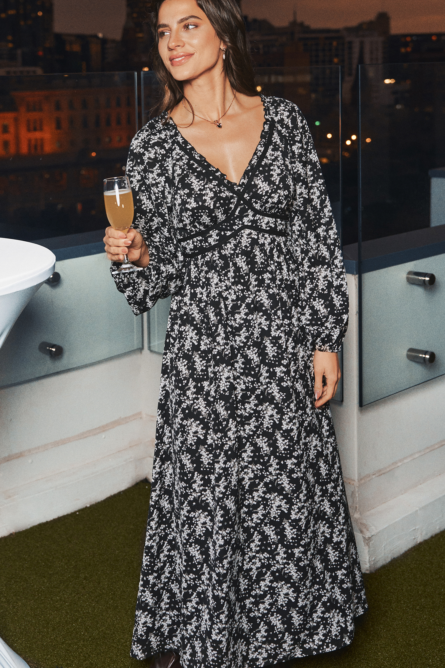 Vestido largo con escote en V y mangas abullonadas en color negro