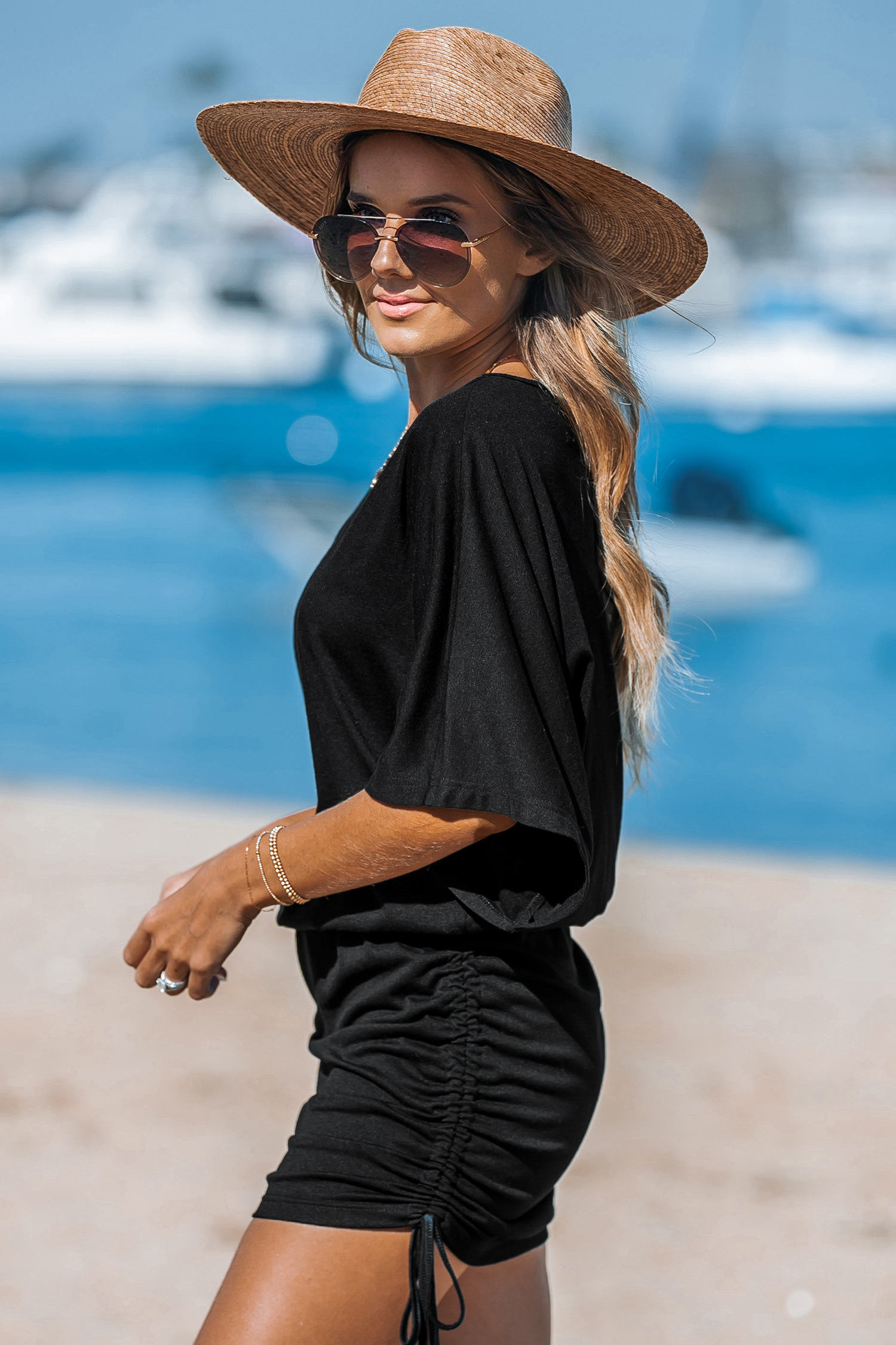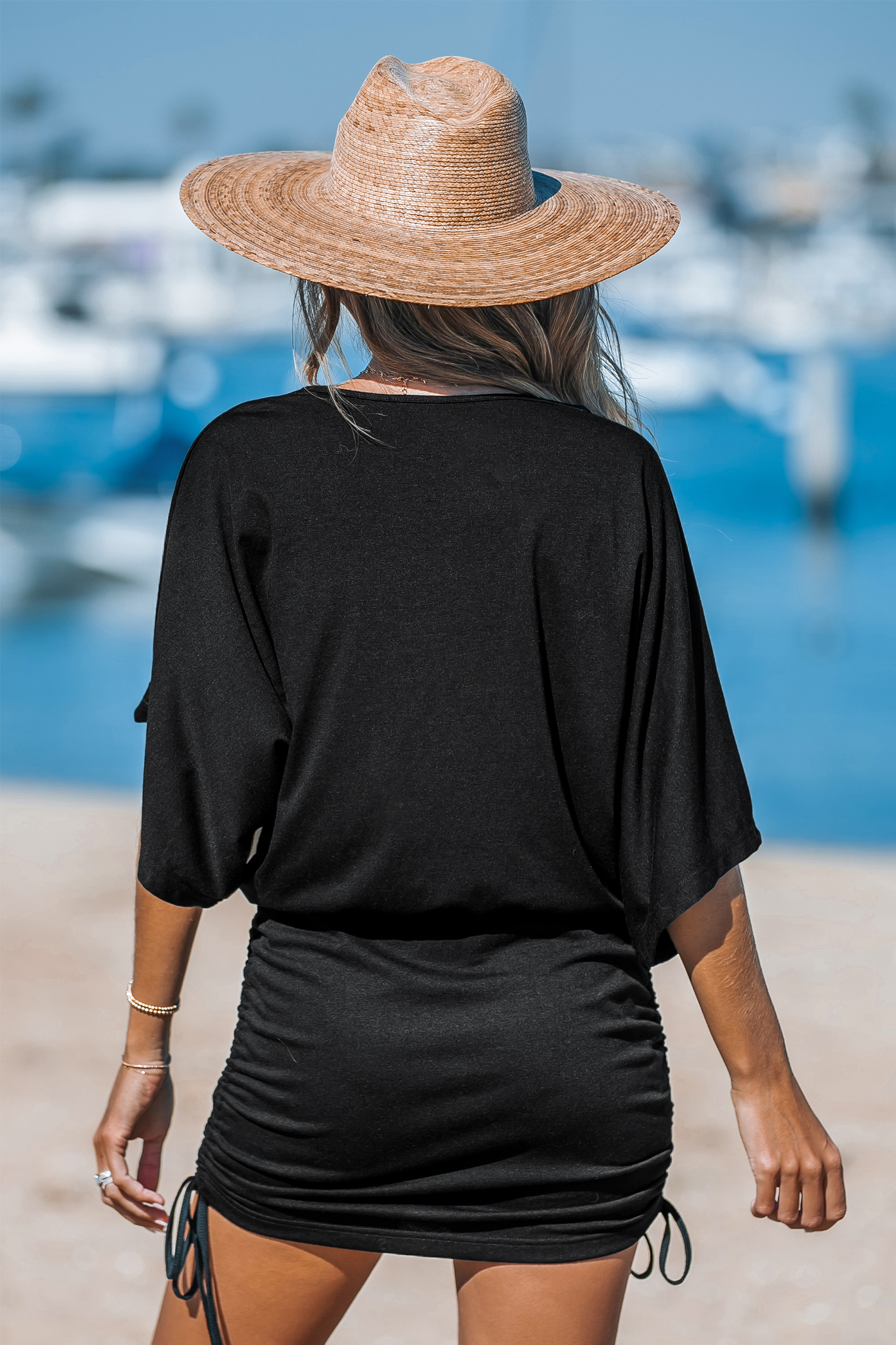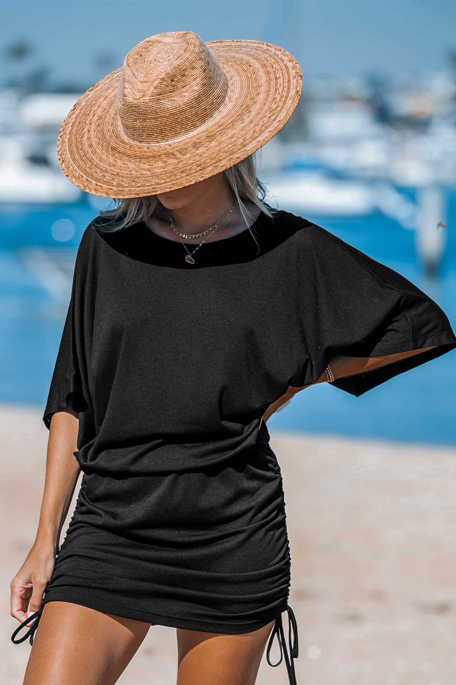 Minivestido de punto negro con manga dolman y lazo lateral