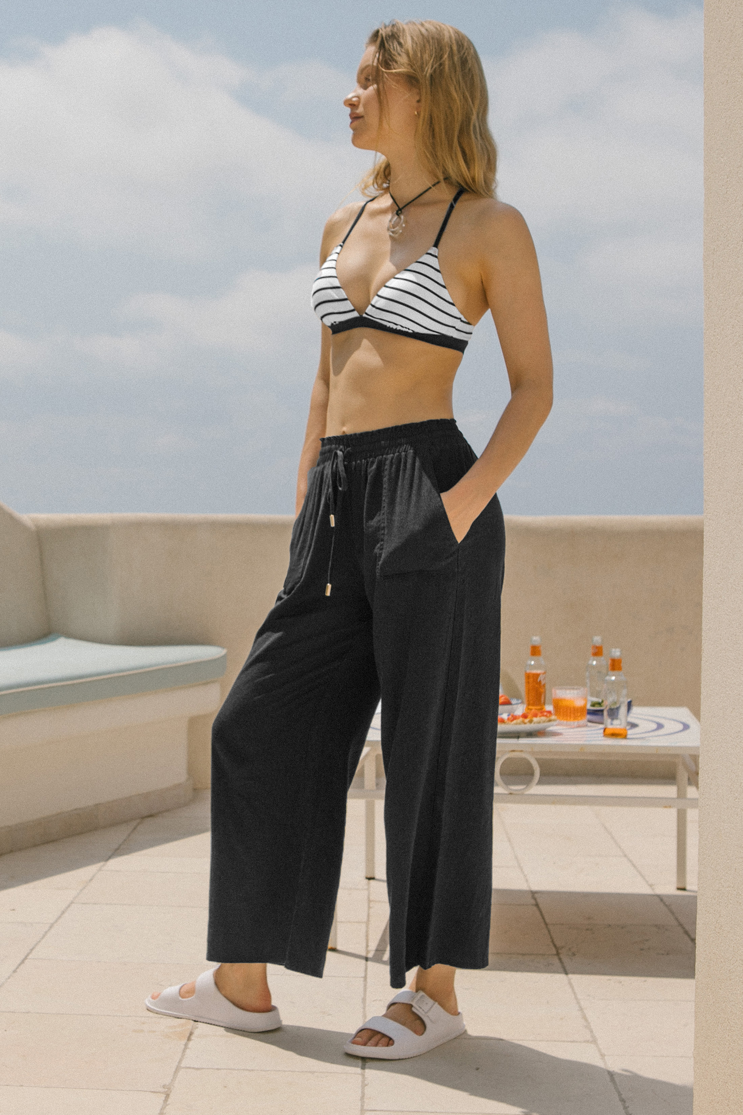 Pantalones tipo pareo de pierna recta con cintura elástica negros
