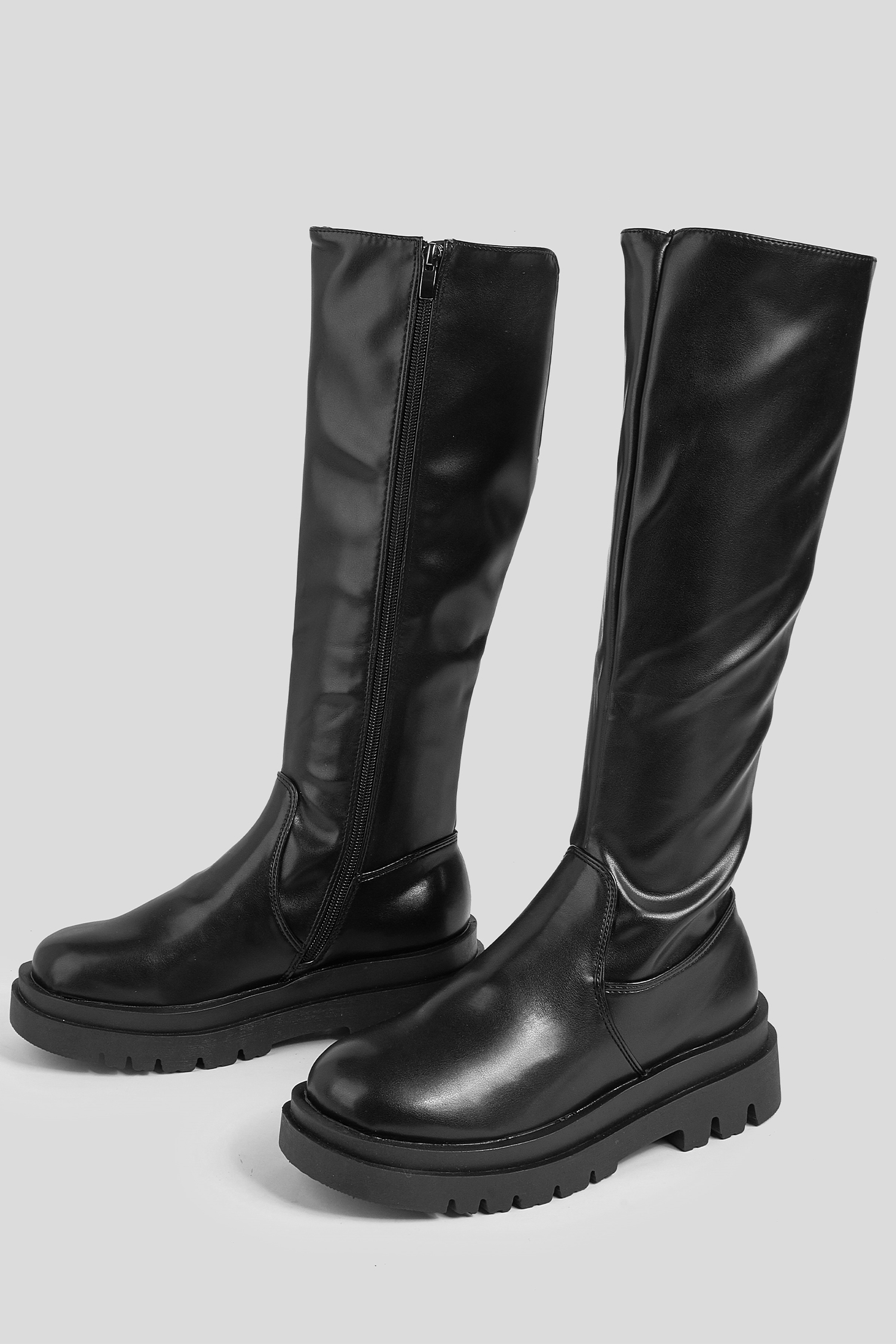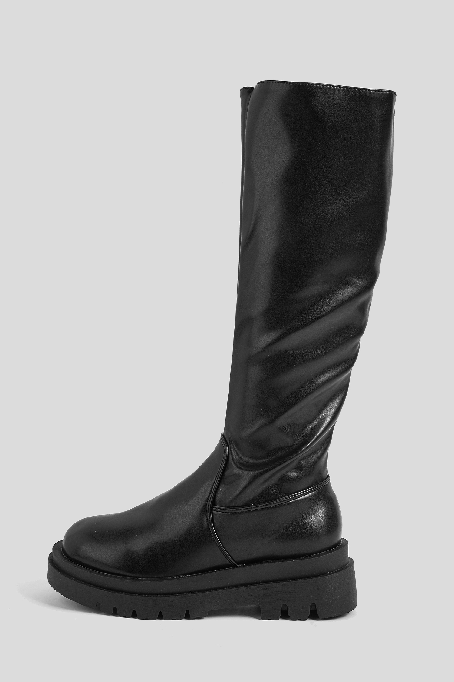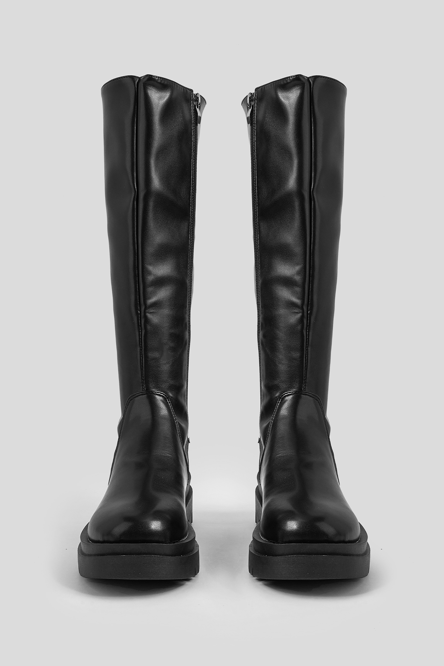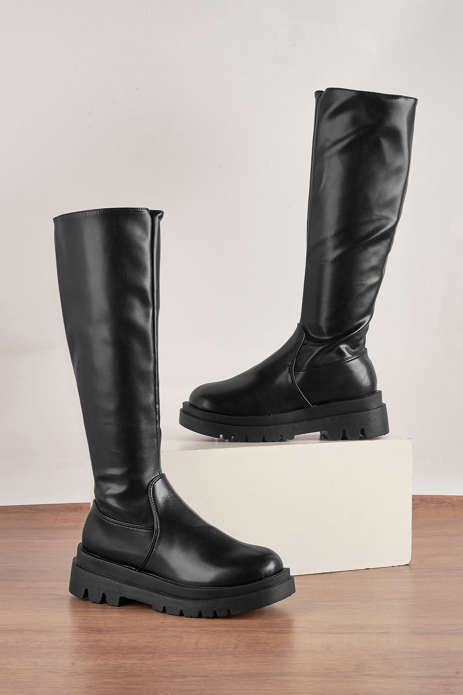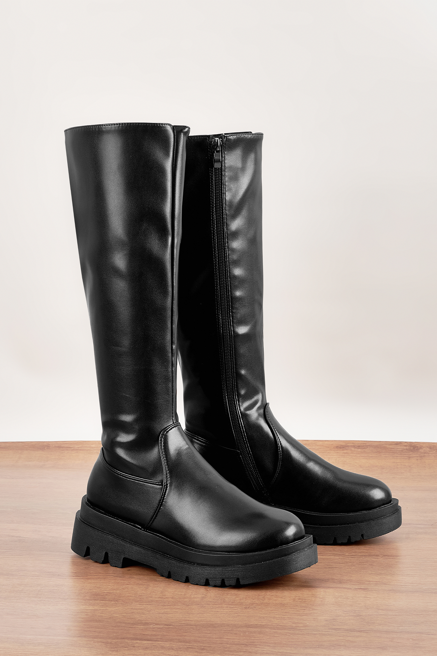 Mejora tu estilo con las botas negras de piel sintética hasta la rodilla. Estas elegantes botas tienen una silueta elegante hasta la rodilla y están confeccionadas con piel sintética suave, perfectas para hacer una declaración audaz.