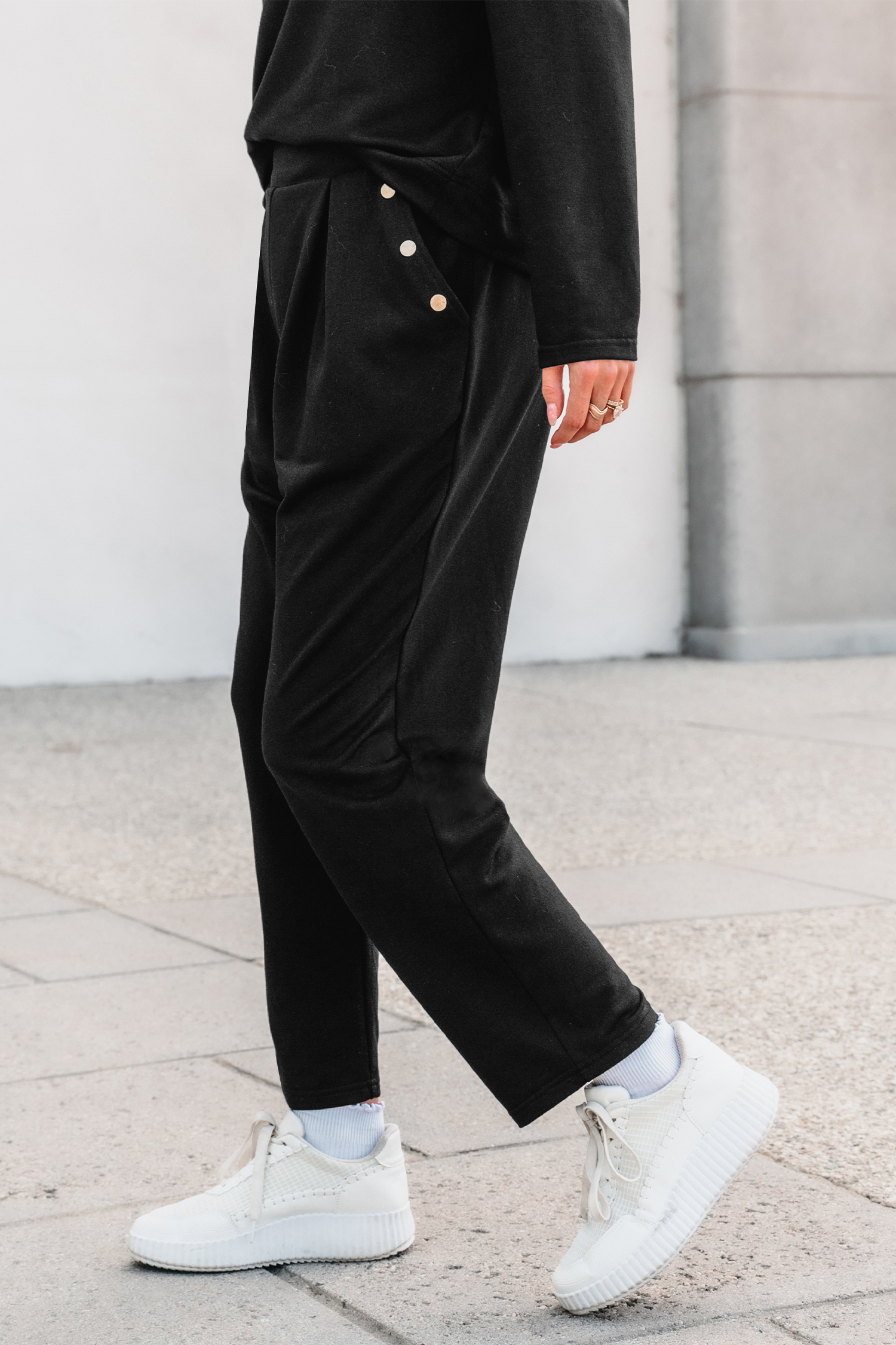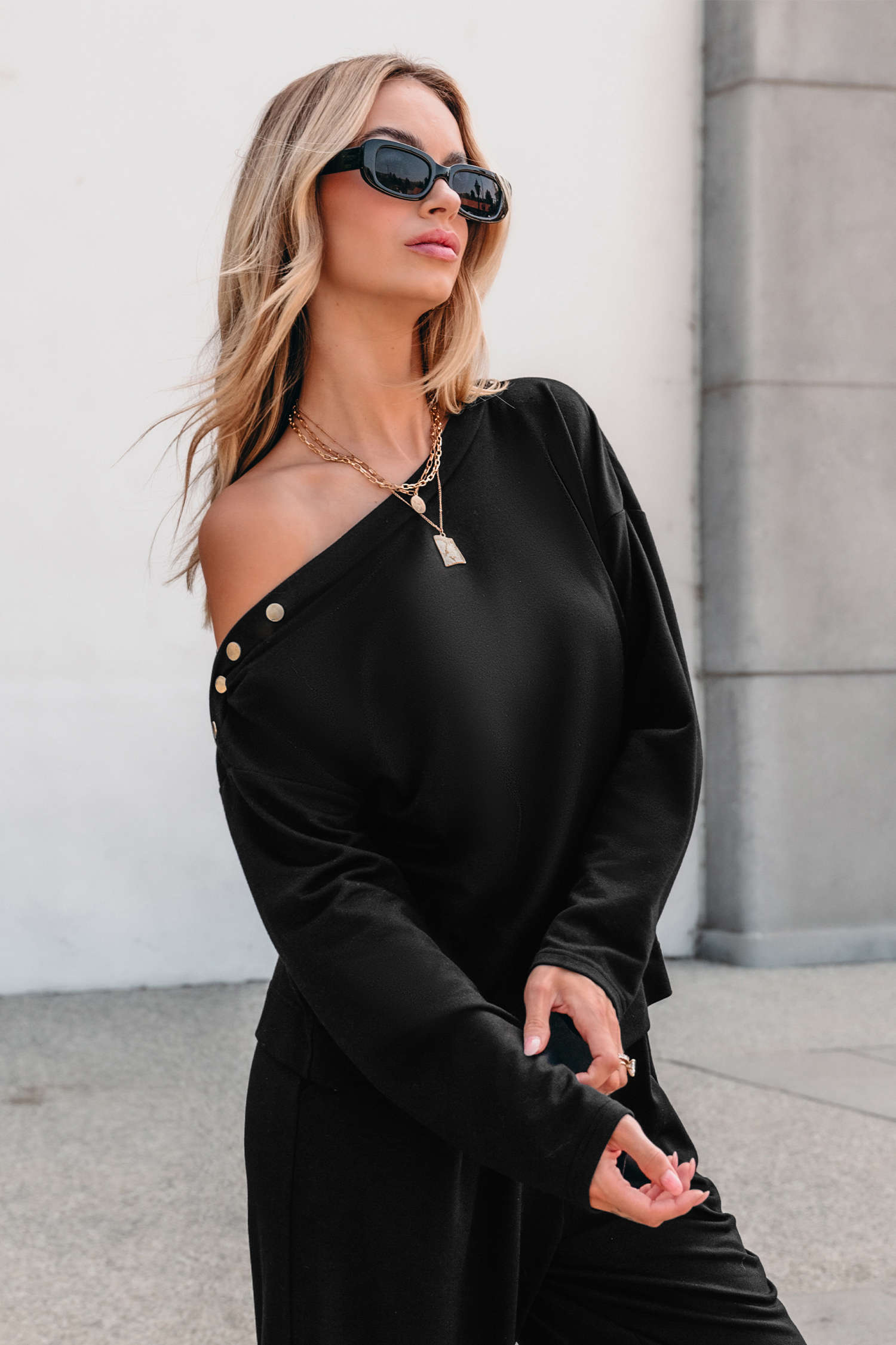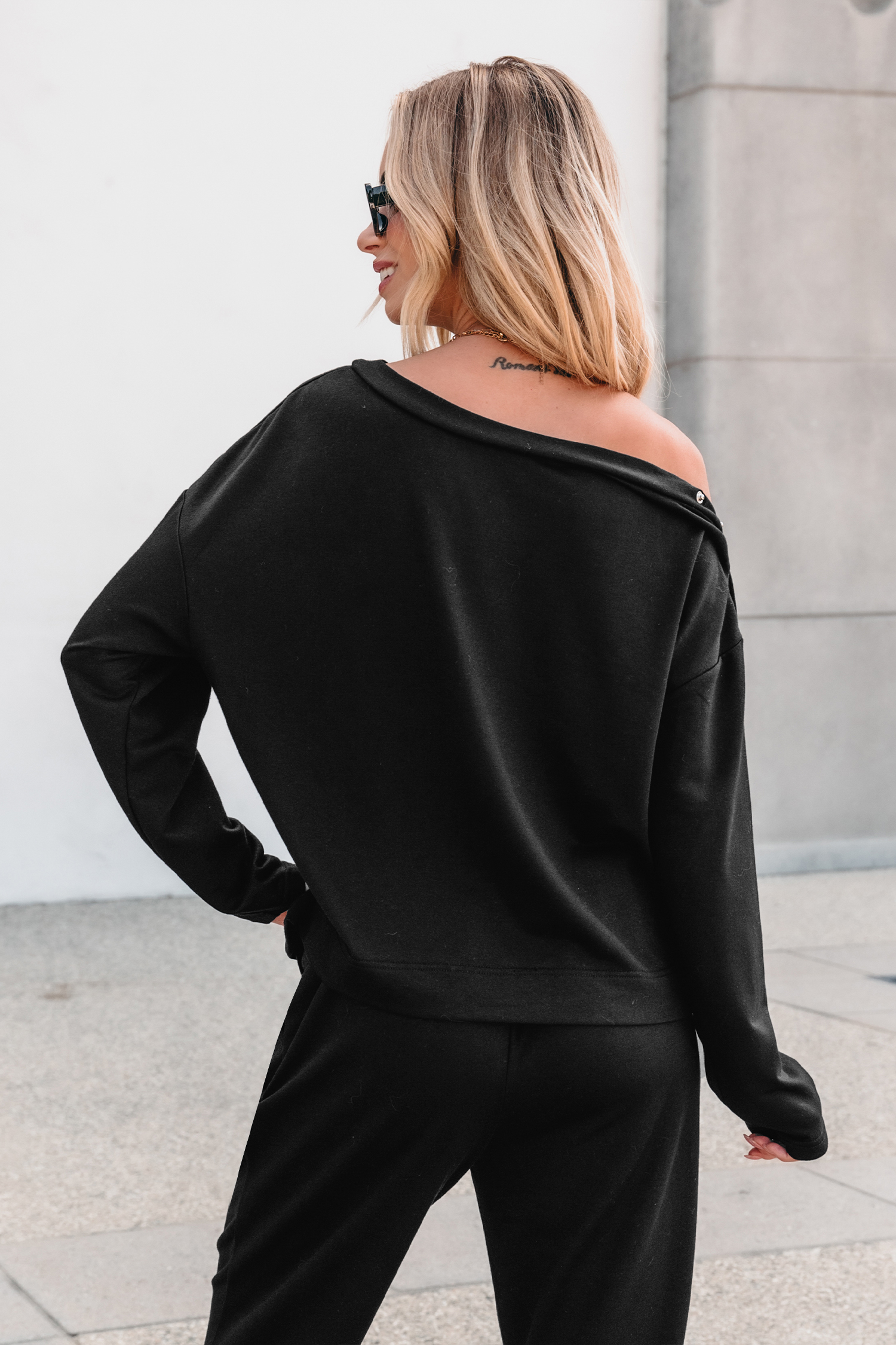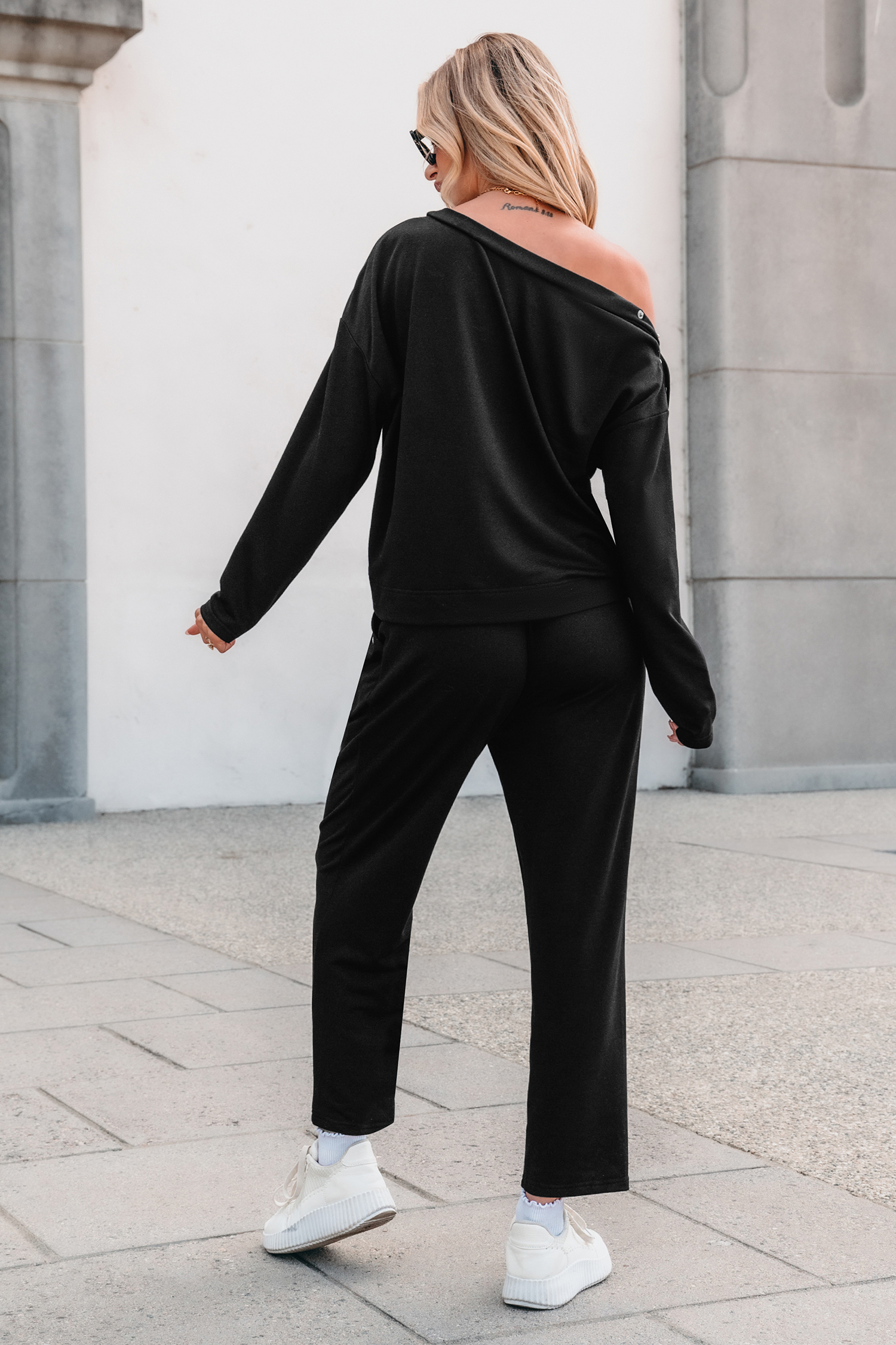 Conjunto de pantalón ajustado y top negro con hombros descubiertos
