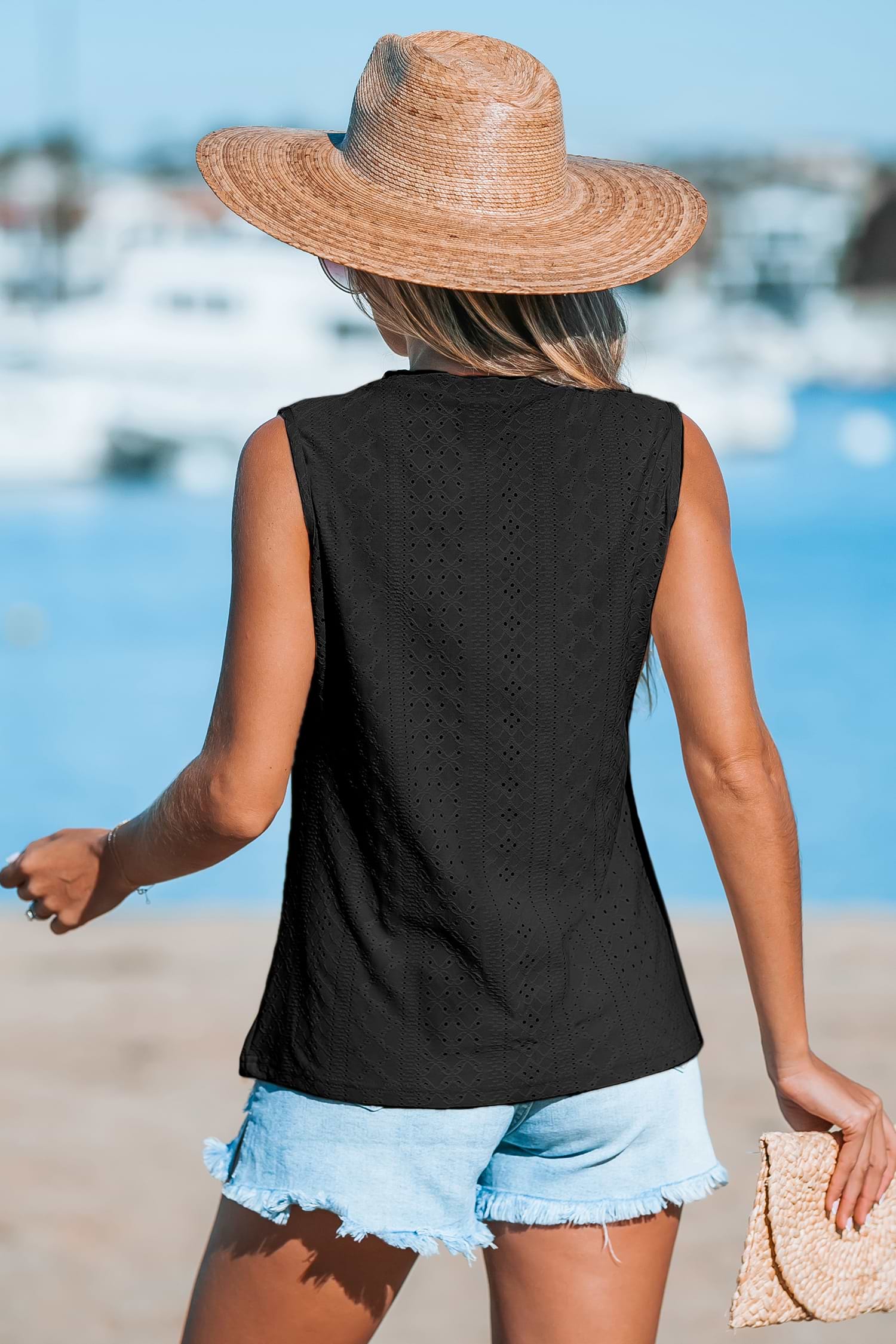Camiseta sin mangas con ojales y cuello redondo negra