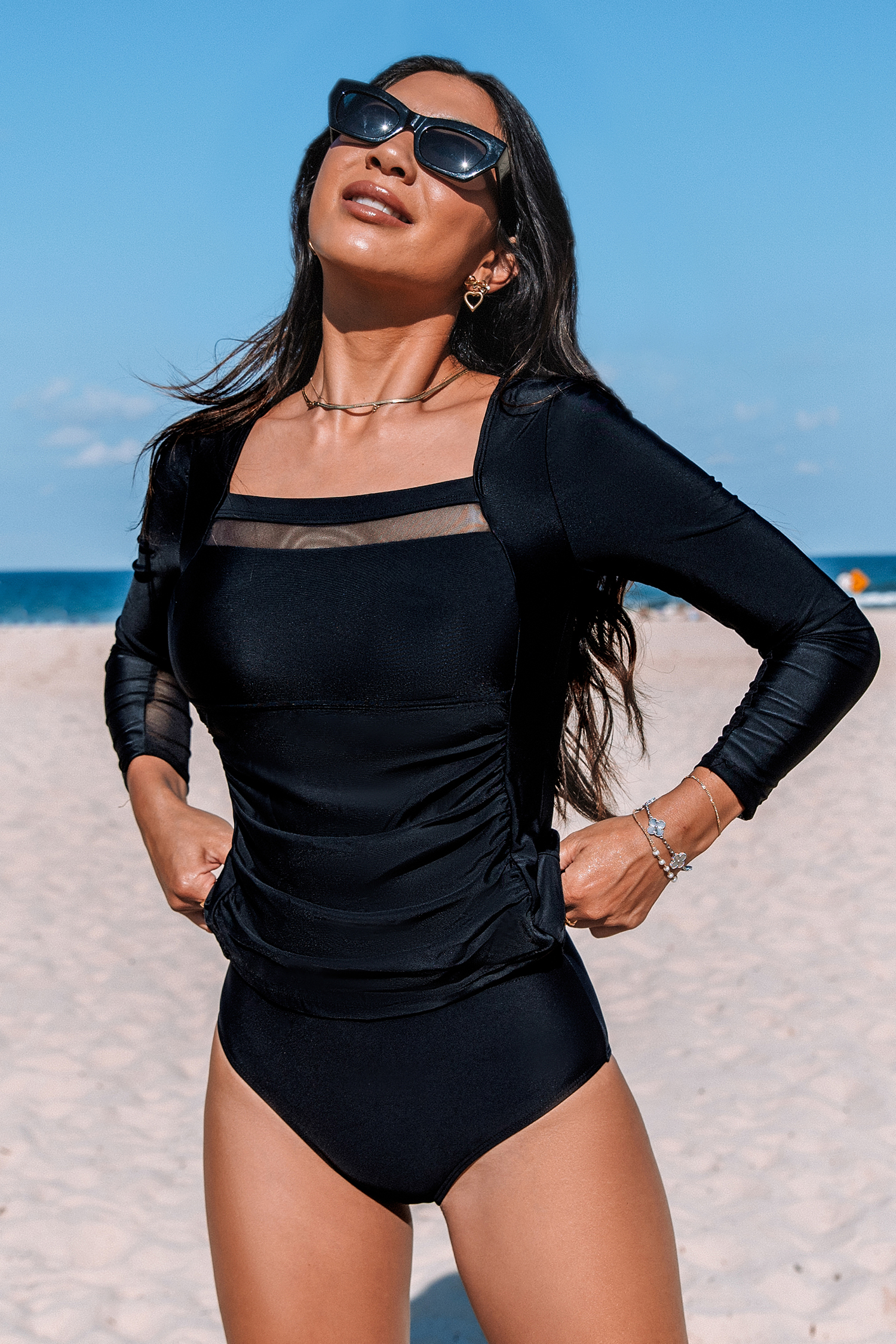 Conjunto de top tankini de malla con cuello cuadrado y pantalones de talle medio en negro
