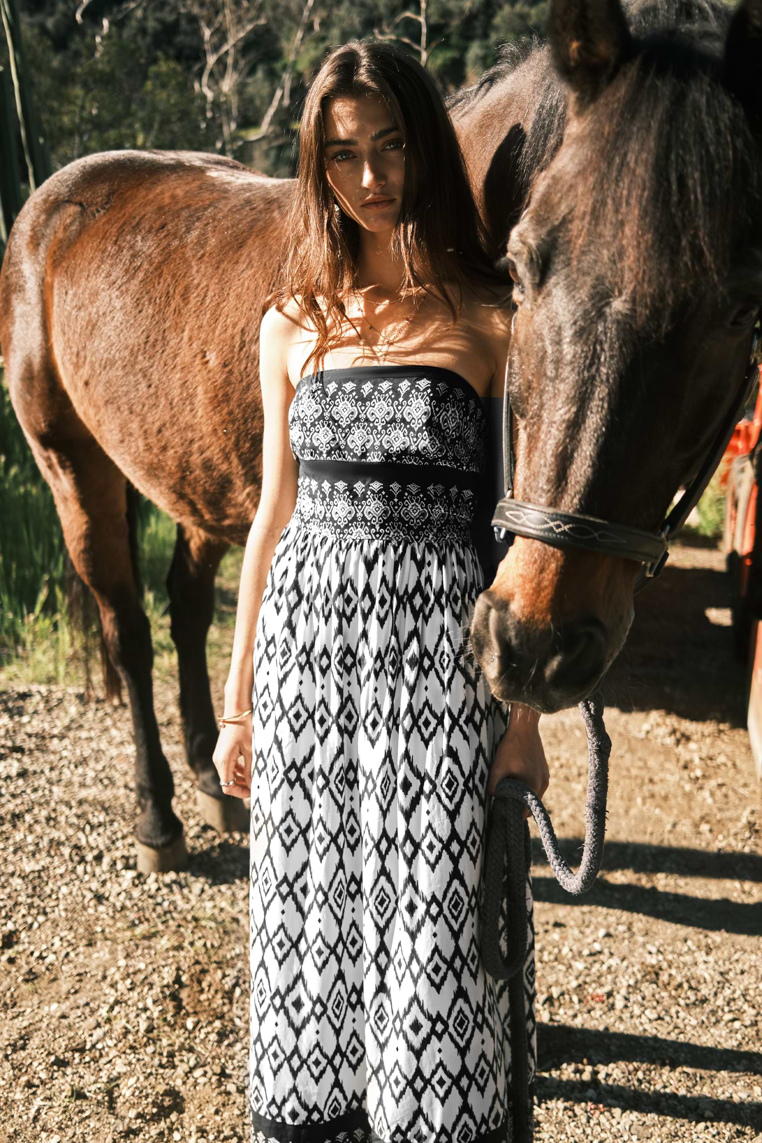 Vestido tubo largo sin mangas con diseño geométrico en blanco y negro