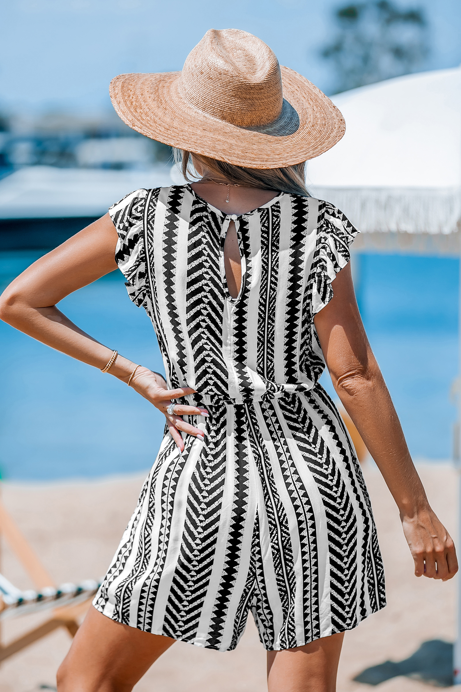 Mono de pernera ancha con mangas acampanadas y rayas geométricas en blanco y negro