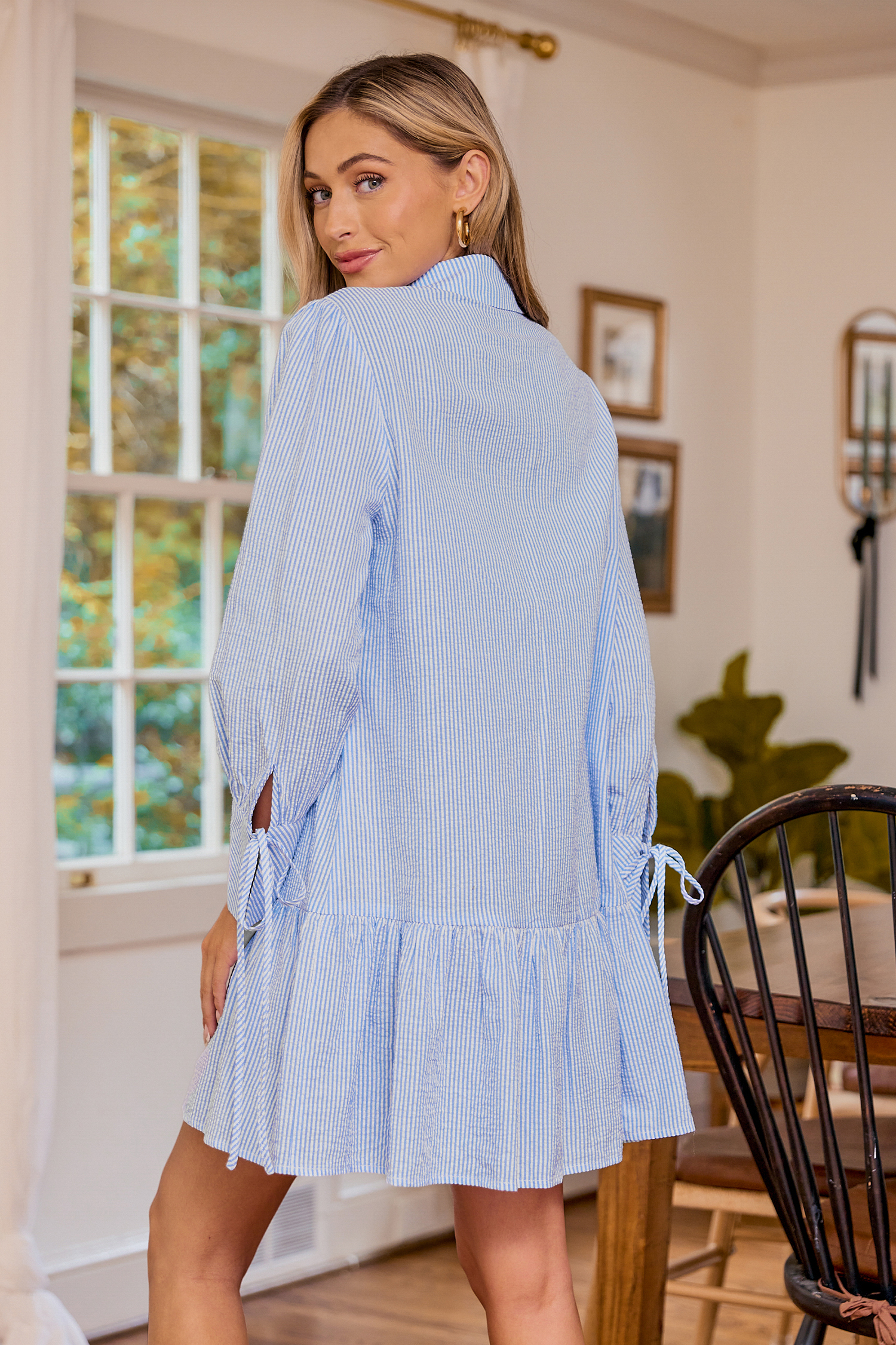 Vestido corto con cuello abotonado dobladillo con volante y rayas azules