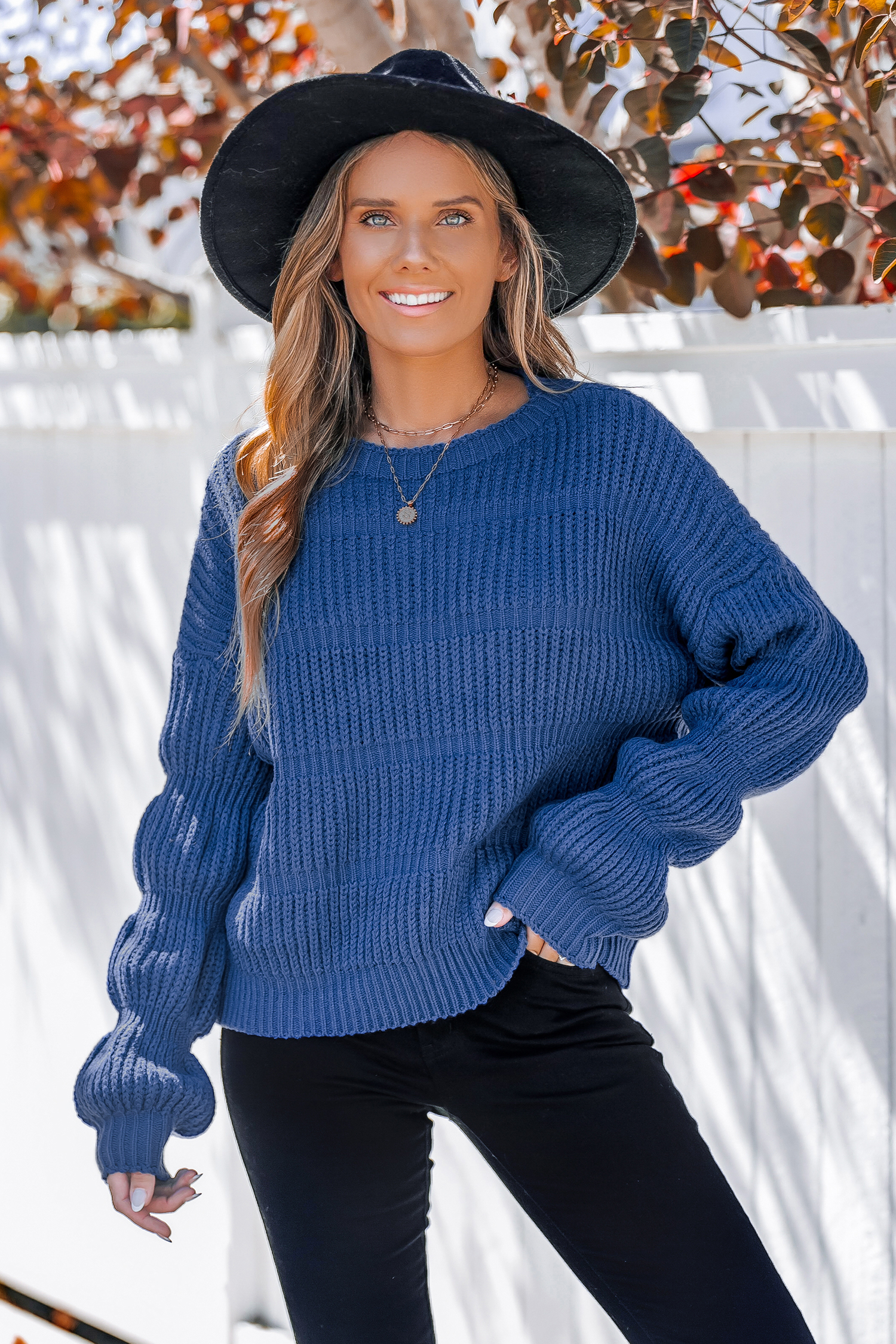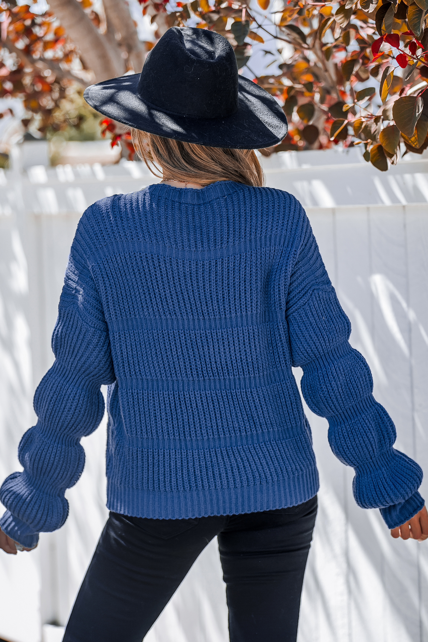 Suéter azul de cuello redondo y mangas abullonadas con adornos