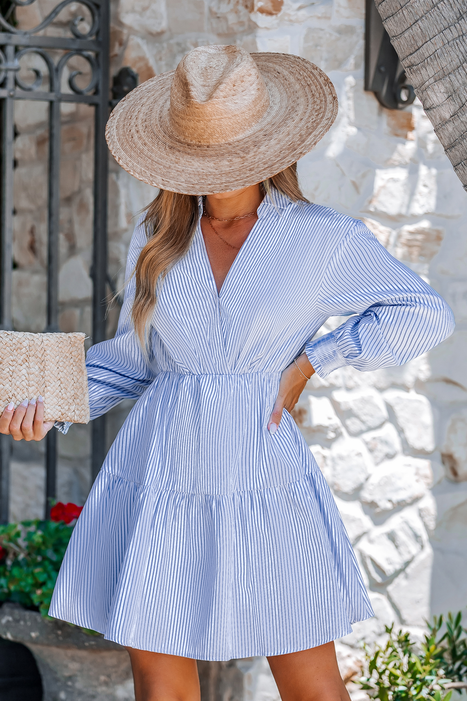 Vestido mini con mangas abullonadas y cuello a rayas azules