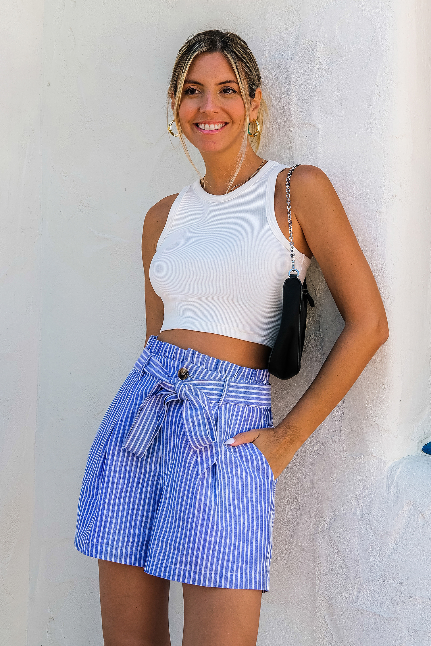 Pantalones cortos de pernera ancha con cintura en rústica a rayas azules y blancas