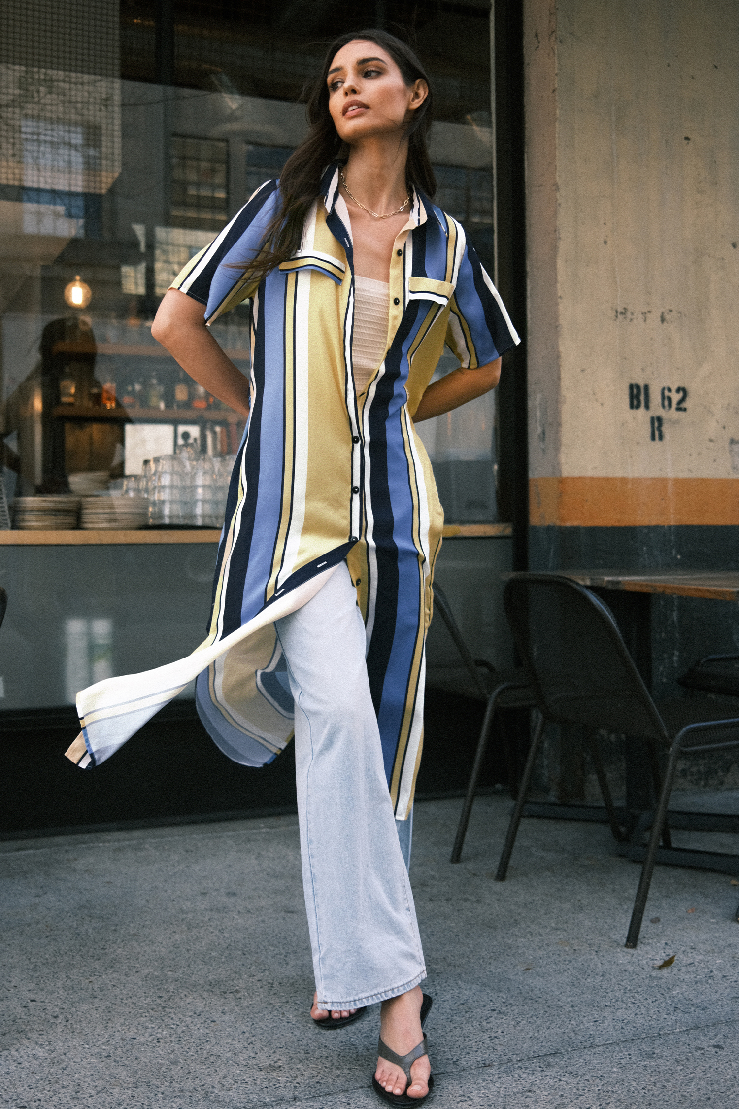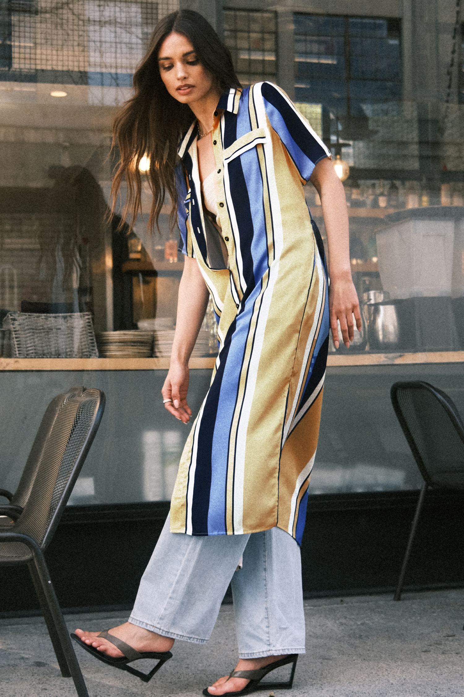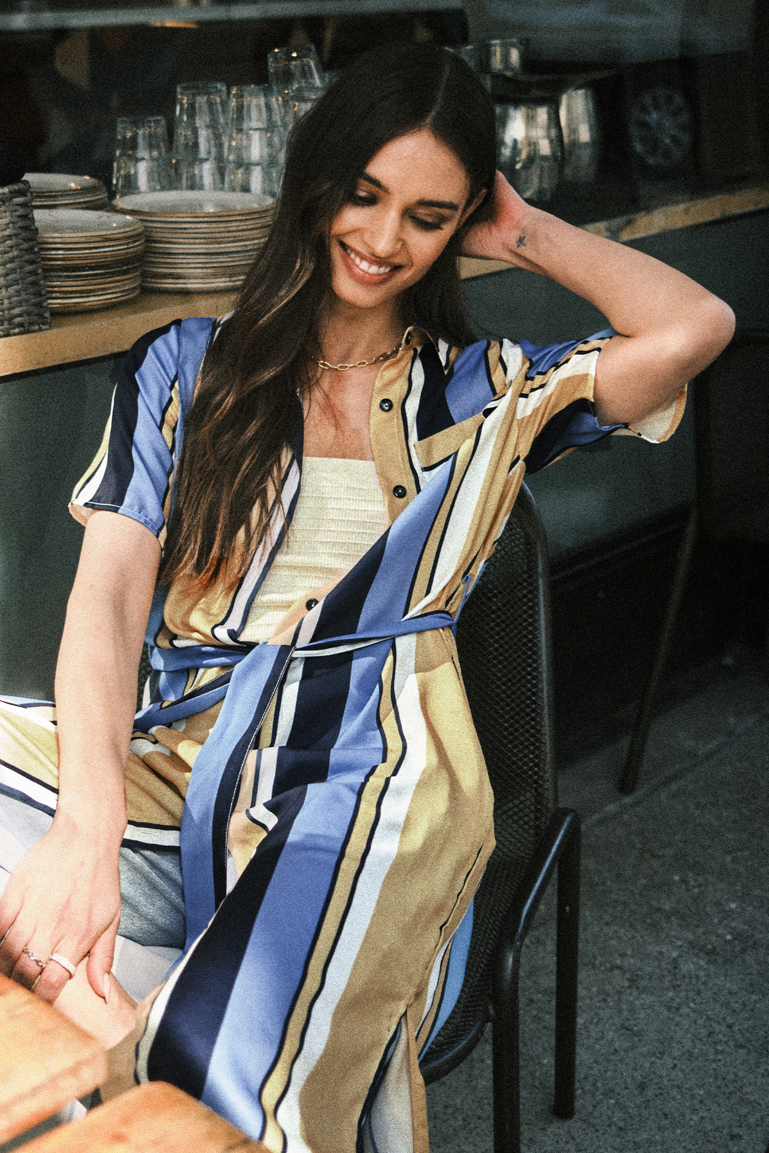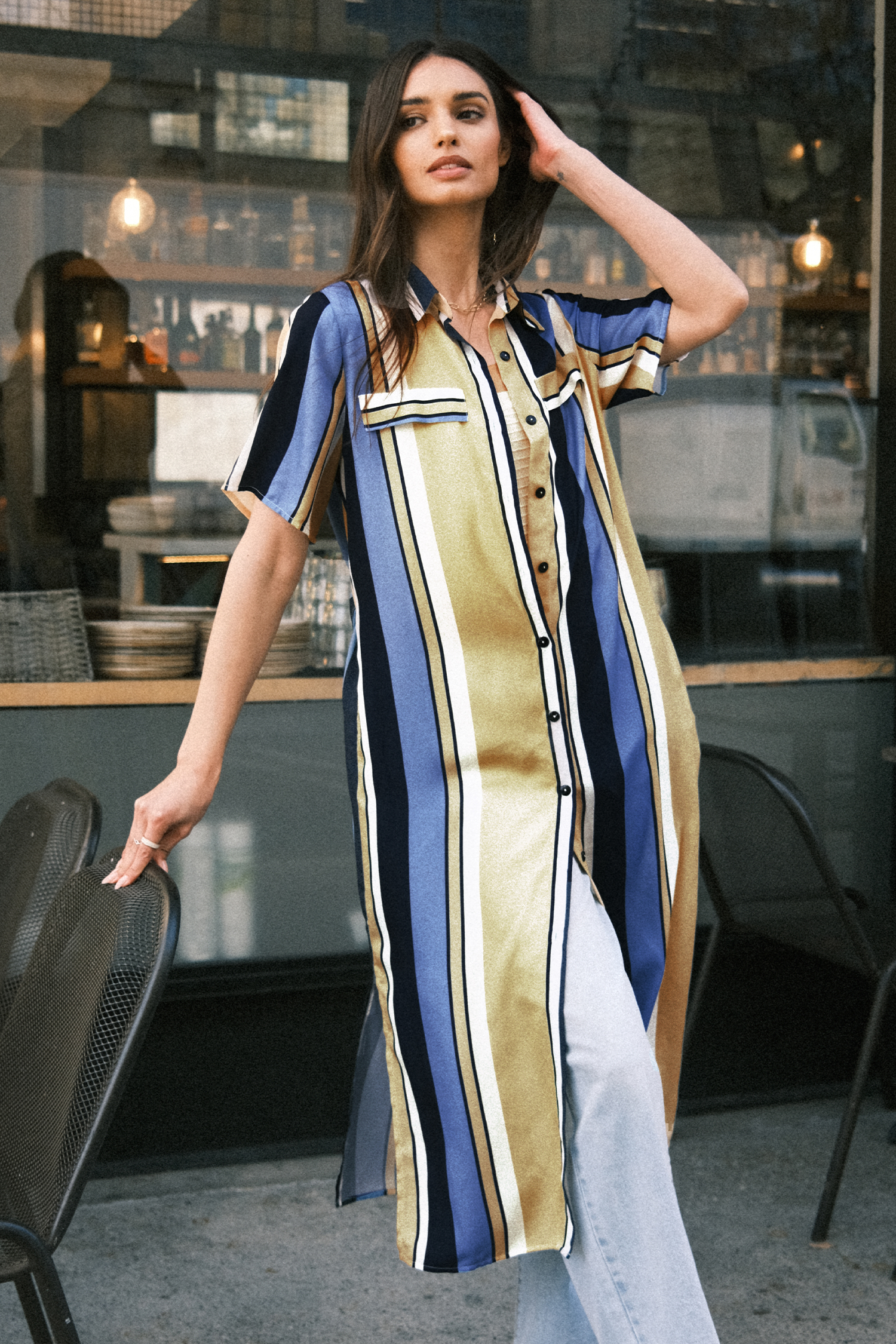 Vestido estilo camiseta midi con botones delanteros y cuello a rayas azul y amarillo
