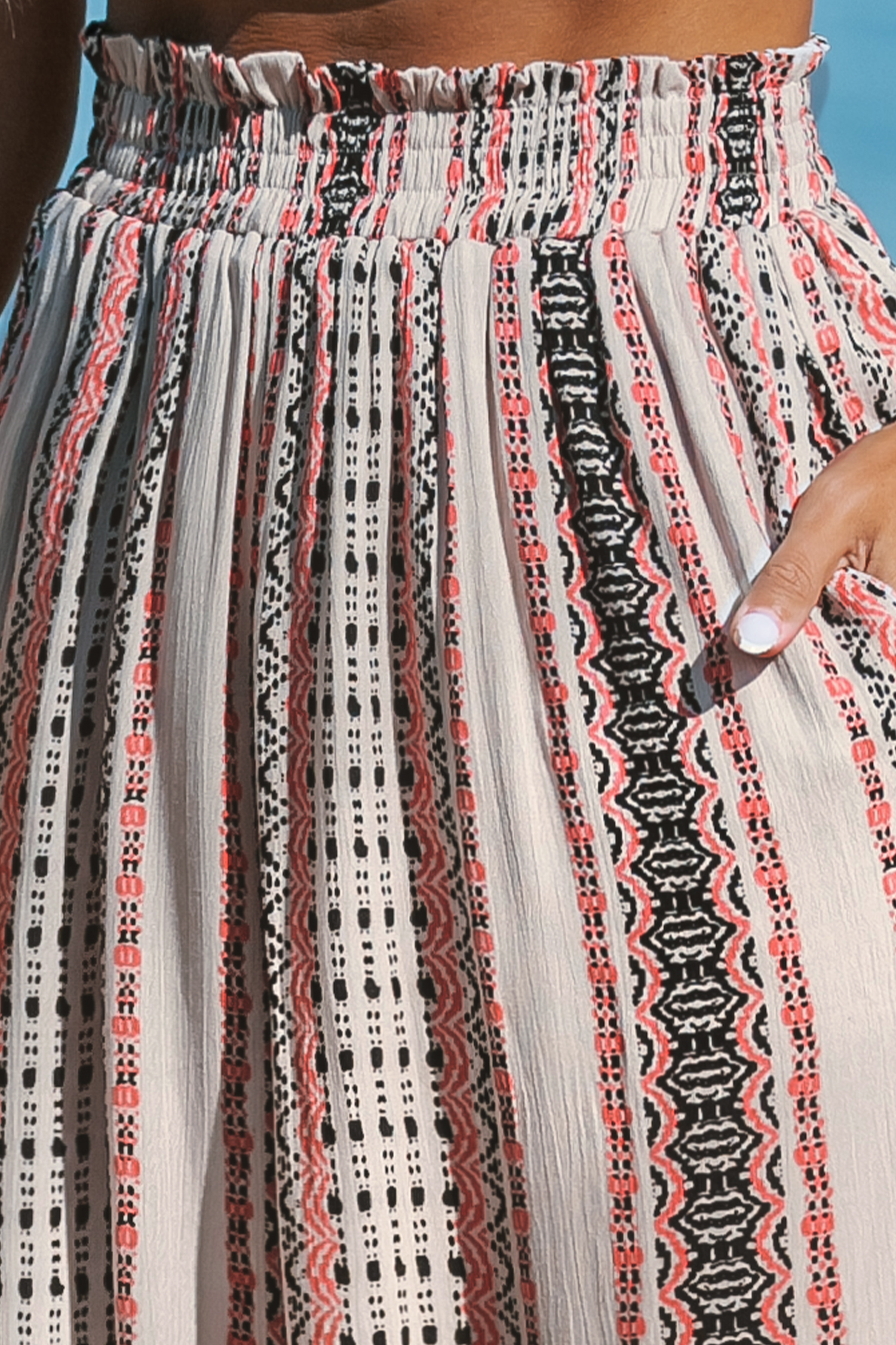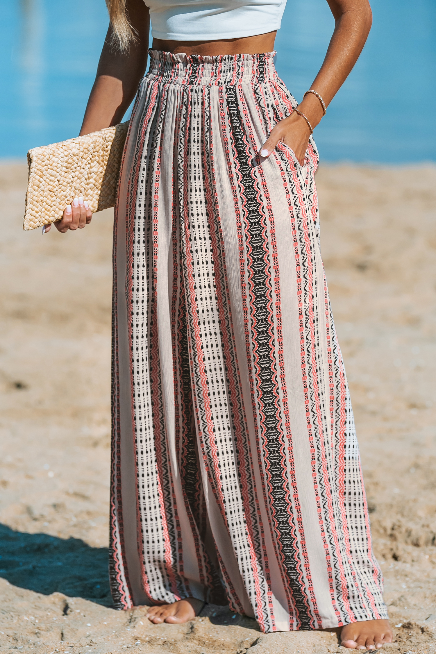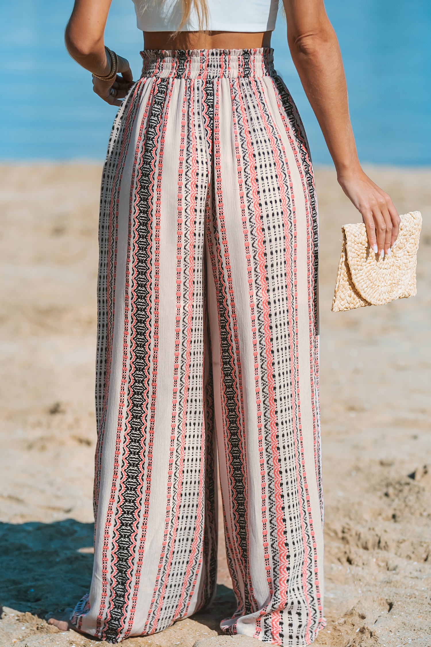 Pantalones anchos con cintura fruncida y rayas boho