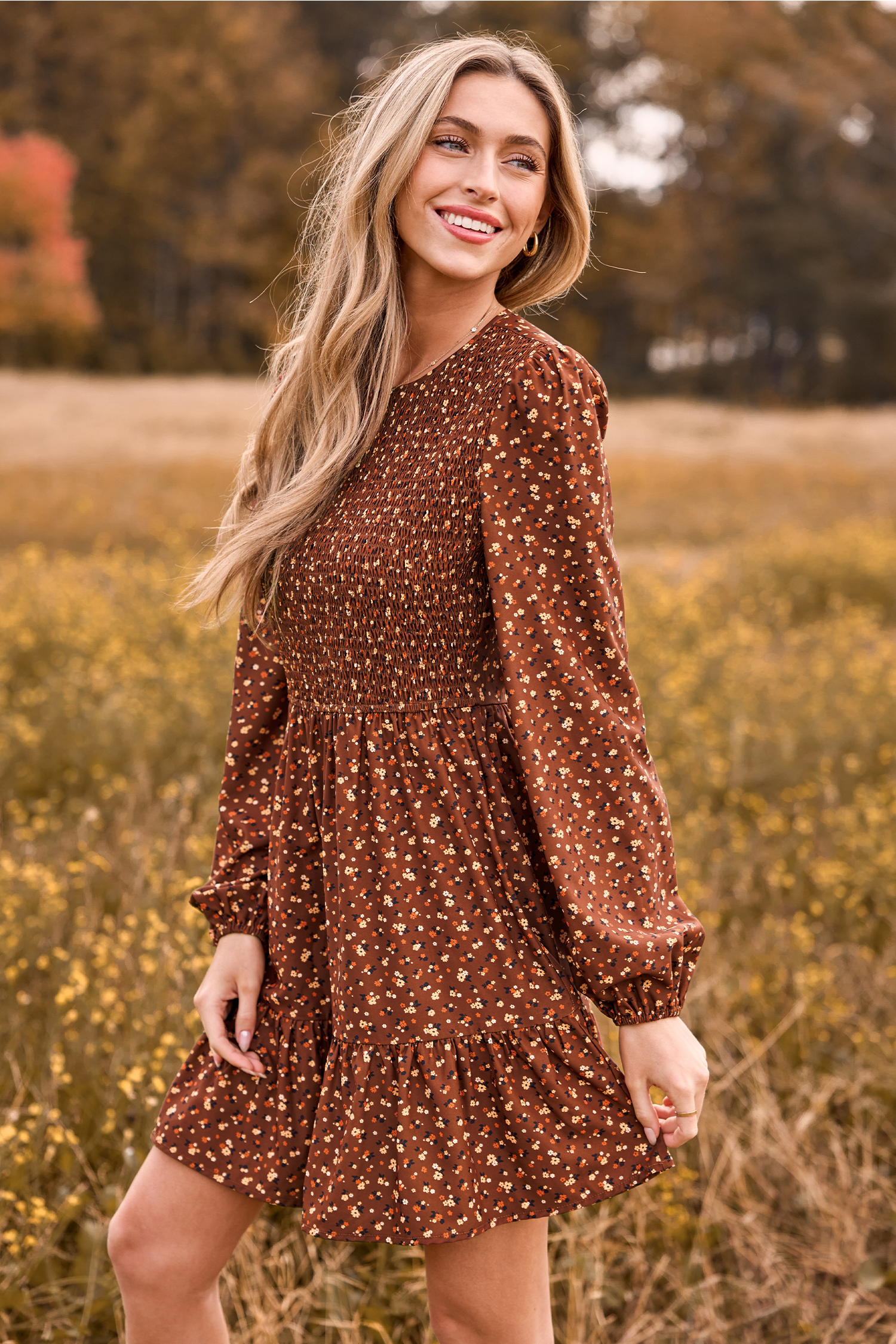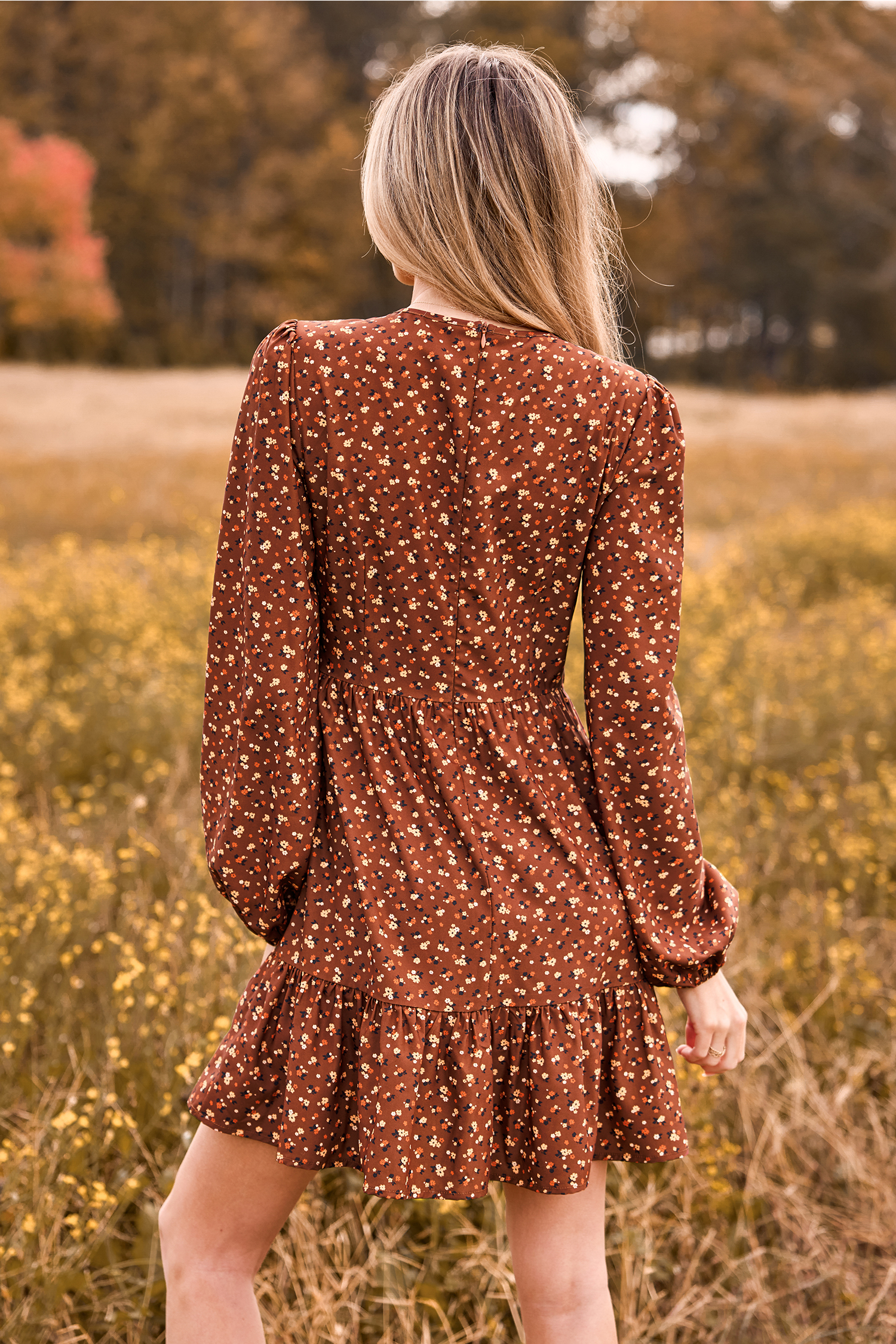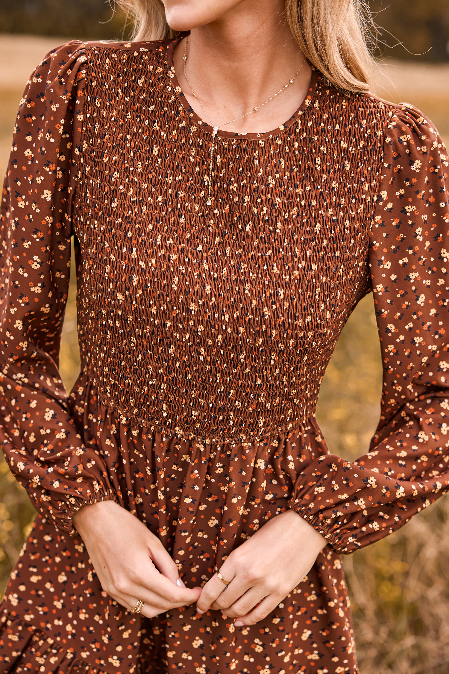 Vestido midi fruncido con mangas abullonadas y estampado de florecitas en color marrón