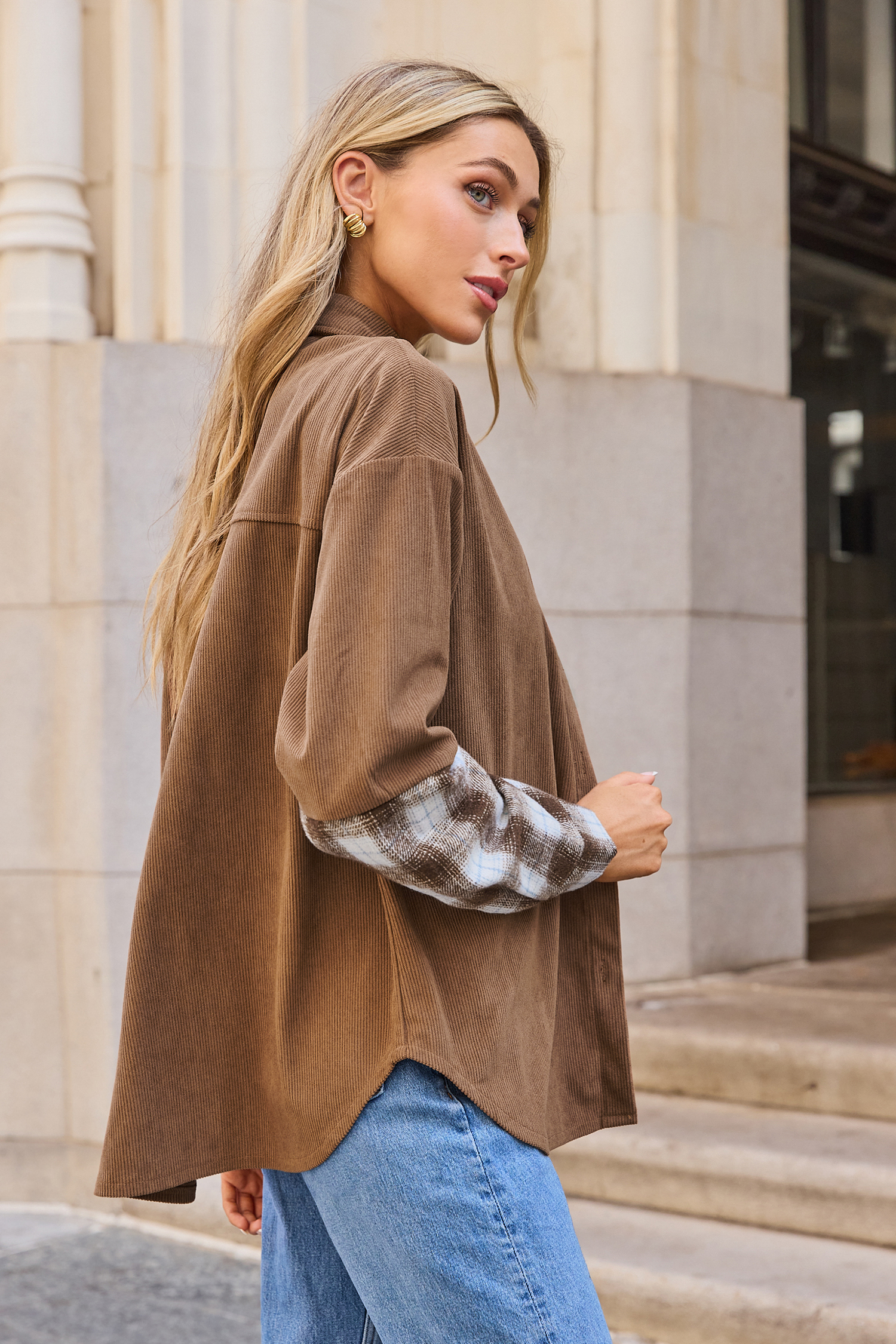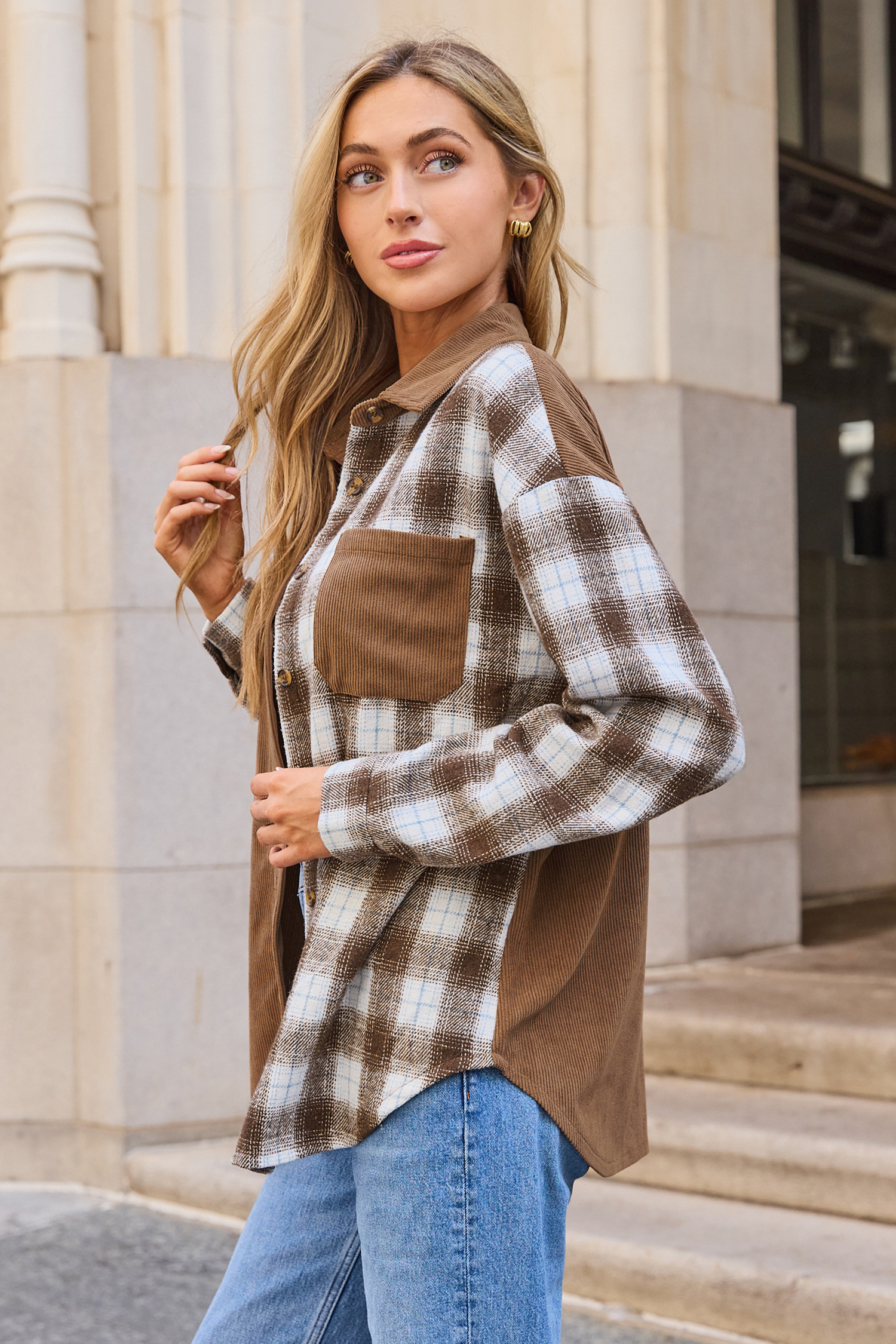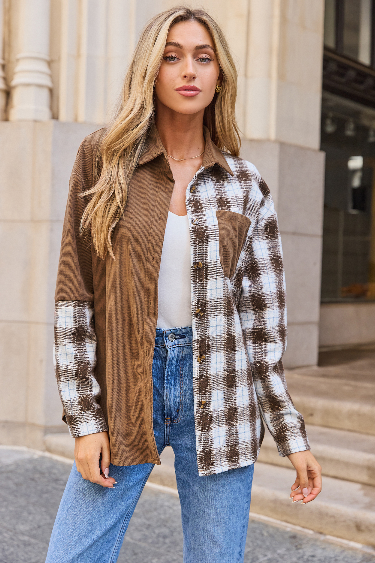 Camisa abotonada con cuello y parches de cuadros marrones y cuadros
