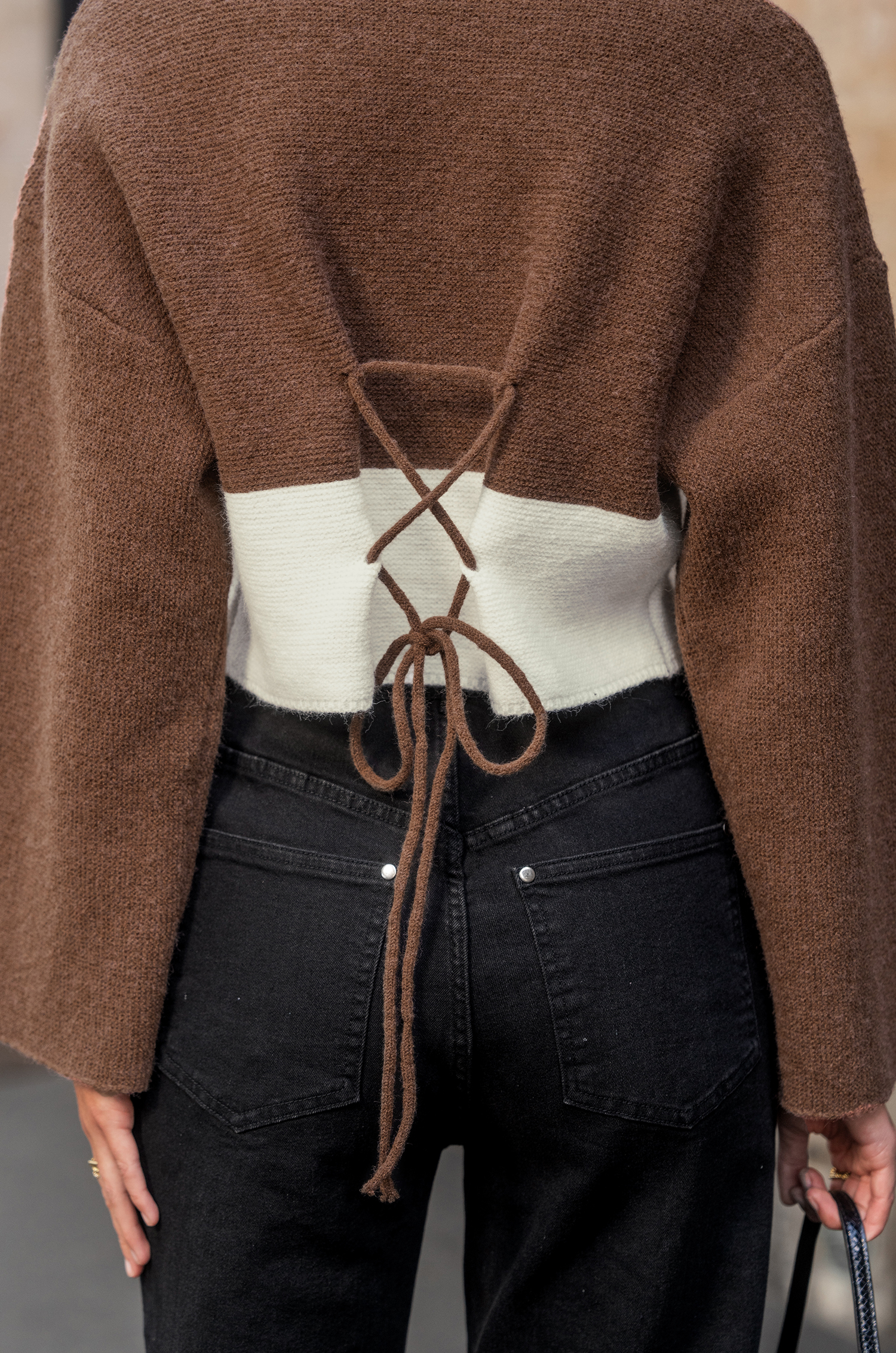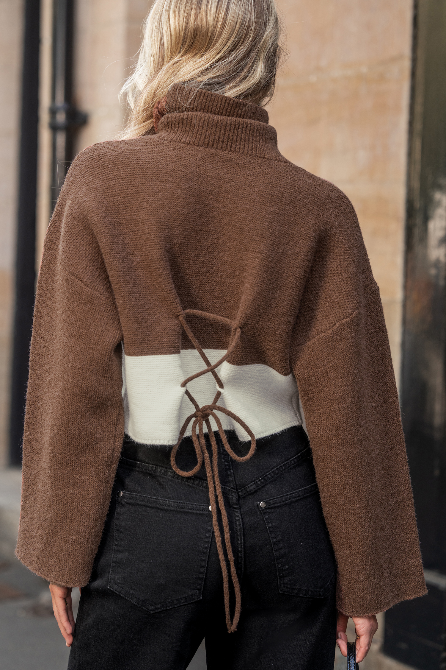 El jersey de cuello alto corto con mangas acampanadas y diseño en bloques de color marrón y blanco es la combinación perfecta de calidez y estilo, y te ofrece todo el estilo otoñal sin sacrificar ni un ápice de personalidad. Combínalo con unos jeans de tiro alto y estarás lista para lucirte, ¡sin necesidad de pasar por la pasarela!