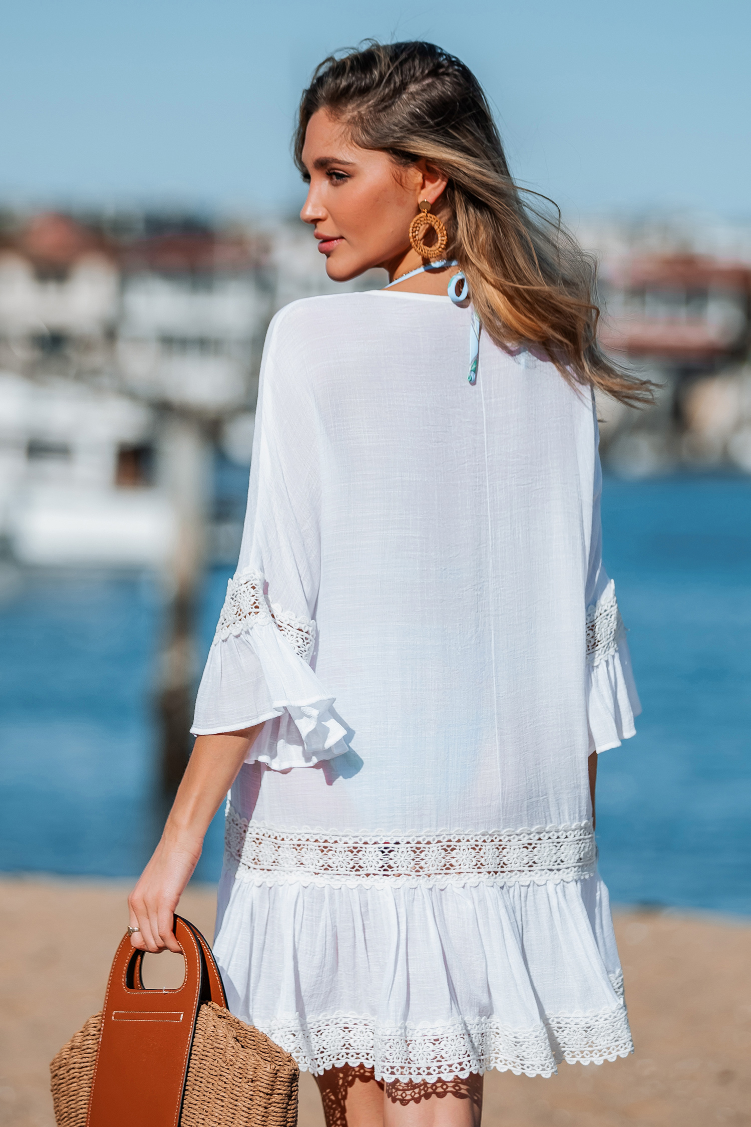 ¡Pasa el día tranquilamente con el minivestido blanco Daydreamer de Coastal! Con escote redondo, medias mangas y detalles de encaje en contraste, este vestido tiene ribetes con volados para lograr un estilo relajado y romántico, perfecto para un estilo playero informal.