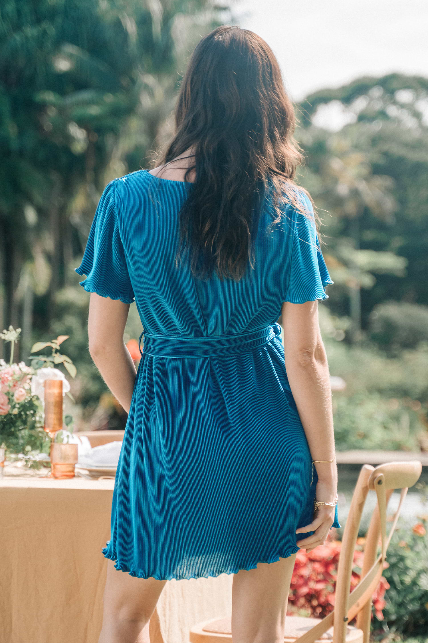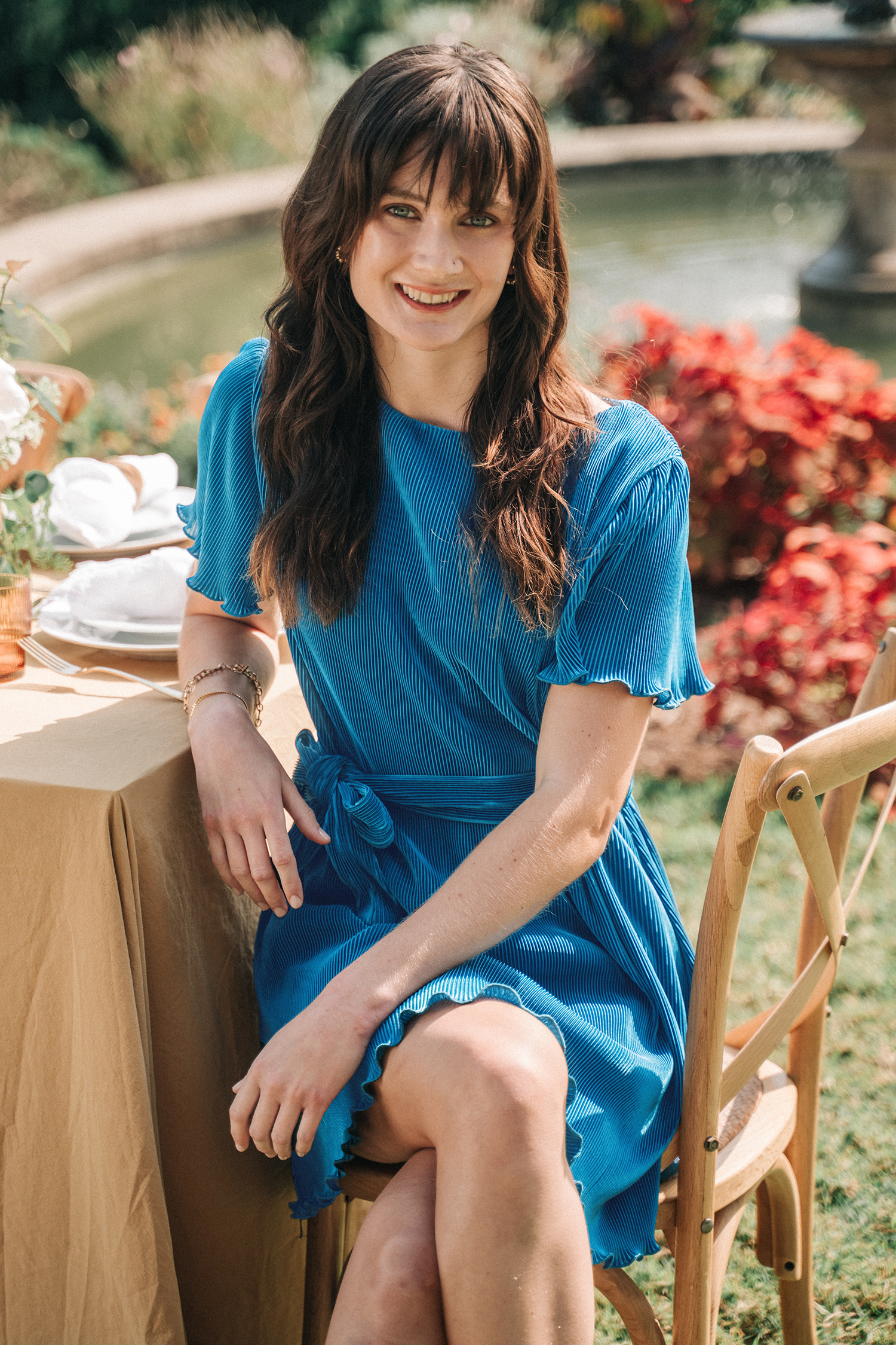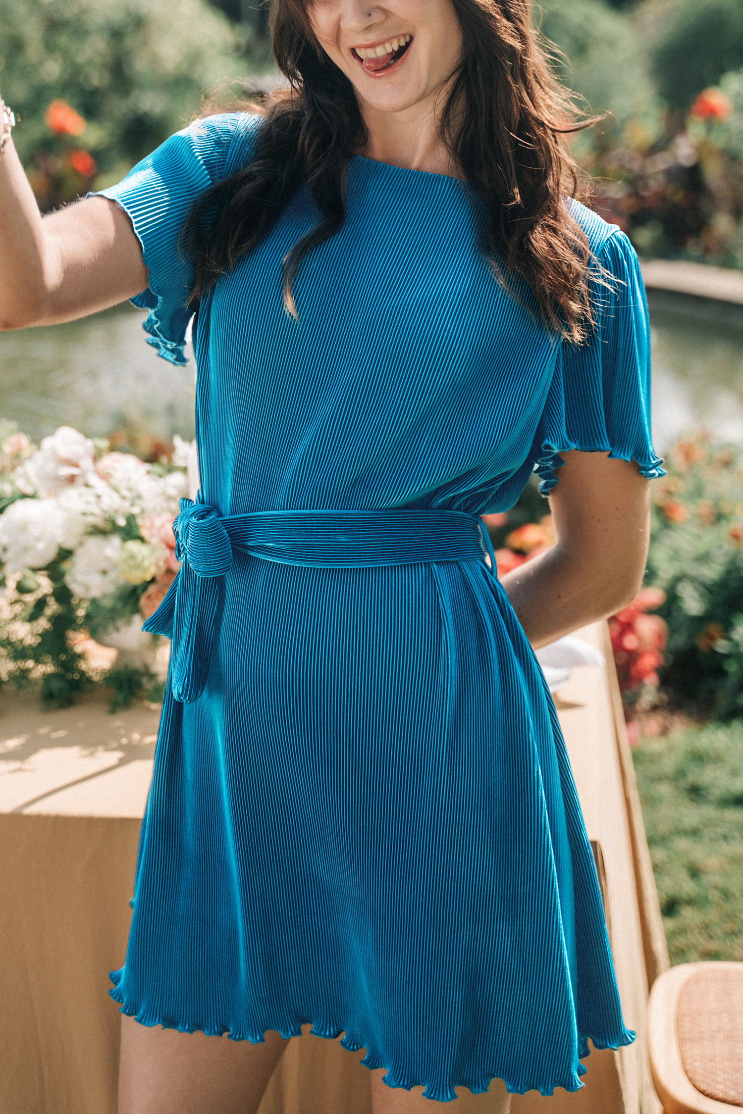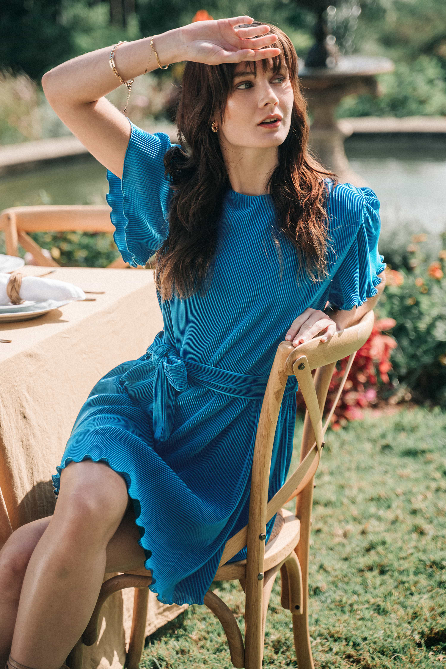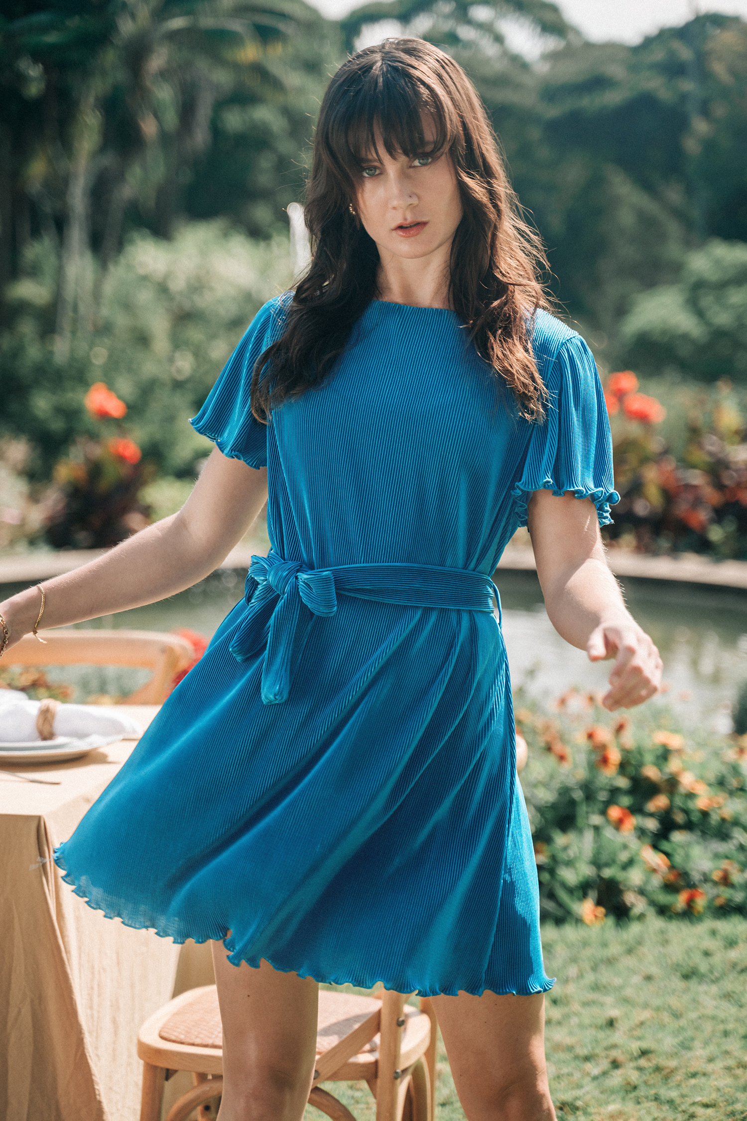 Minivestido cobalto con cuello barco y manga corta con ribete en forma de lechuga