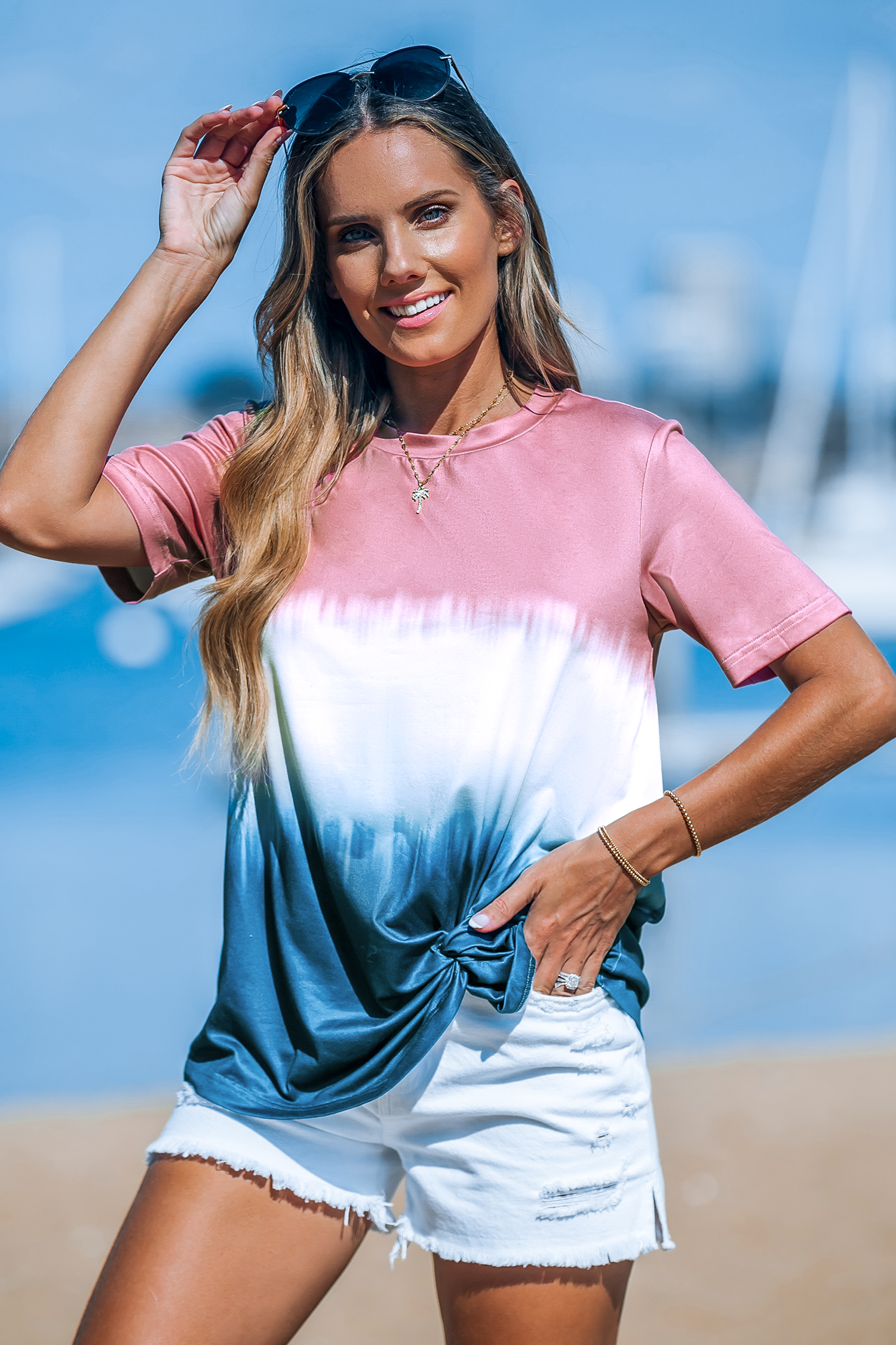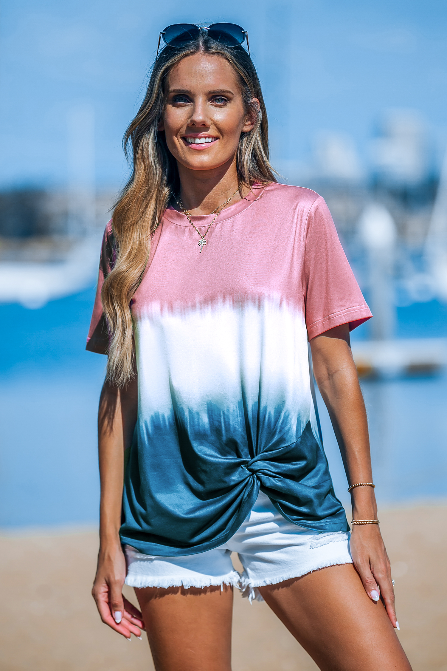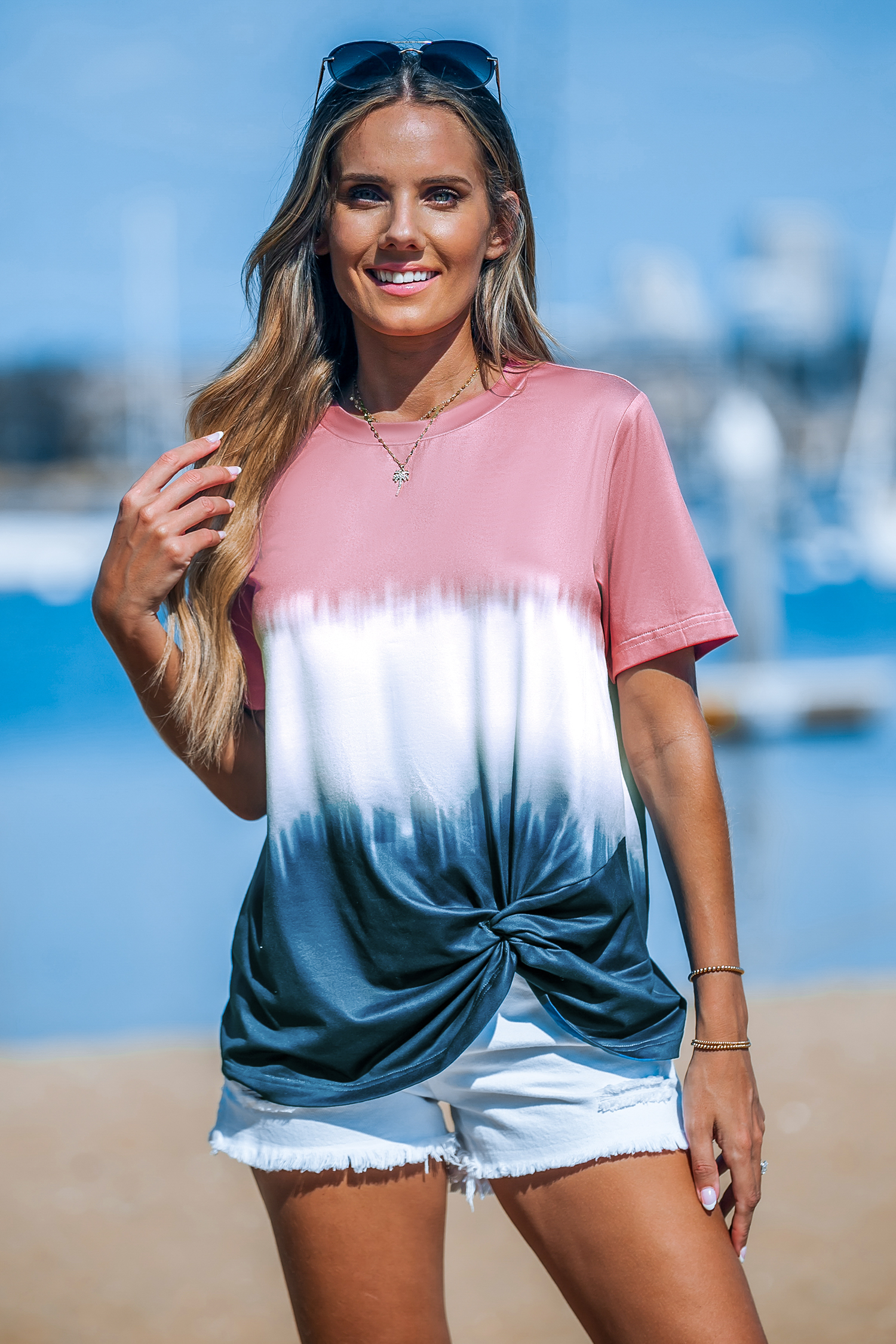 Camiseta con dobladillo retorcido y teñido anudado en bloques de color