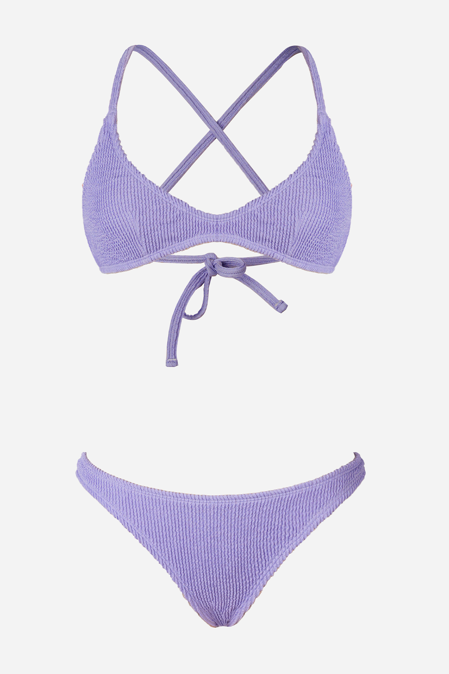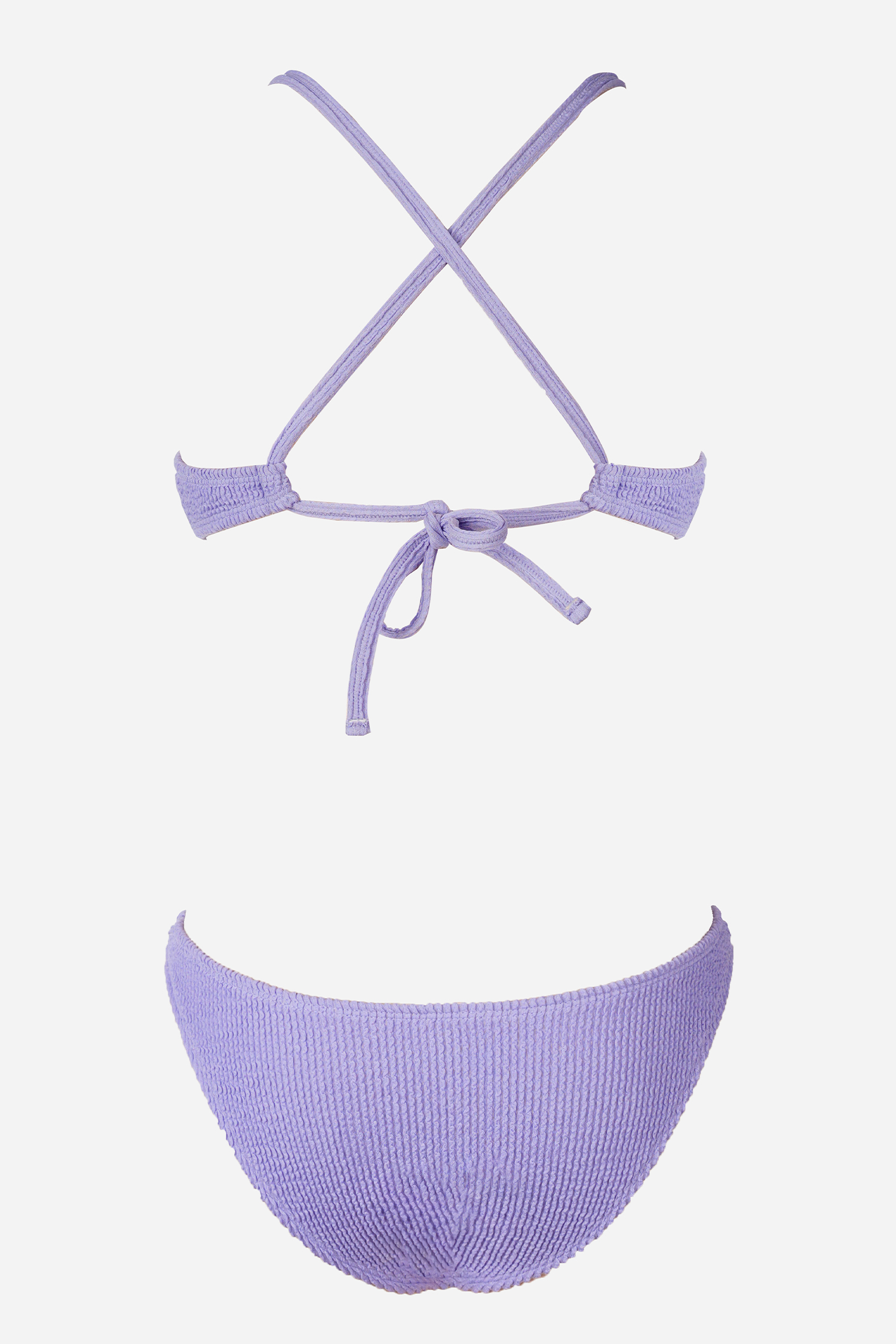 Conjunto de top de bikini morado arrugado y braguitas de talle bajo