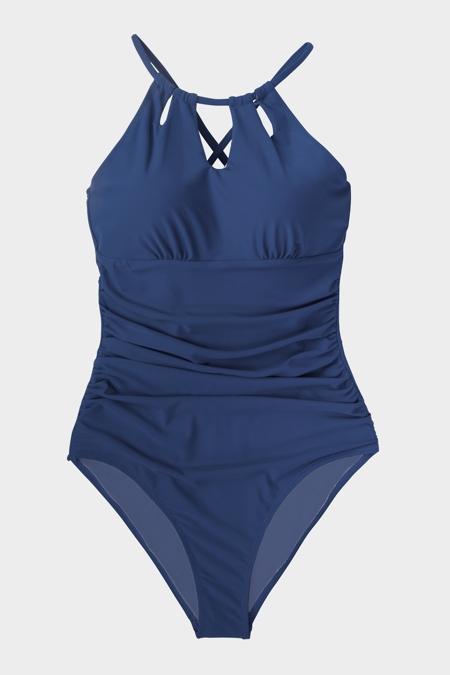 Traje de baño de una pieza azul con cuello alto y abertura