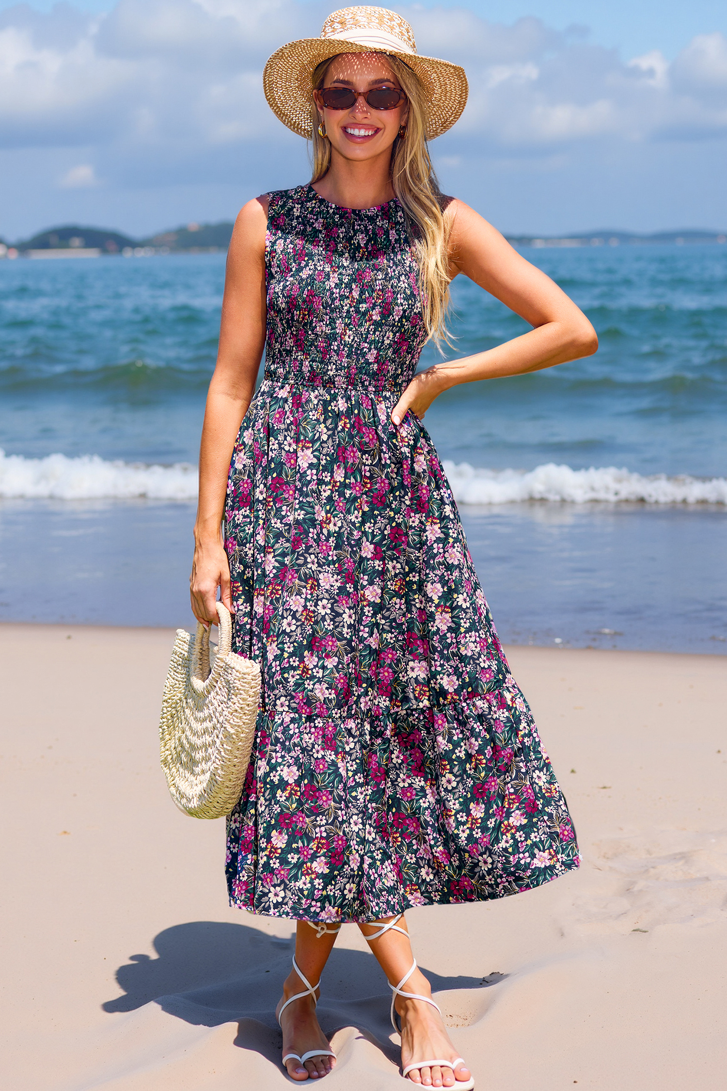 InicioVestido midi sin mangas con escote fruncido y estampado floral oscuro