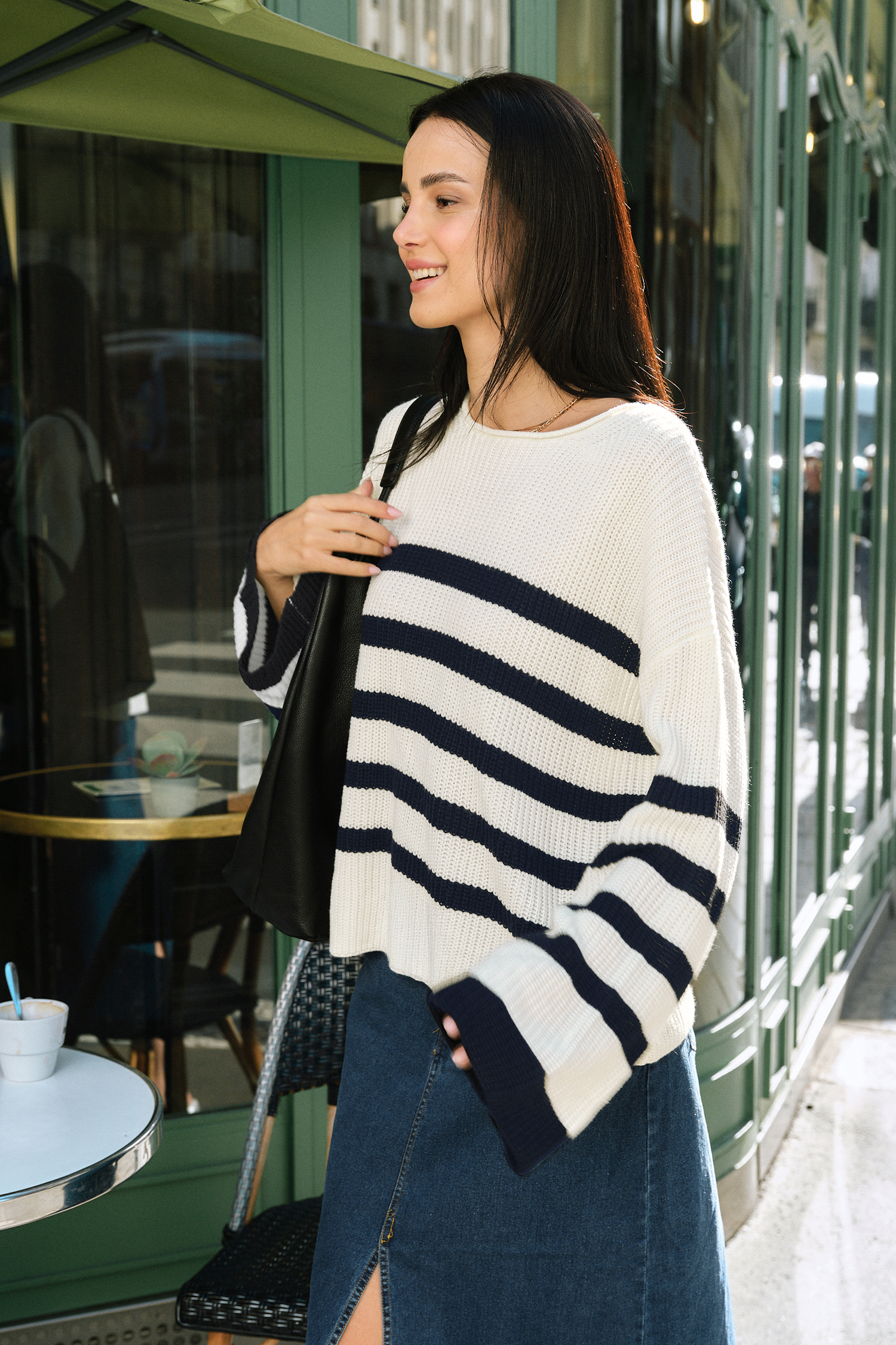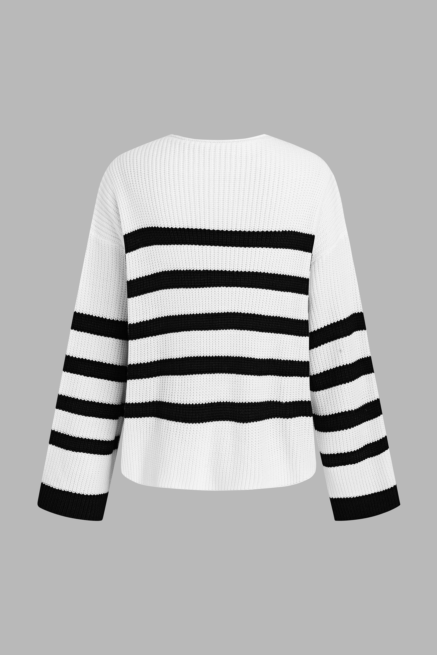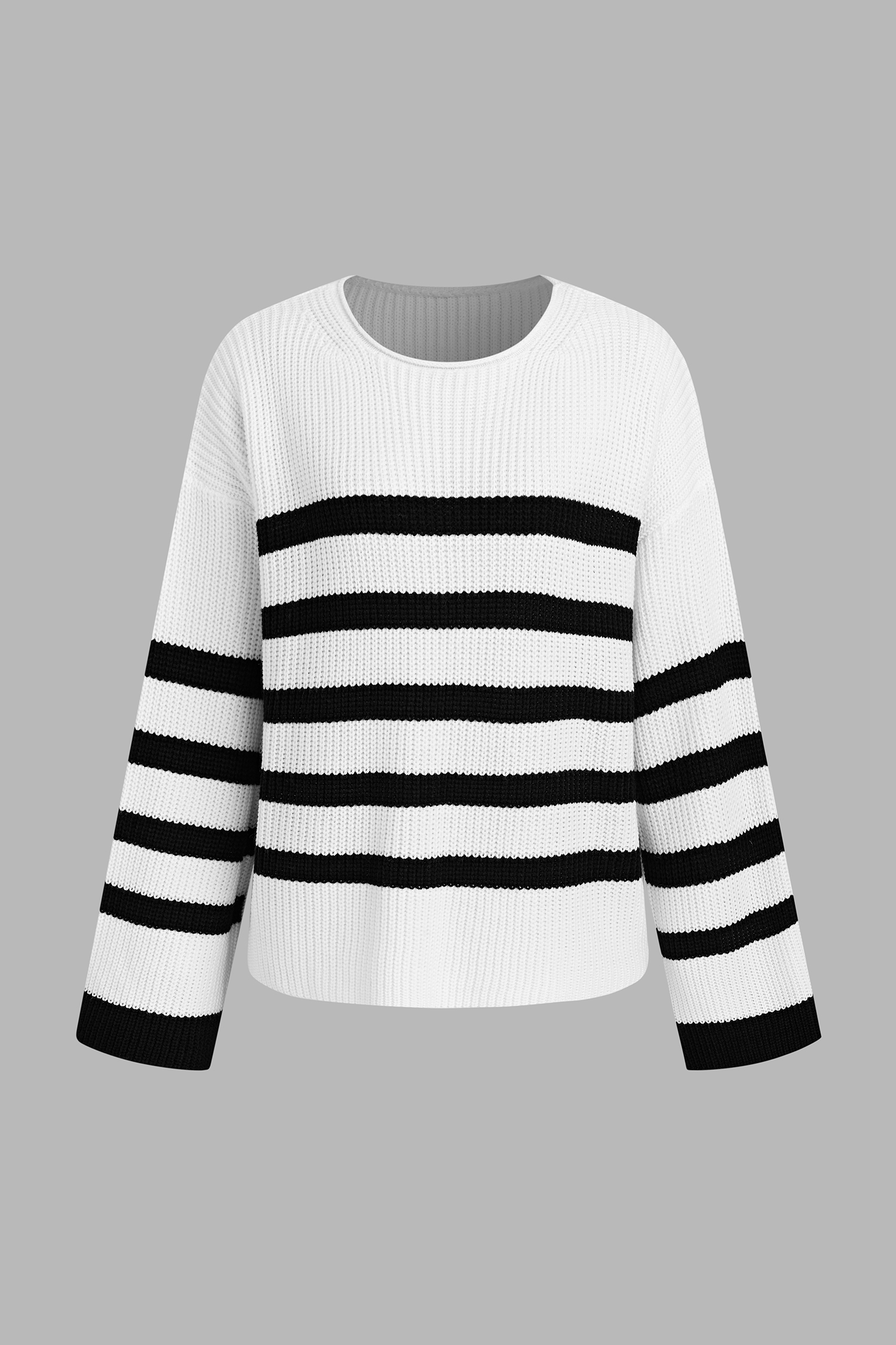 ¡El suéter de rayas de día y de noche está listo para cualquier ocasión! Su cuello redondo, mangas largas y corte holgado lo hacen cómodo y versátil.