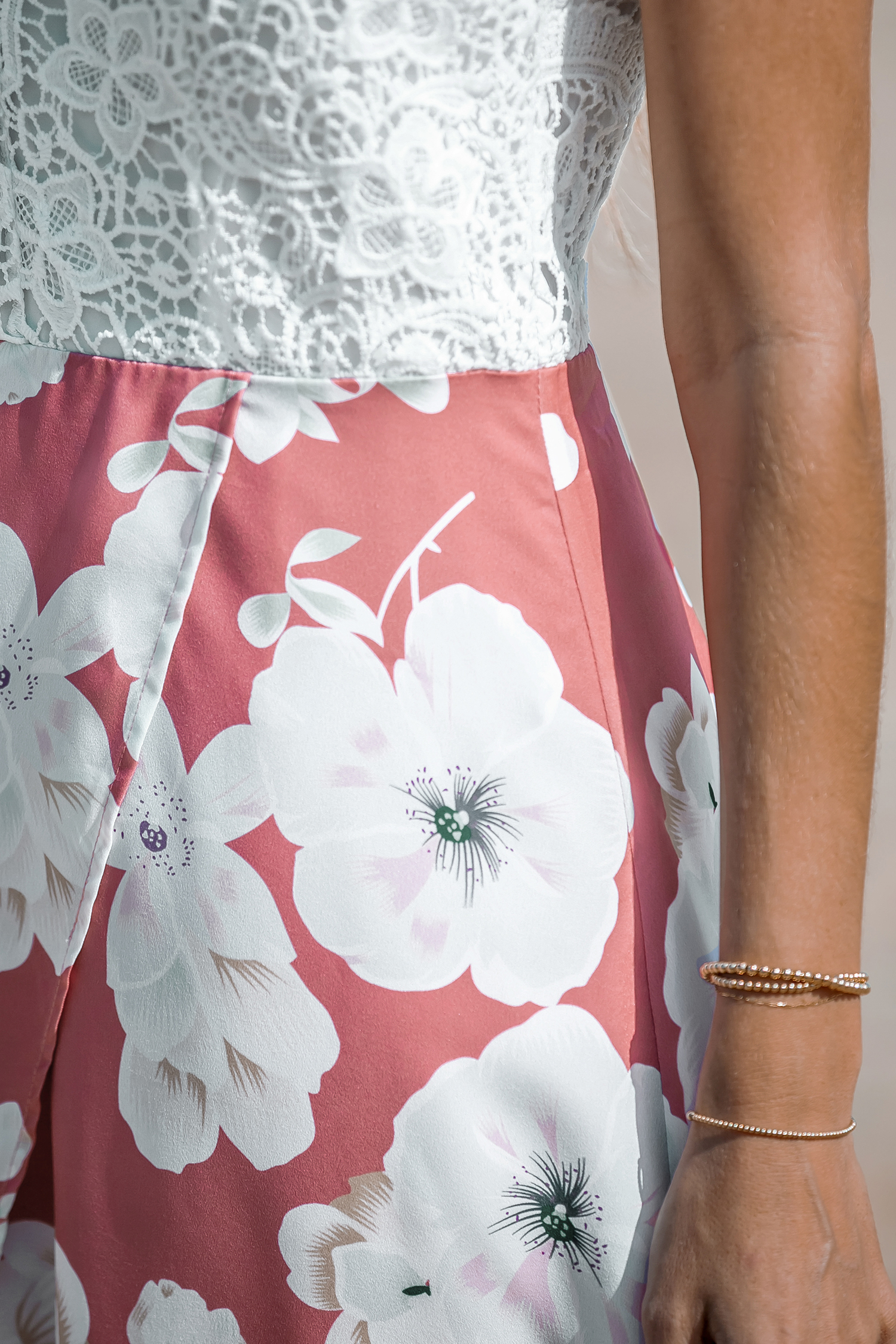 Vestido midi asimétrico sin mangas festoneado con encaje y flores