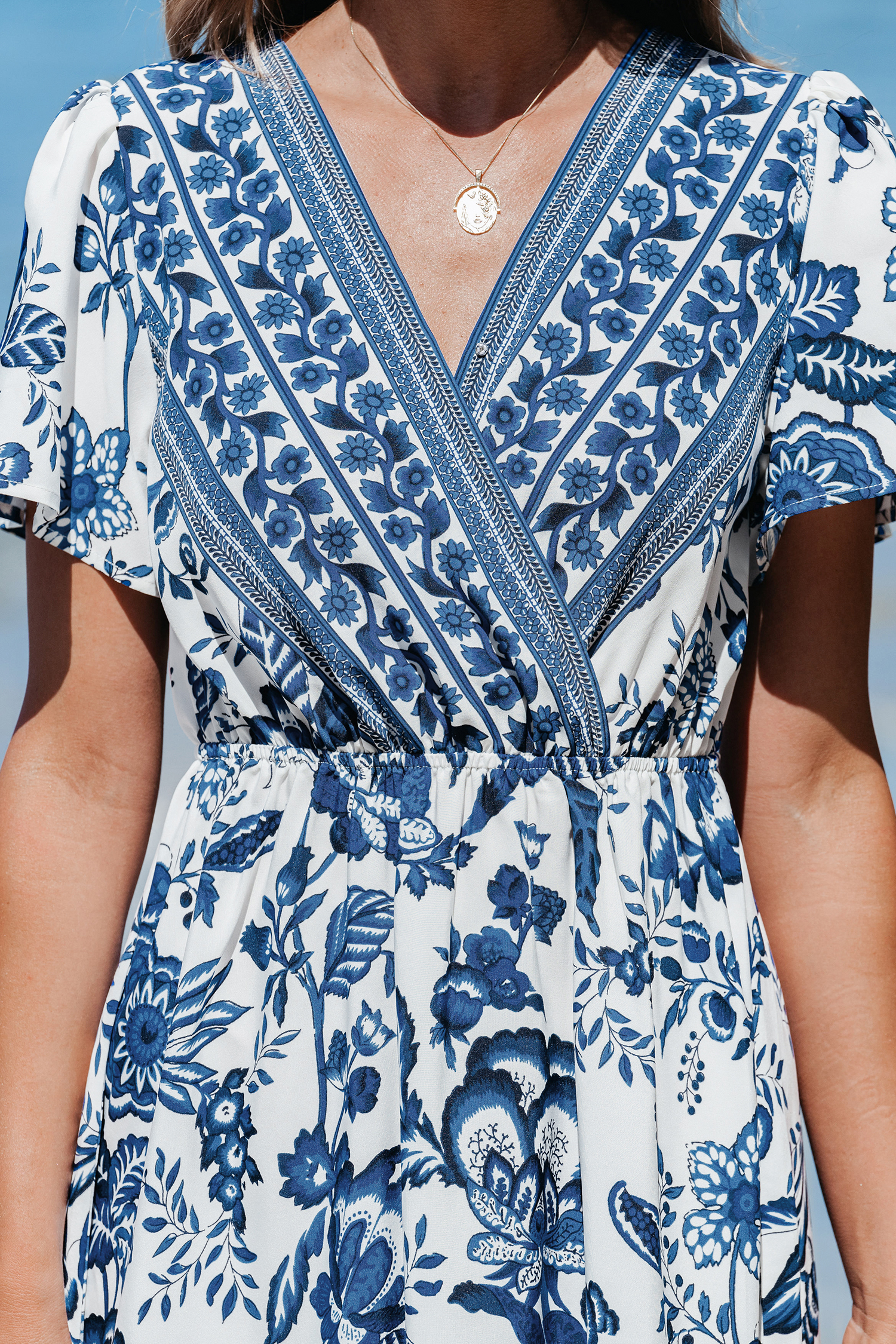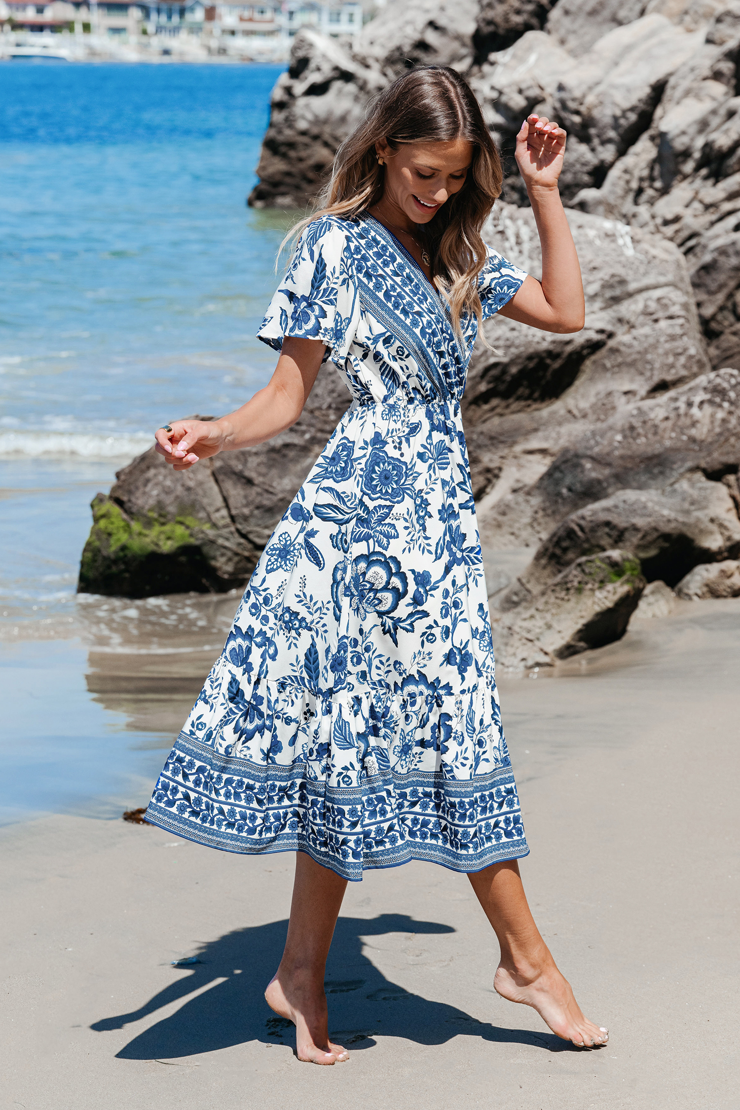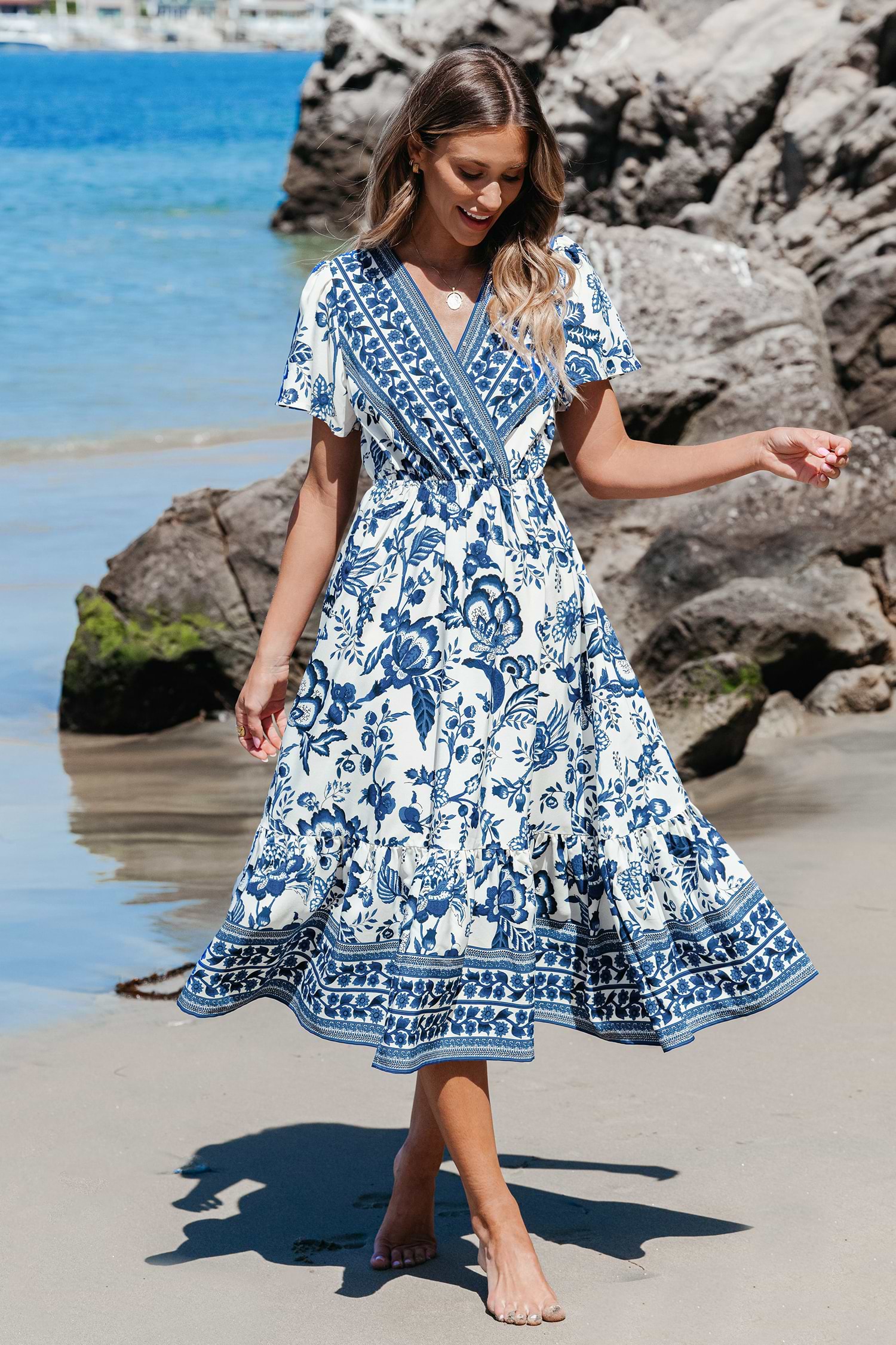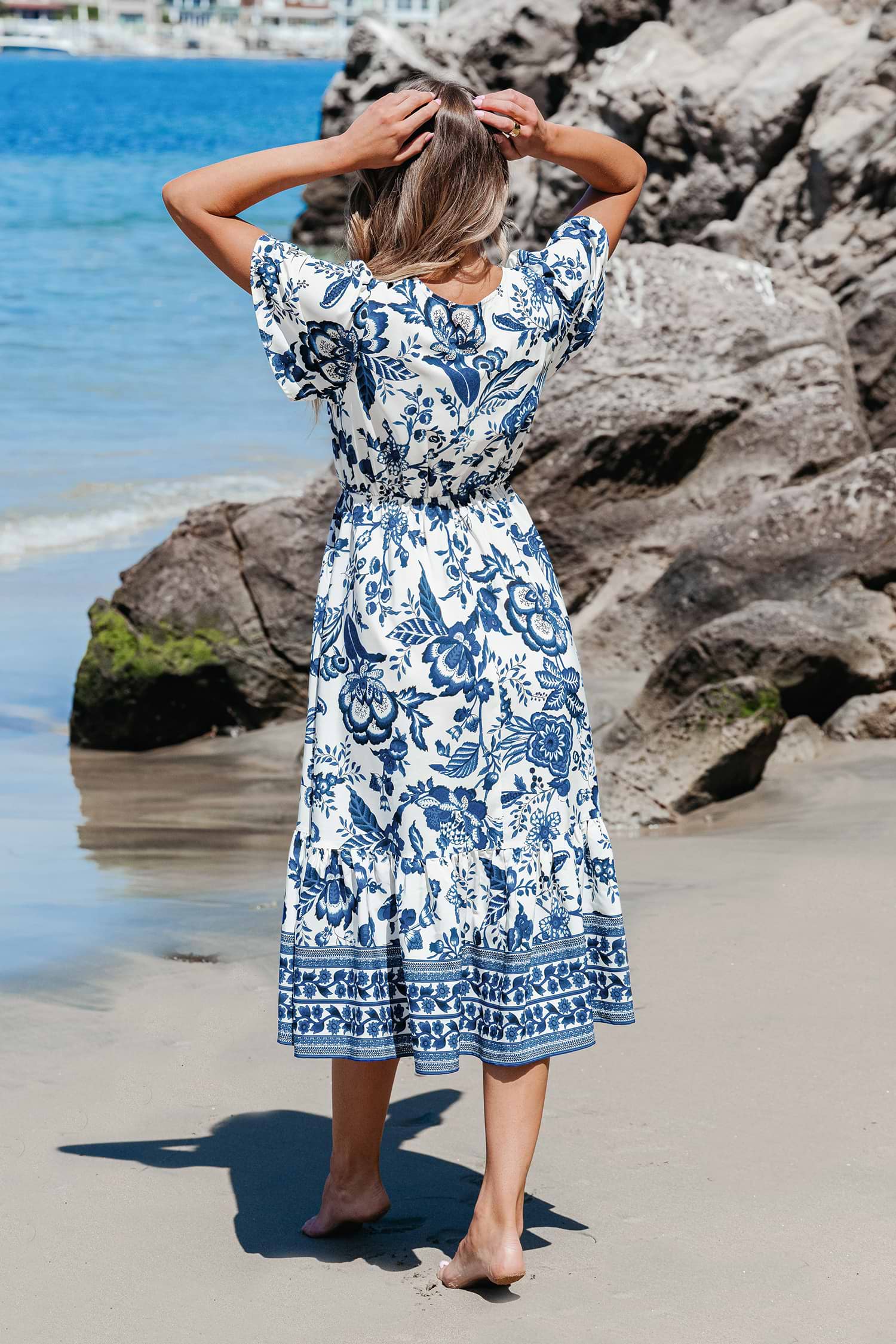 Vestido midi con volantes y sobrepelliz con estampado floral