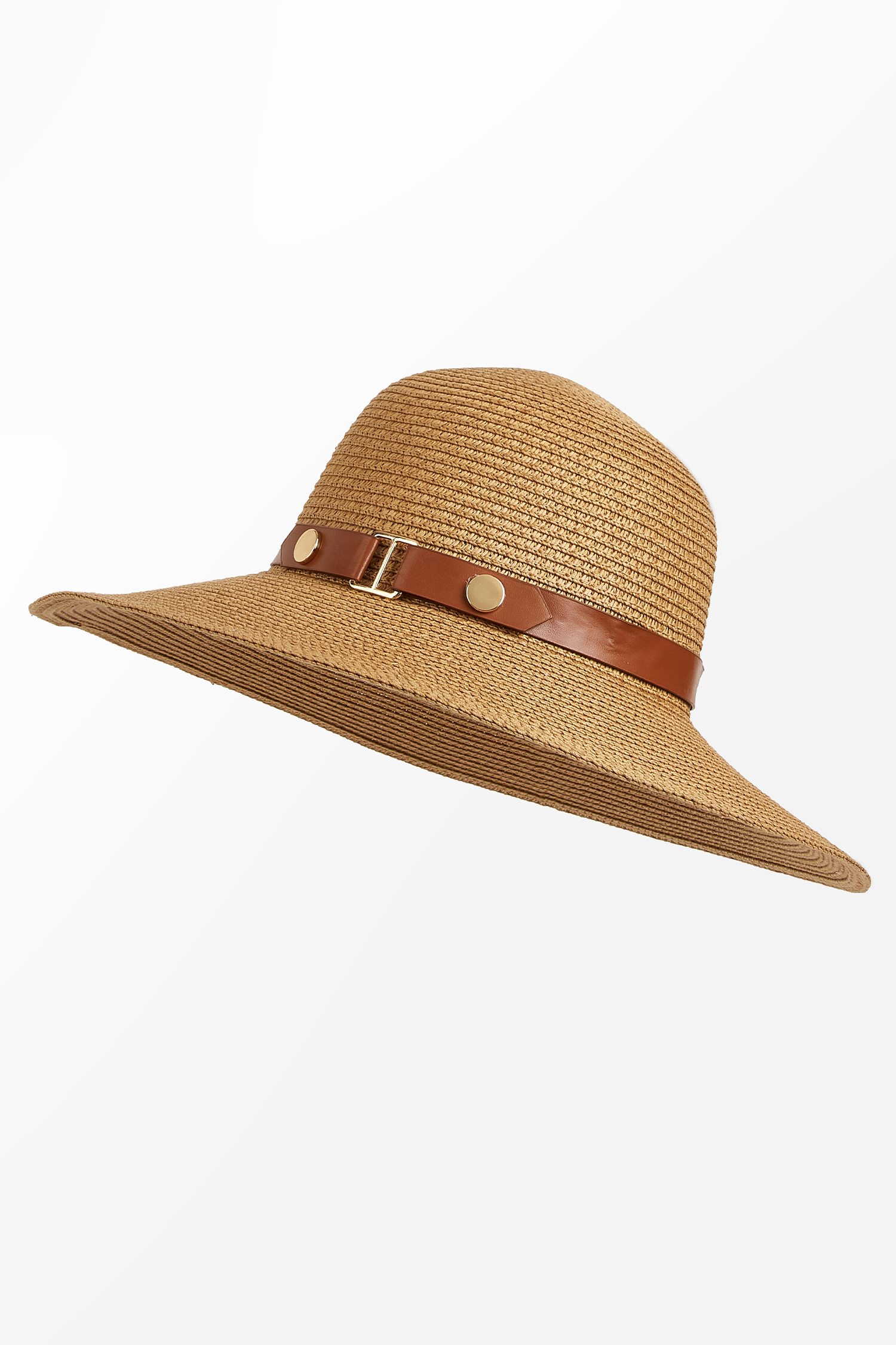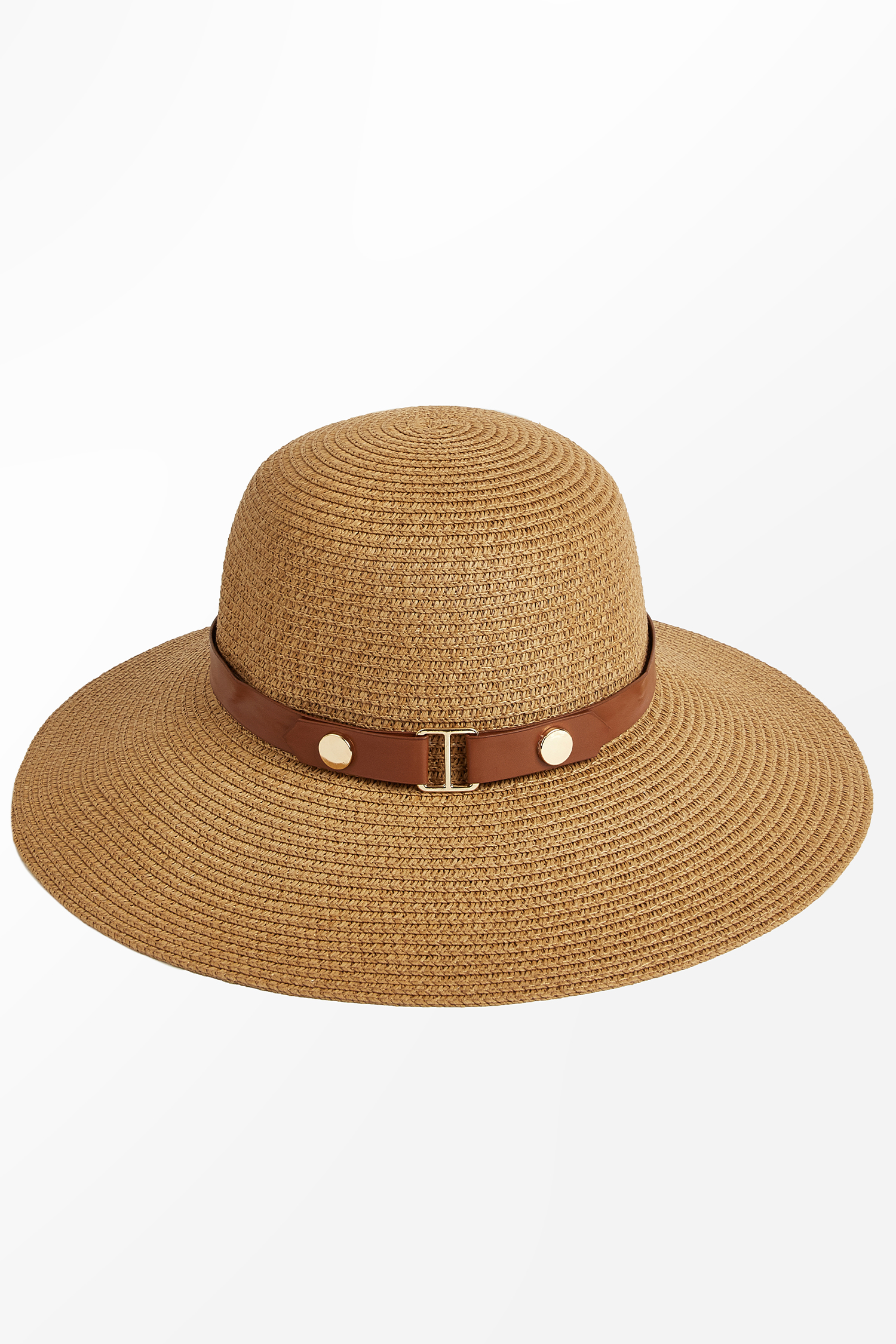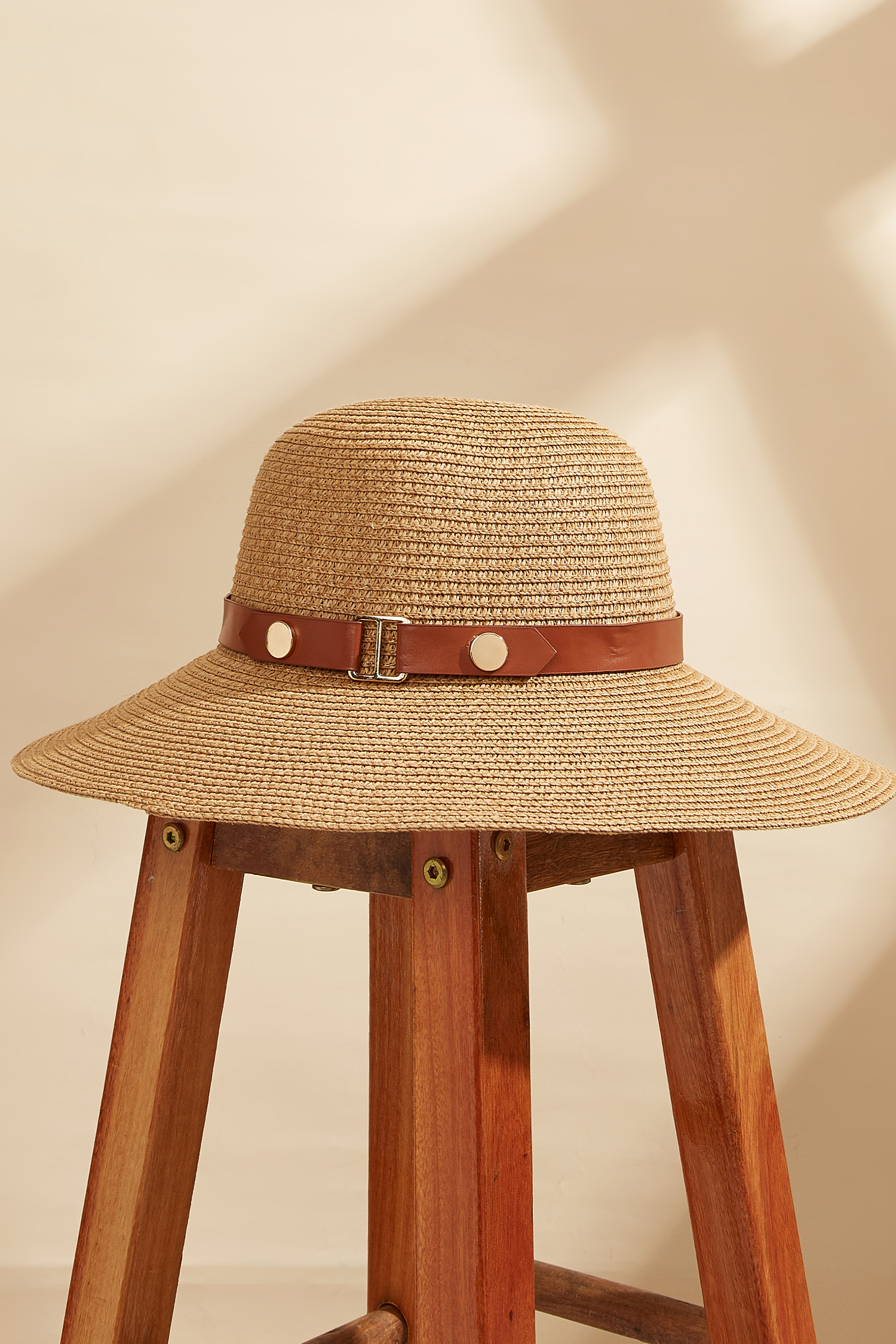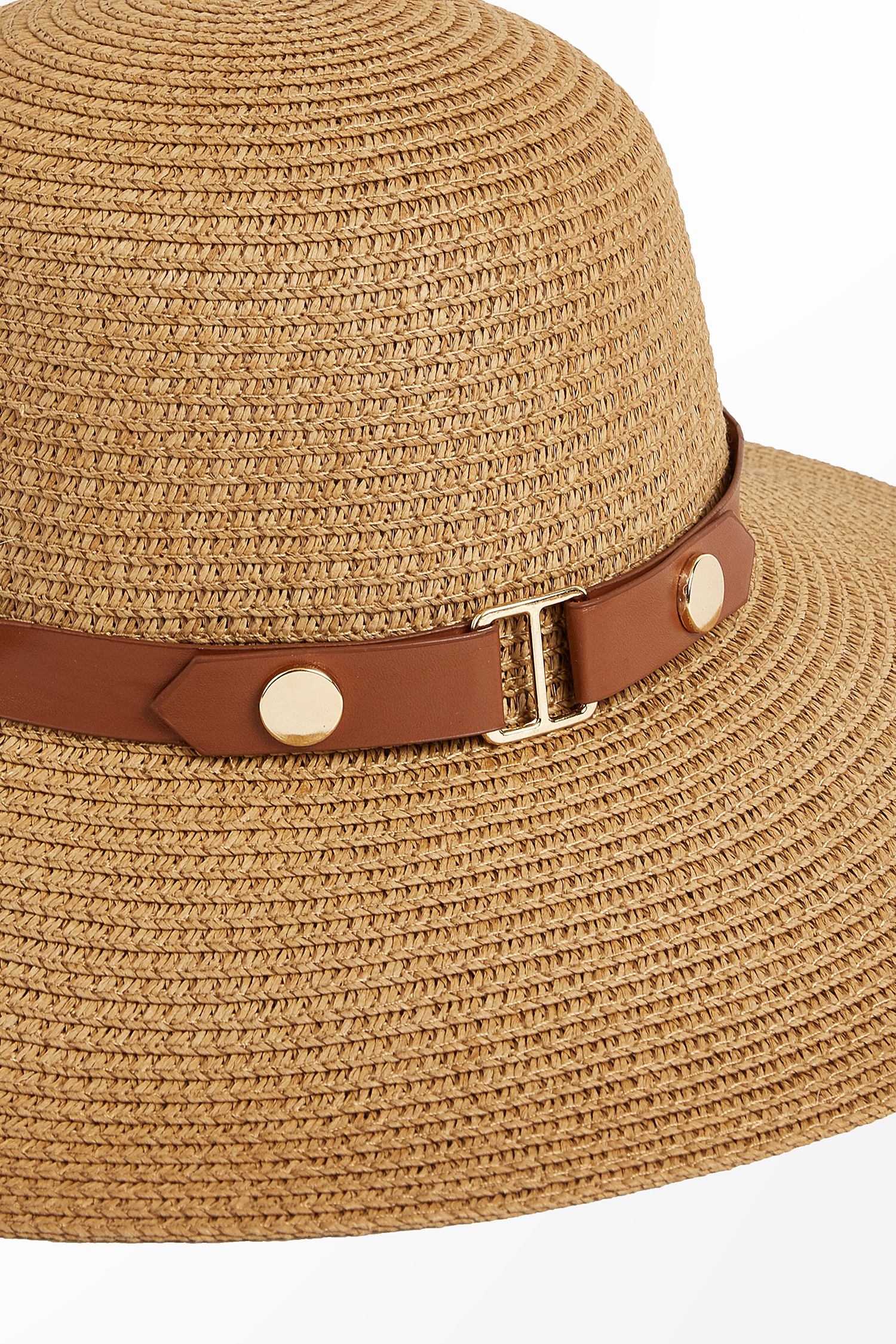Sombrero de paja de ala ancha en piel sintética y tono dorado