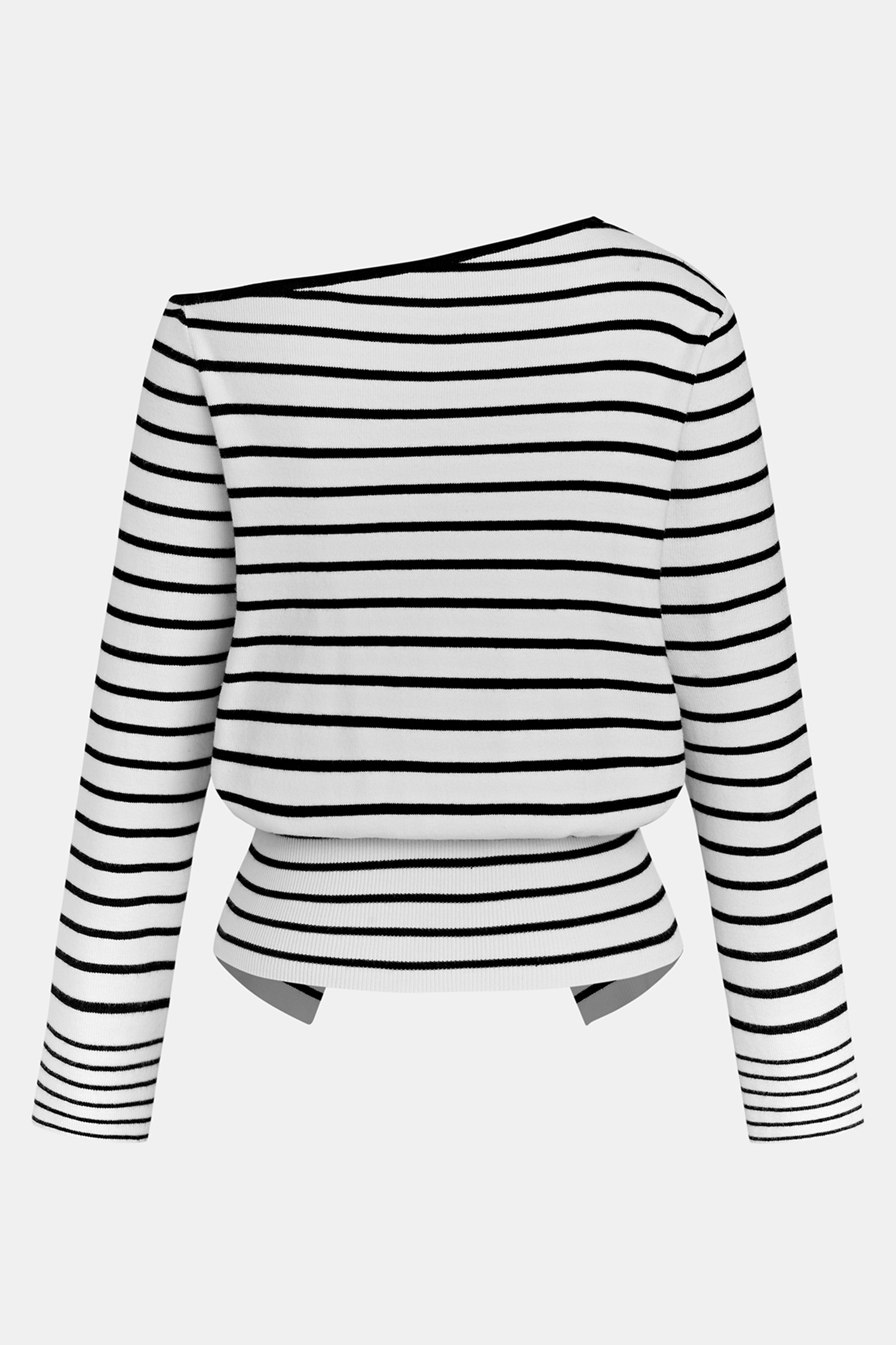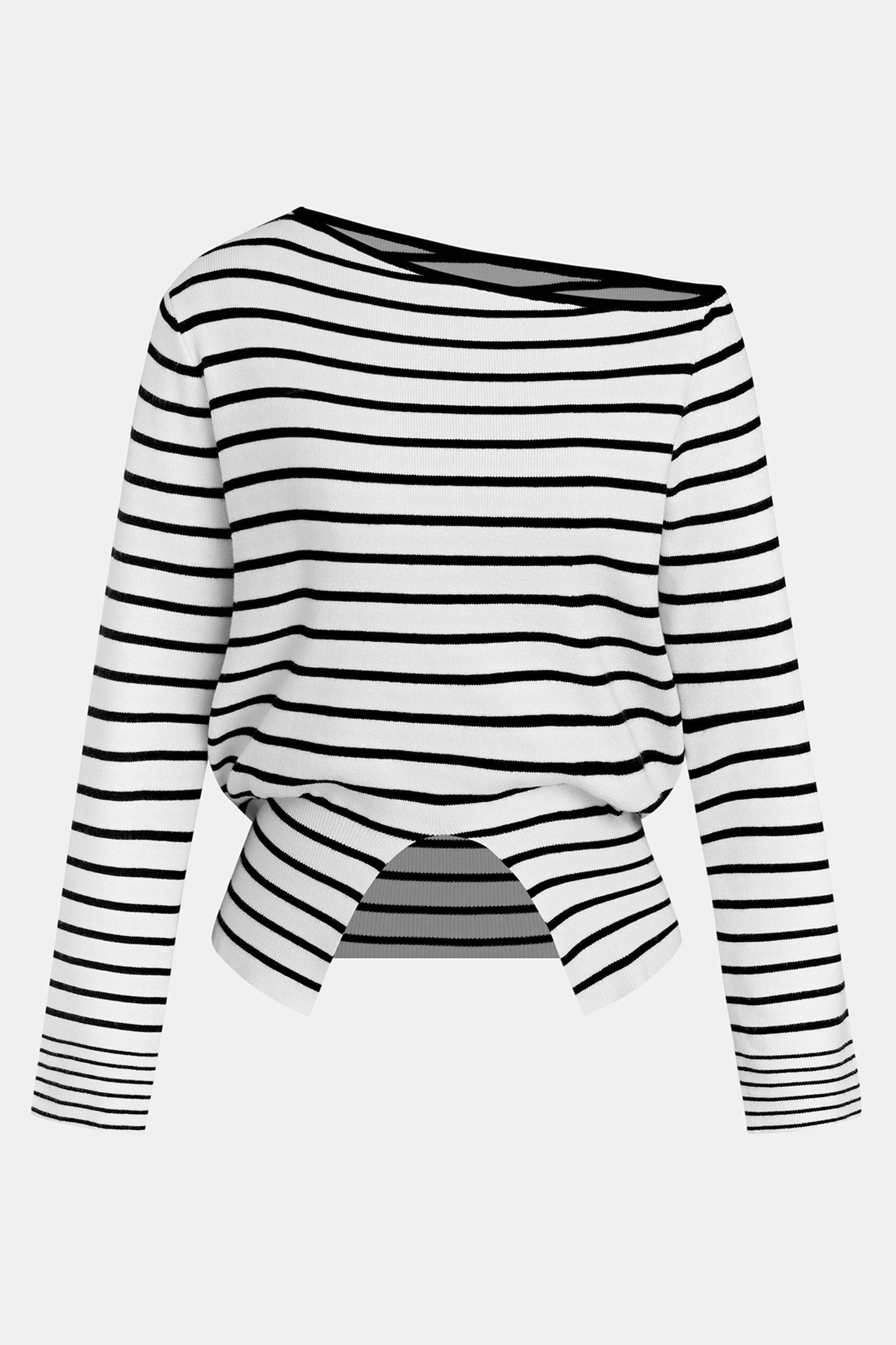 El suéter de rayas Good Angle es perfecto para esos momentos en los que quieres destacar sin esforzarte demasiado. Su escote asimétrico, mangas largas y bajo con abertura completan el look.