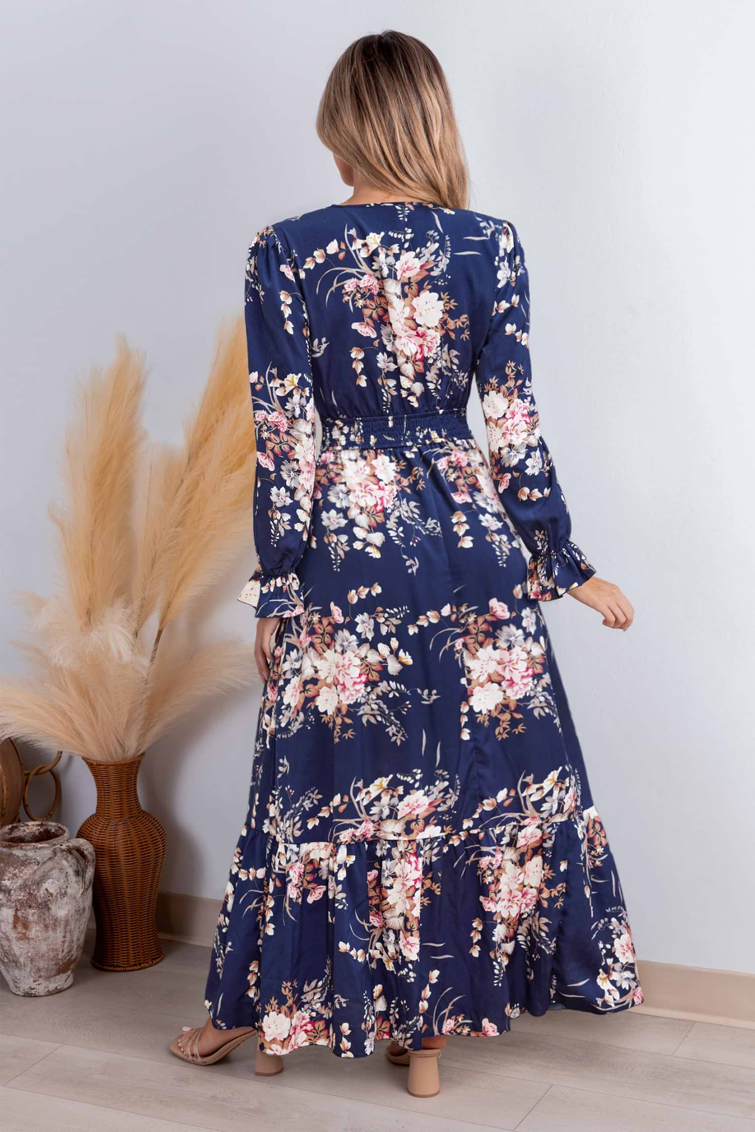 El vestido maxi floral "Good Day Ahead" aporta una energía alegre y coqueta con un corte desenfadado y fresco. El escote cruzado, las mangas largas y la cintura fruncida crean una silueta favorecedora, mientras que el largo maxi aporta movimiento.