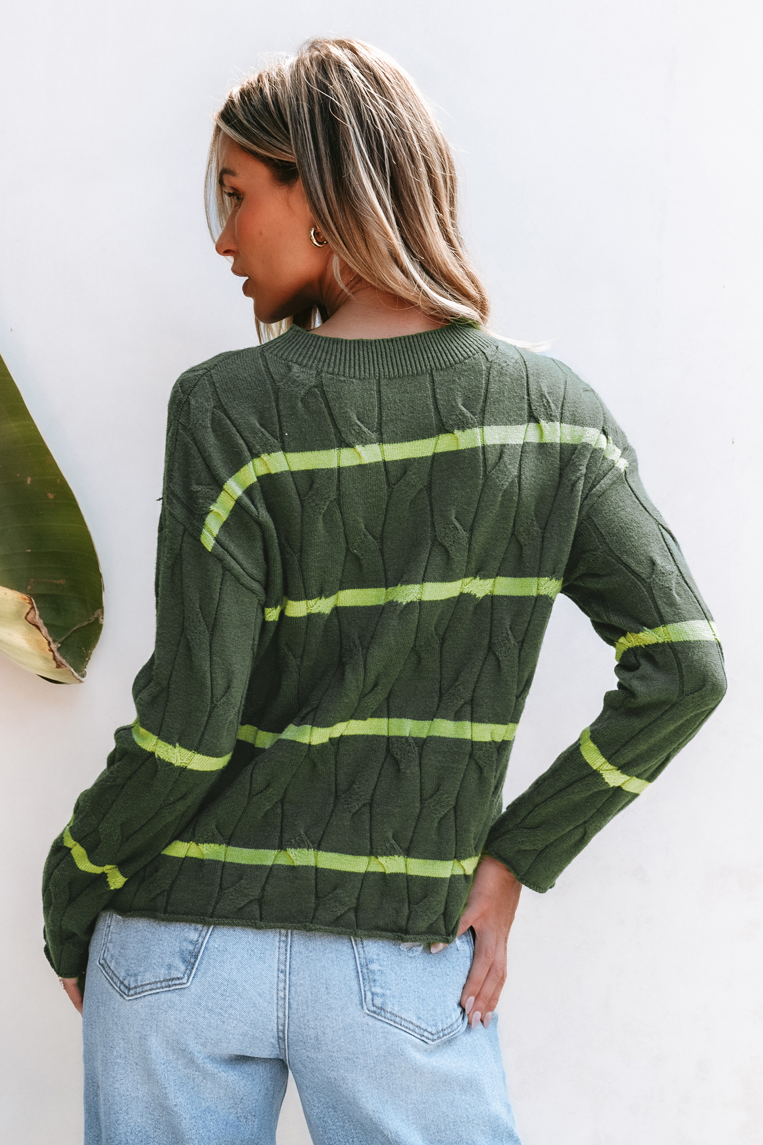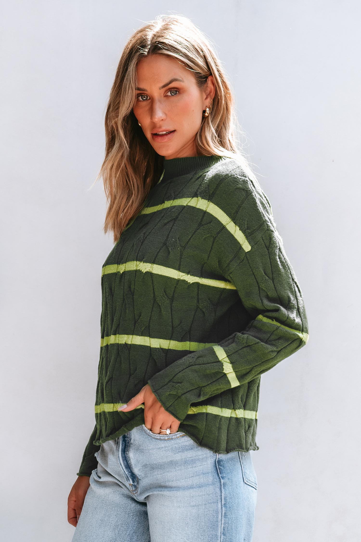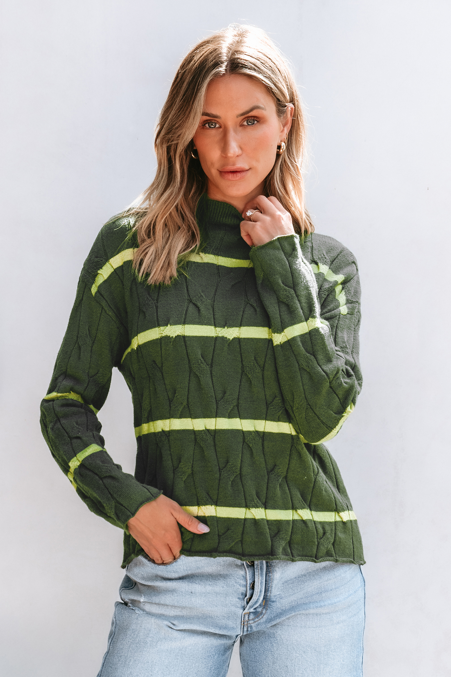 ¿Cansada de los suéteres básicos? El suéter de cuello alto de punto trenzado con rayas verdes combina texturas y colores de una manera fresca. ¿Quién hubiera pensado que mantenerse abrigado podía verse tan bien?