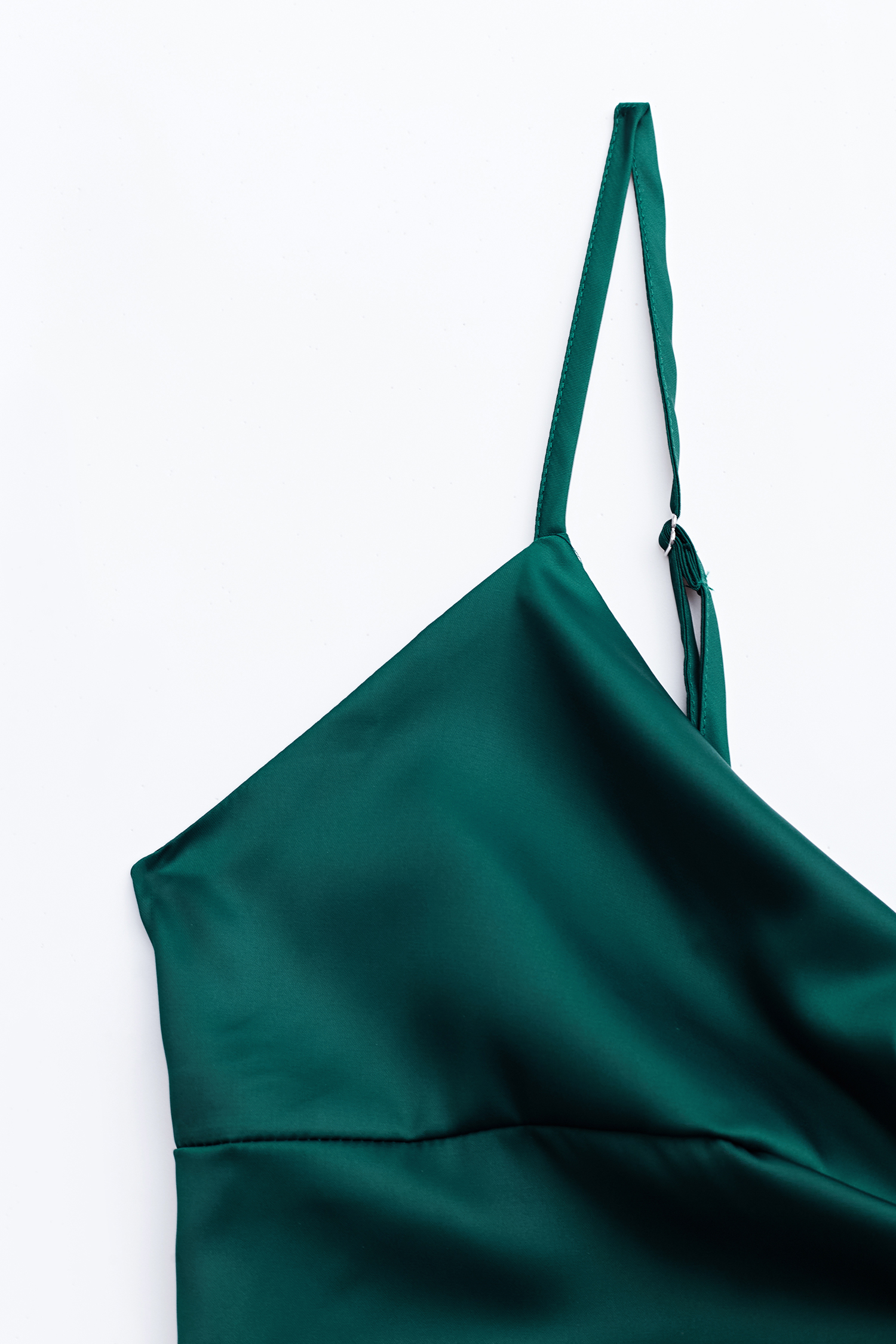 Vestido largo con escote en forma de corazón y abertura en forma de cerradura de satén verde