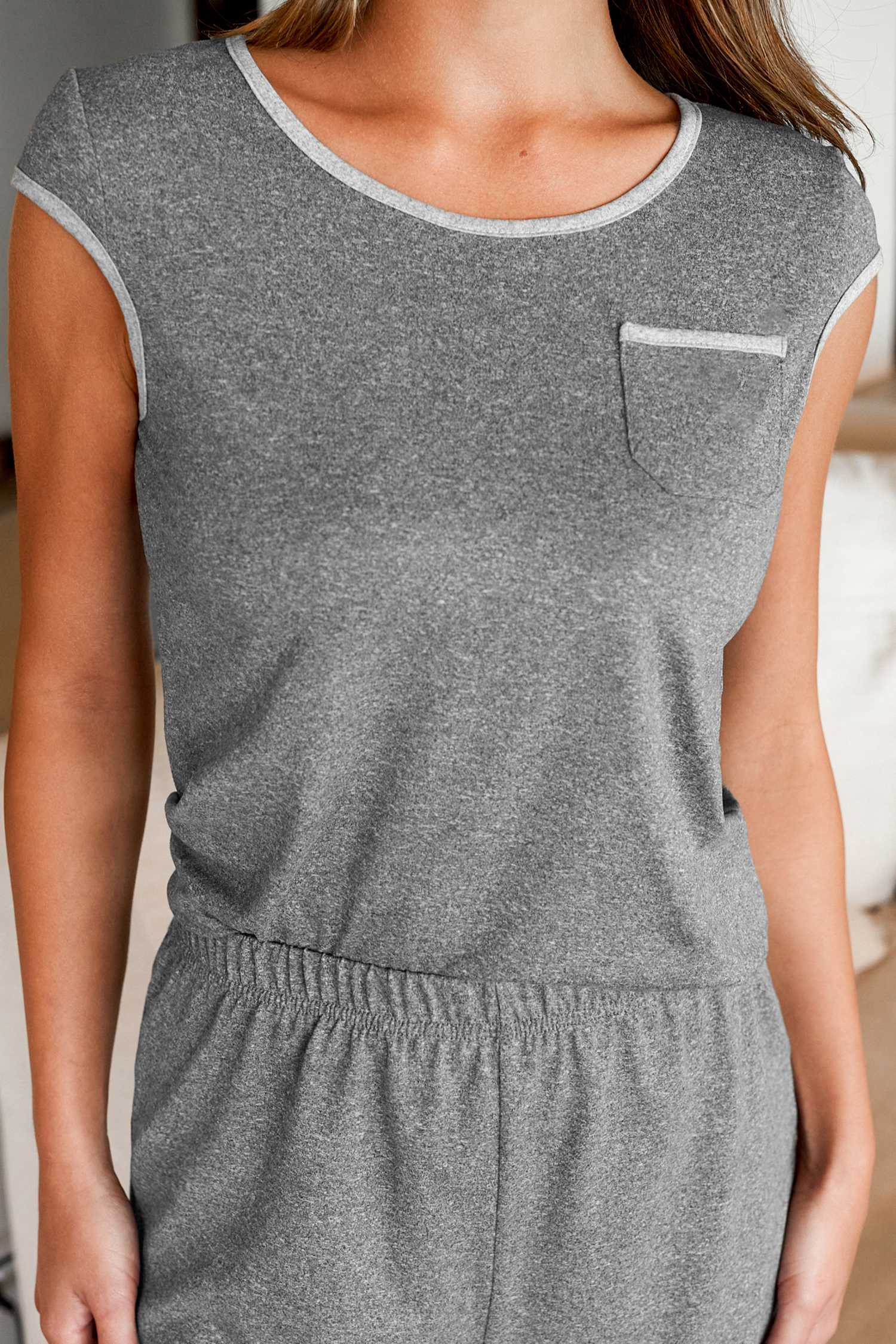 Conjunto de pijama gris con camiseta con cuello redondo y pantalones cortos