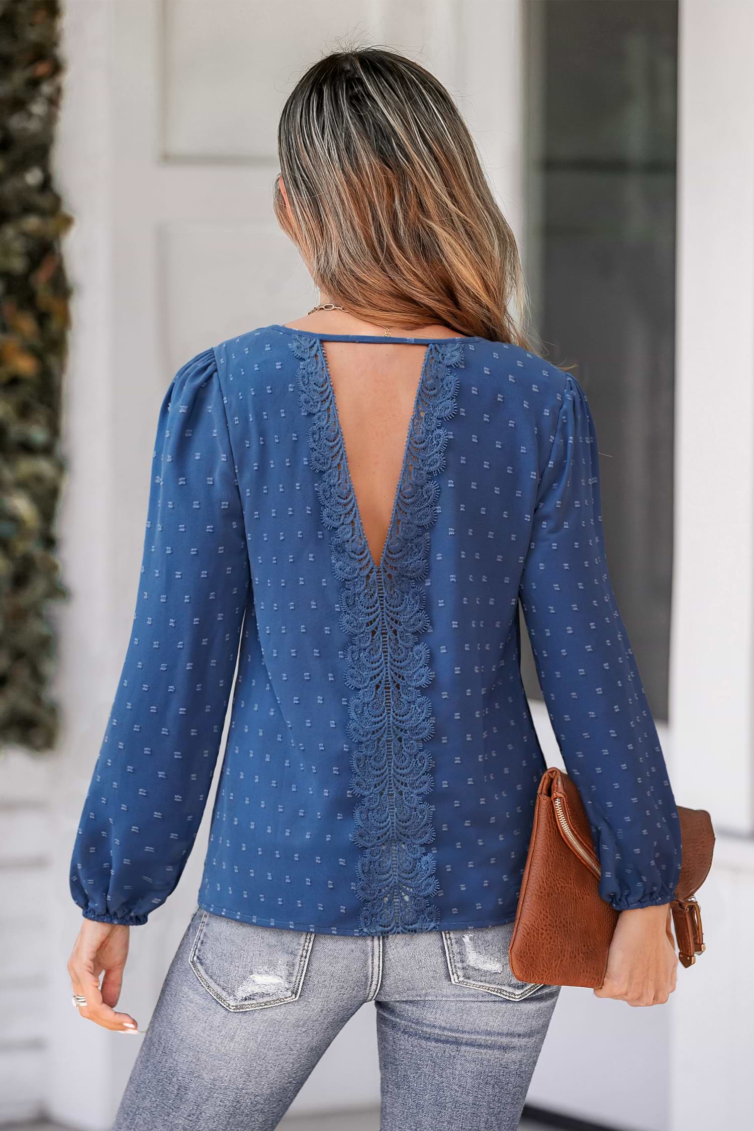 El top azul claro Guiding aporta una energía segura y atemporal a cualquier look. Su escote en V y mangas largas se combinan con detalles de encaje en contraste para un look sofisticado y femenino.