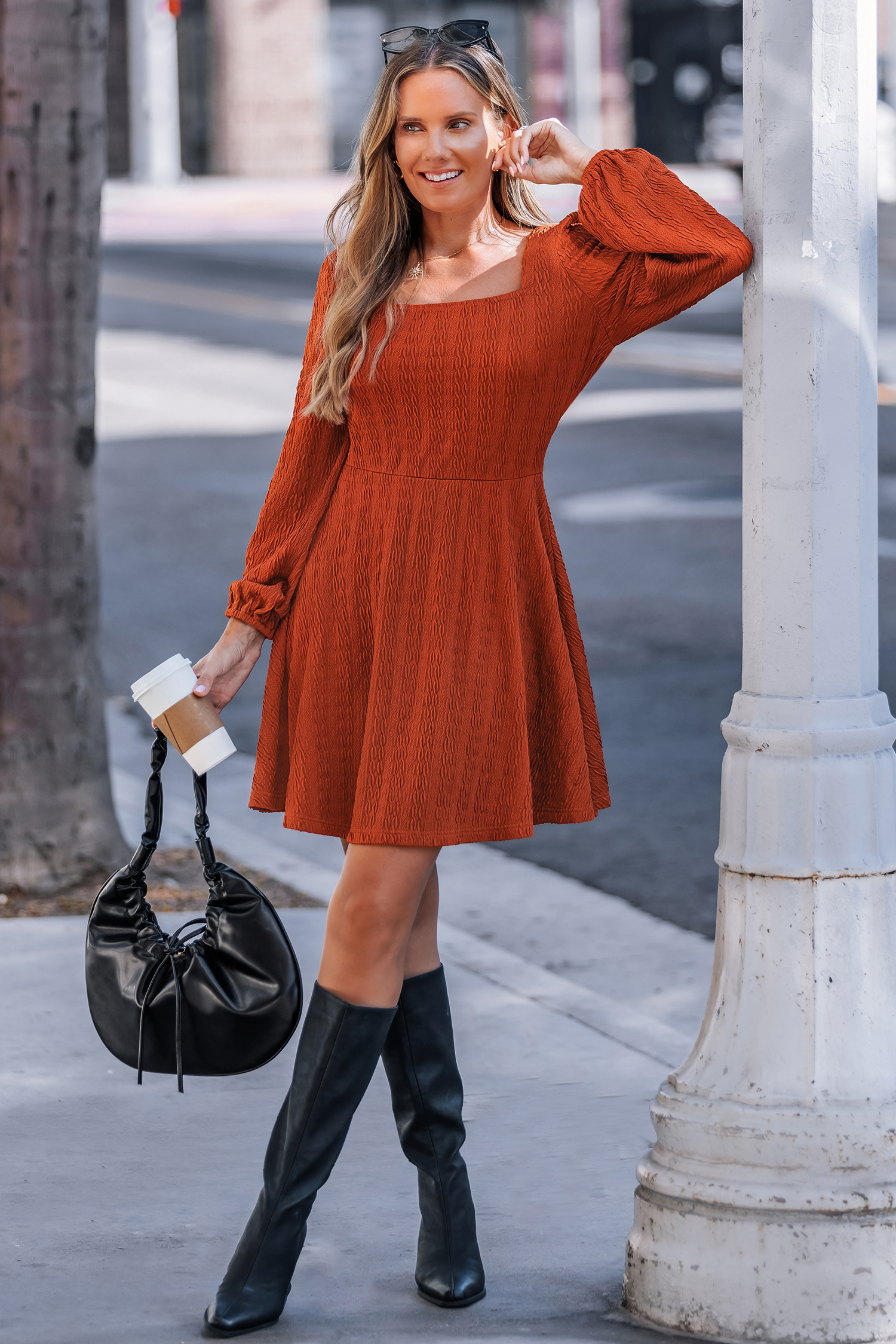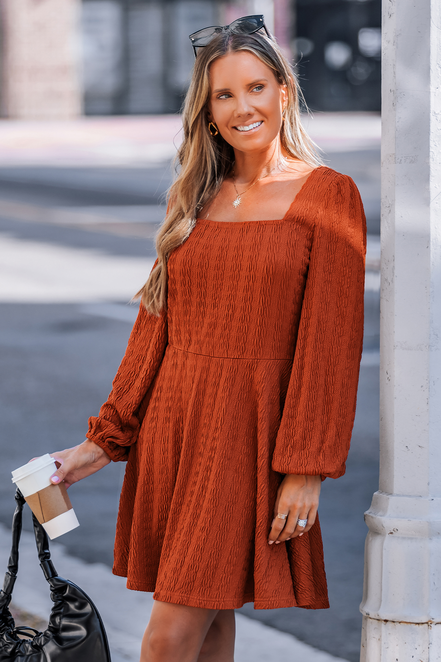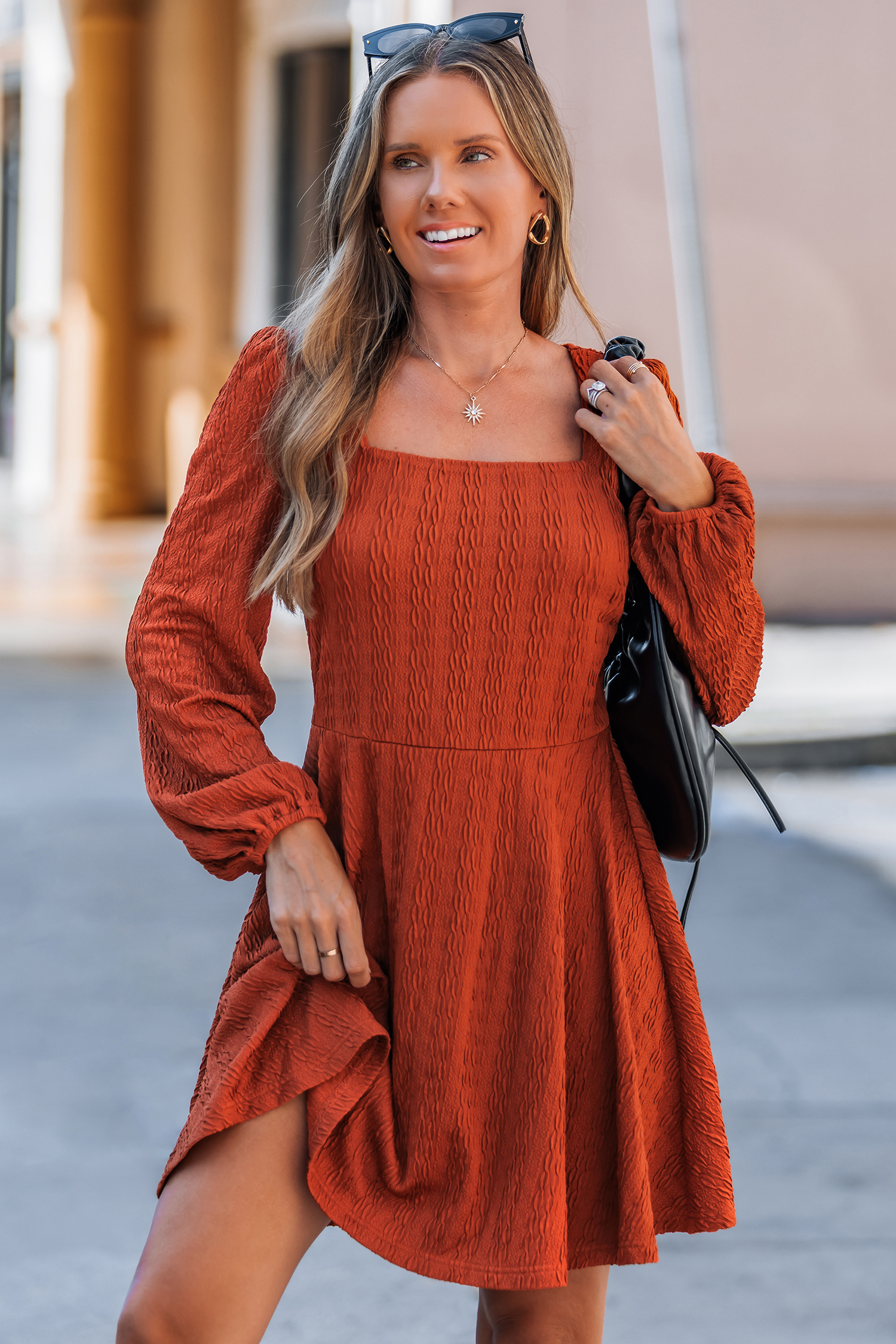 El minivestido naranja Hayride es divertido, coqueto y rebosa energía otoñal. Su escote cuadrado, mangas largas y largo mini lo hacen perfecto para días de temporada y noches acogedoras.
