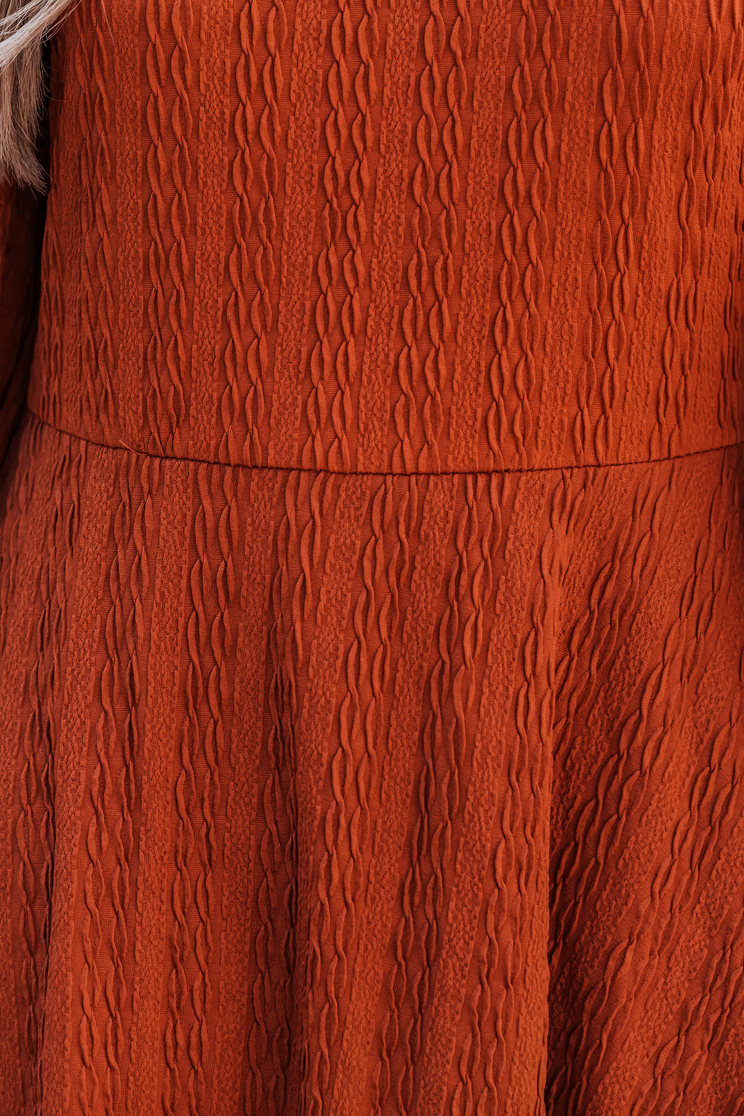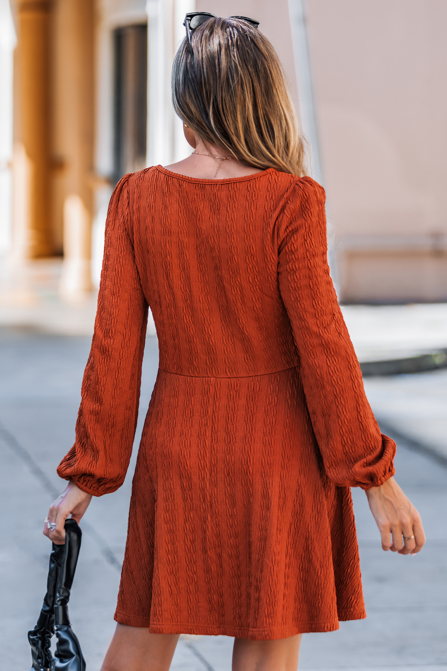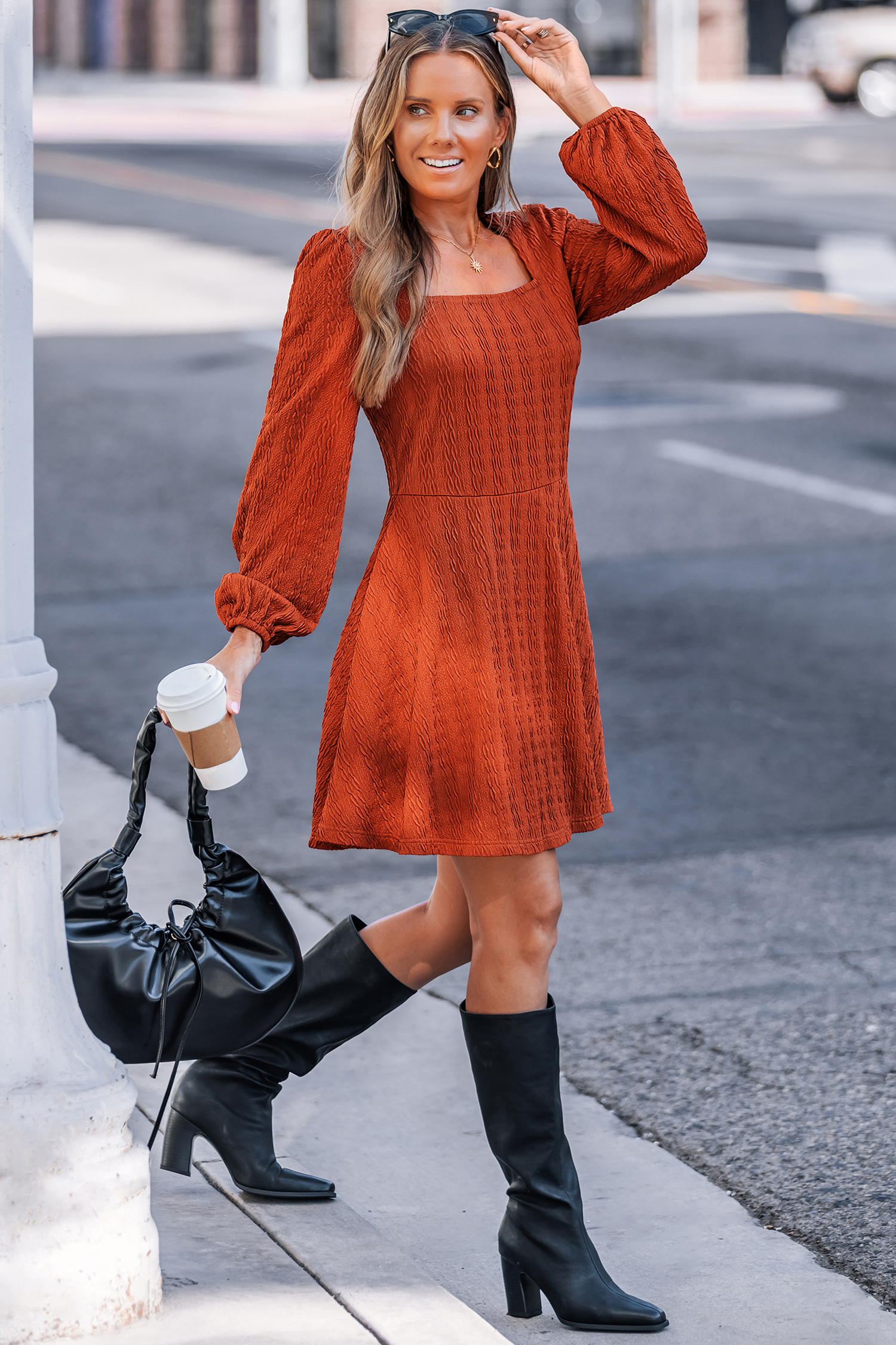 El minivestido naranja Hayride es divertido, coqueto y rebosa energía otoñal. Su escote cuadrado, mangas largas y largo mini lo hacen perfecto para días de temporada y noches acogedoras.