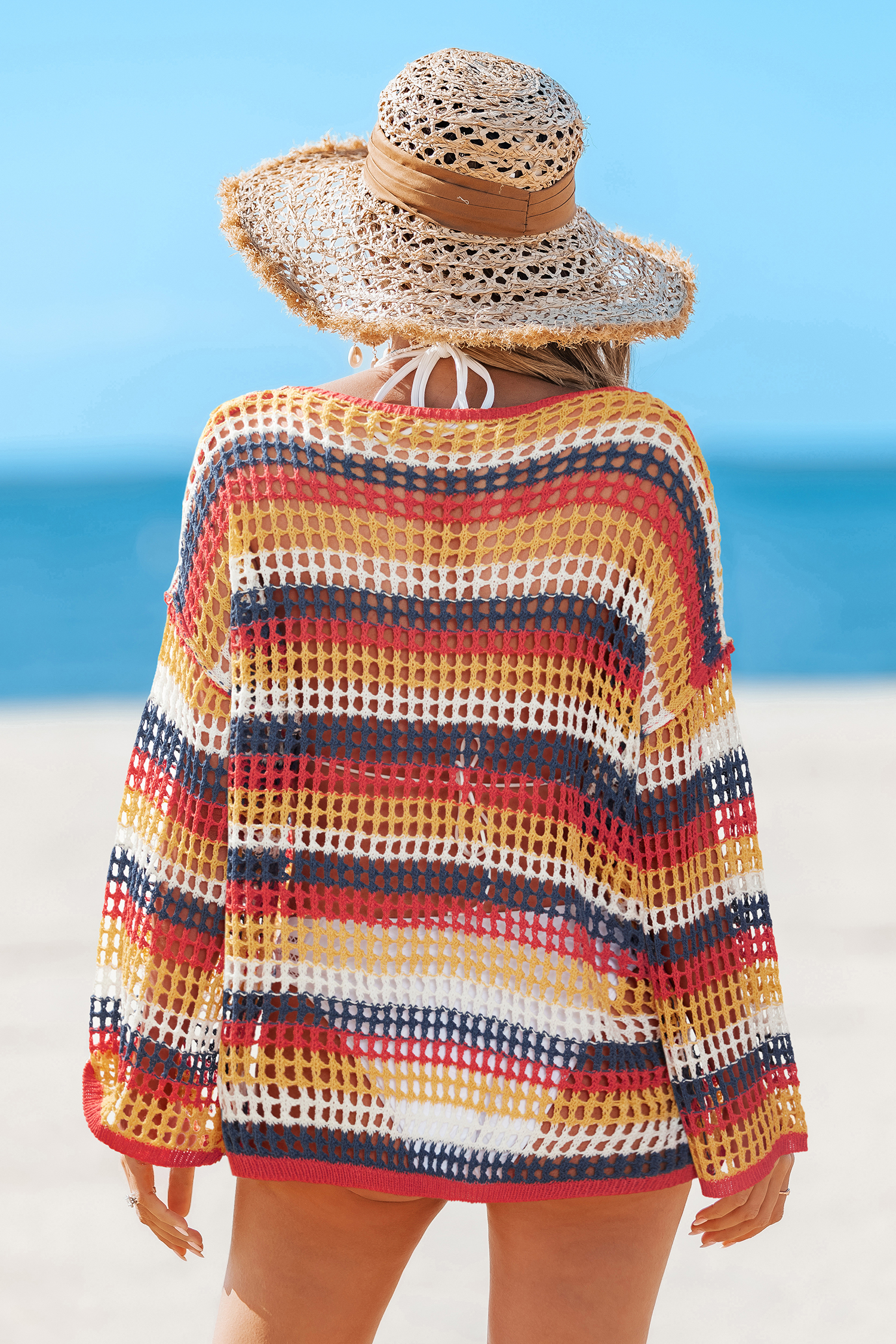 El top de rayas Honey Sunset aporta energía a tus días de playa y más. Su escote redondo y mangas largas le dan ese toque relajado y perfecto para la playa o para el atardecer.