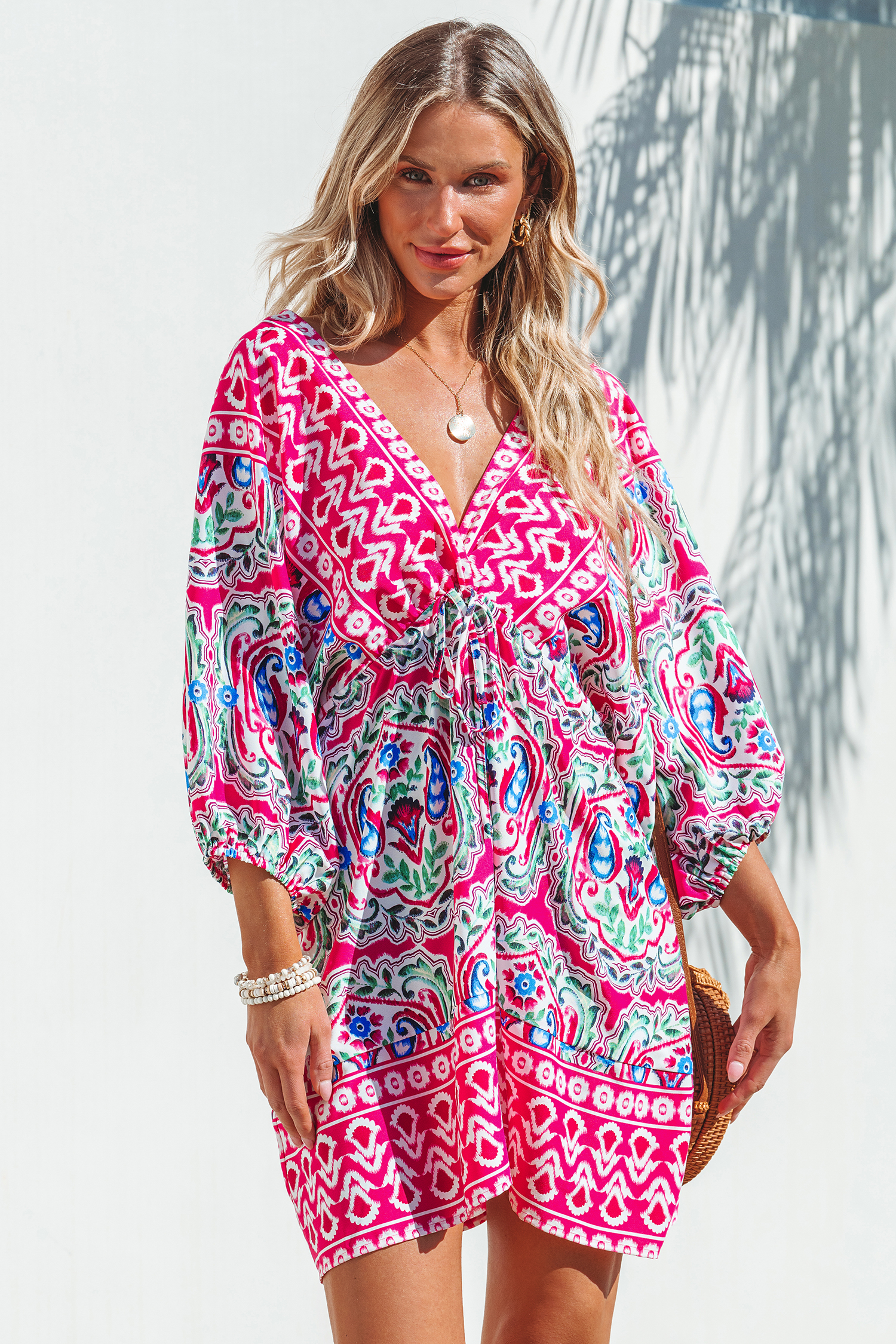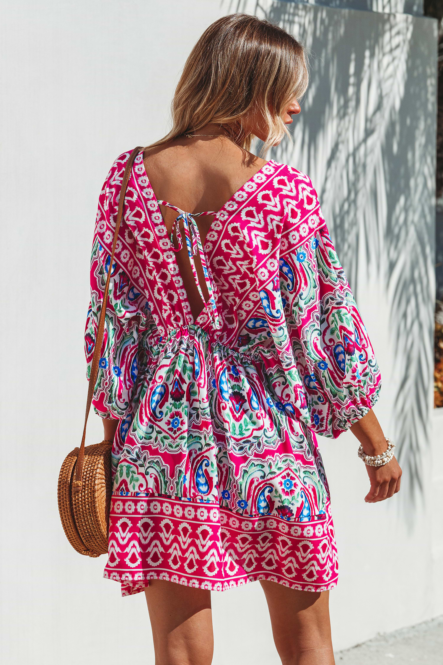 Minivestido con mangas abullonadas y estampado geométrico rosa