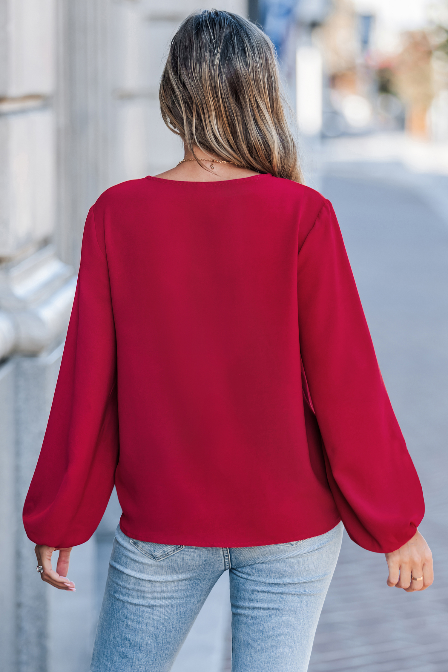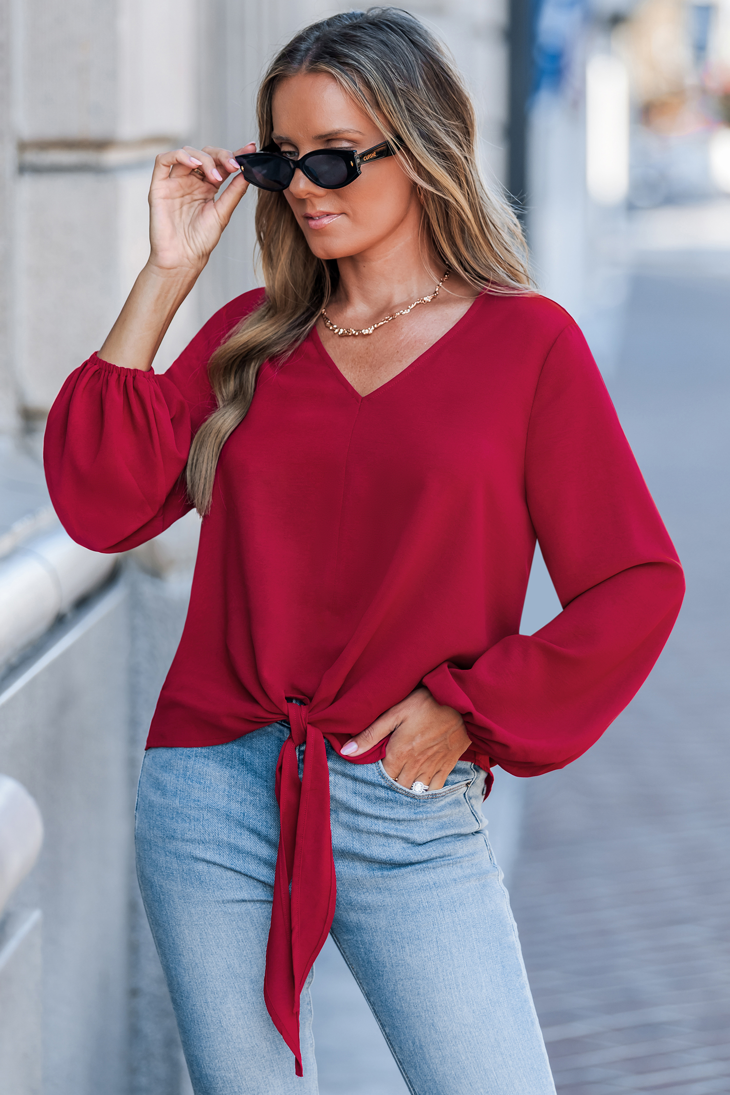 El top rojo Hot Takes es atrevido, coqueto y lleno de energía. Su escote en V, lazada frontal y mangas largas lo hacen perfecto para darle un toque de energía a tu día.