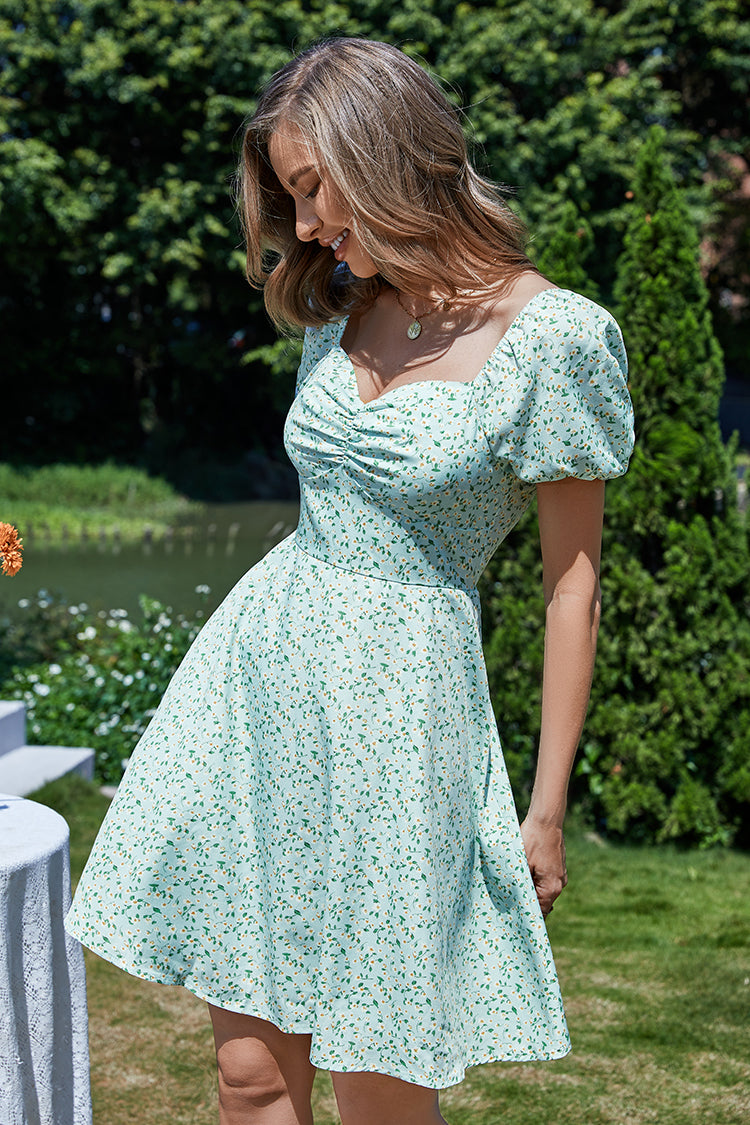 Ilaria Vestido fruncido en forma de A con escote cuadrado y mangas abullonadas