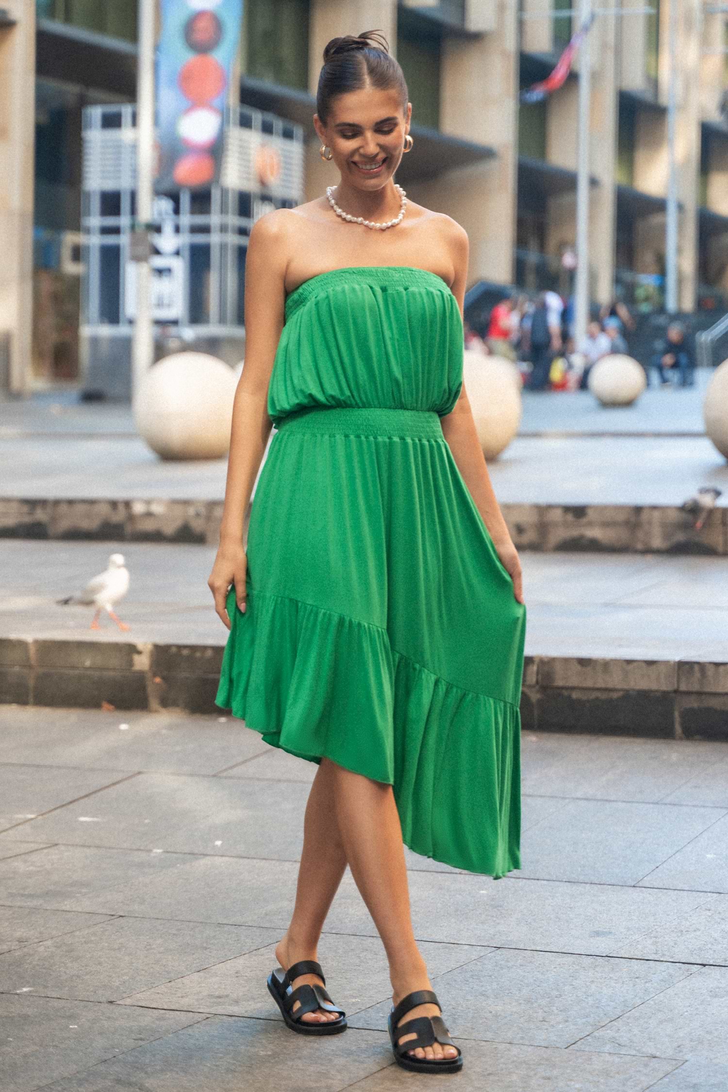 Vestido tubo con dobladillo con volante asimétrico en verde Kelly